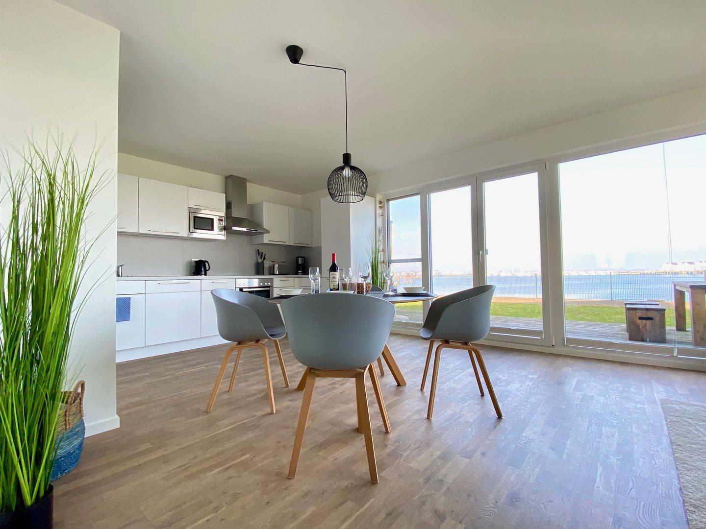 Willkommen in der Ferienwohnung "Pier 21" mit Meerblick in Olpenitz! Die Ferienwohnung bietet einen offenen Wohn- und Essbereich mit voll ausgestatteter Küche und eine Terrasse. Die Schlafzimmer verfügen über ein Doppelbett und zwei Einzelbetten. Das Badezimmer bietet eine Whirlwanne und eine Infrarotsauna! Die Terrasse lädt zu gemütlichen Sommerabenden an der frischen Ostseeluft ein. Ein Außenstellplatz ist vorhanden. Deine Vierbeiner können gerne mitreisen!