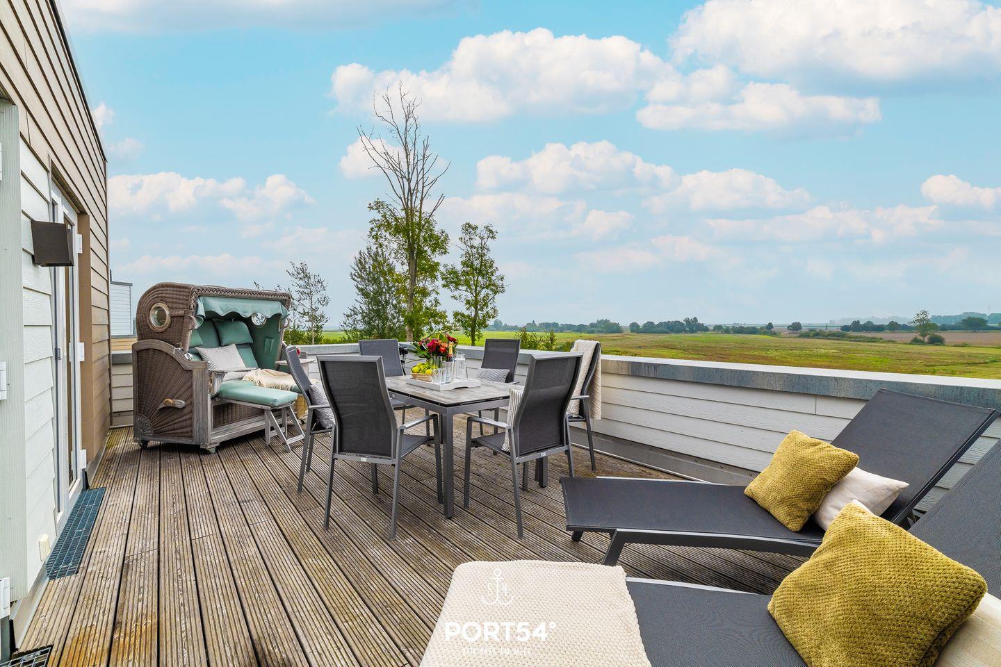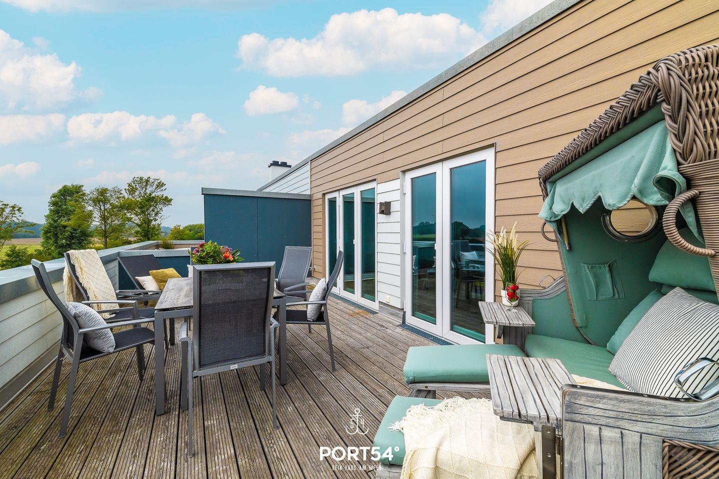 Ein weiteres Highlight der Wohnung ist die Dachterrasse mit Gartenmöbeln und einem Elektro-Grill. Laue Sommerabende kannst Du in geselliger Runde auf der Terrasse genießen.