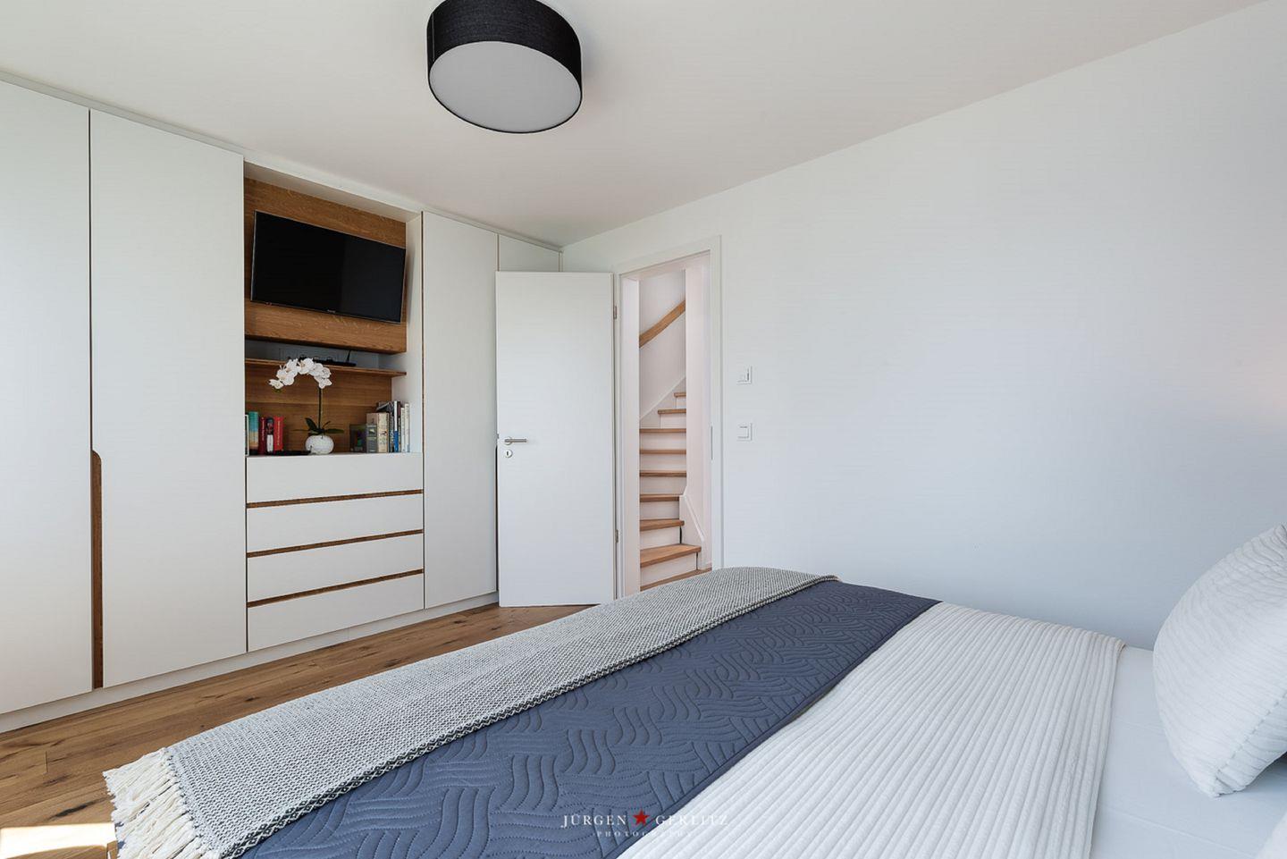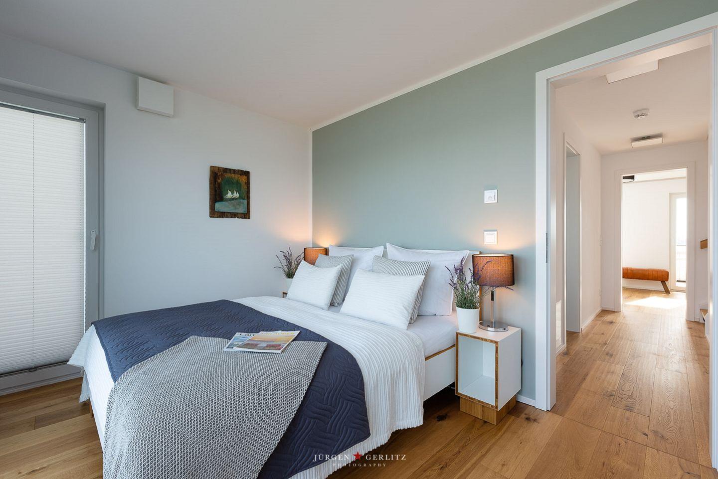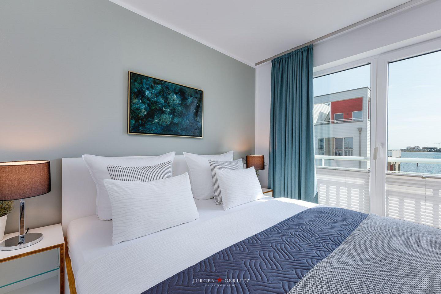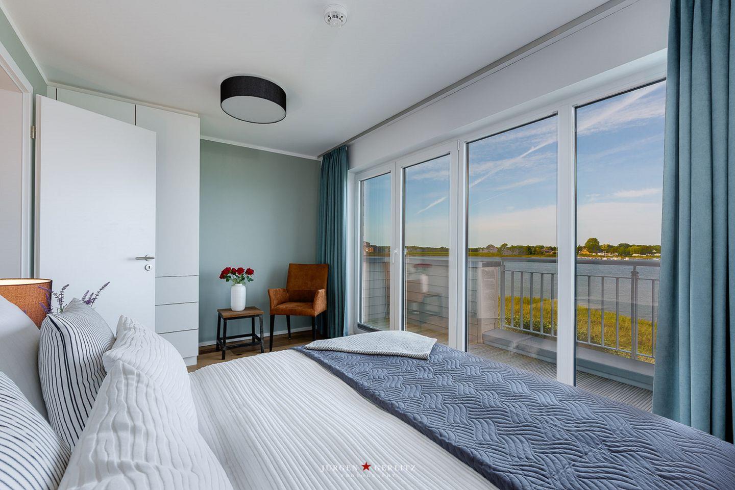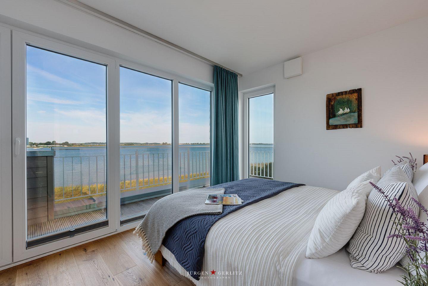 Die Schlafzimmer im 1. Obergeschoss bieten Dir zwei gemütliche Doppelbetten (180 x 200 cm und 160 x 200 cm) sowie Verdunkelungsmöglichkeiten für erholsame Urlaubsnächte. Das Schlafzimmer zur Wasserseite verfügt über einen Balkon mit einem atemberaubenden Blick auf die Schlei, während Du in dem anderen Schlafzimmer mit Flachbild-TV den Ausblick auf den Hafen in Olpenitz genießen kannst.