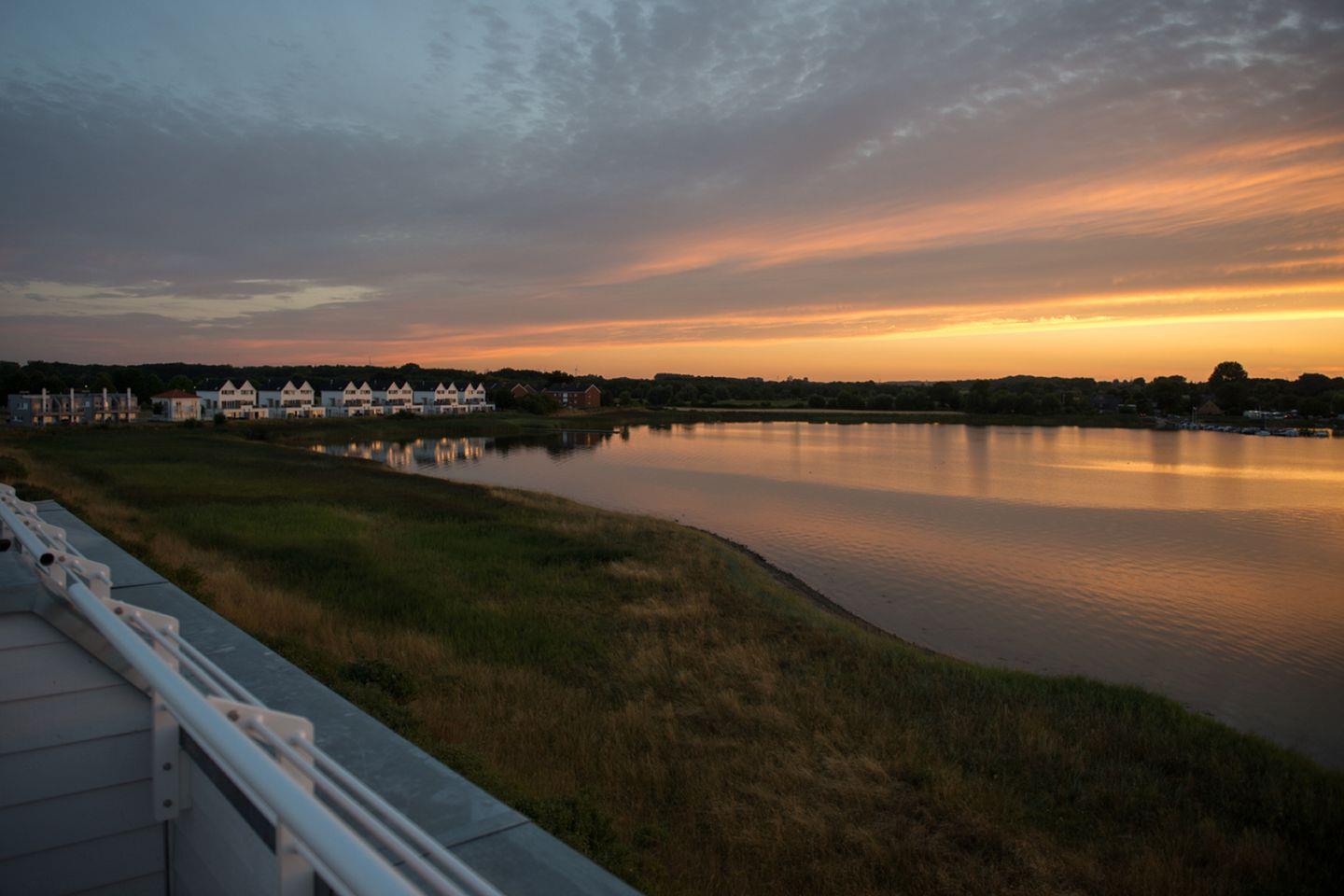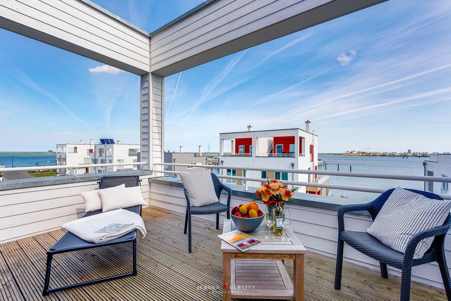 Das absolute Highlight befindet sich ebenfalls im 2. Obergeschoss – die Dachterrasse mit faszinierendem Ausblick über den Hafen, die Schlei und die Ostsee. Hier kannst Du in geselliger Runde die Sommerabende an der frischen Luft ausklingen lassen.