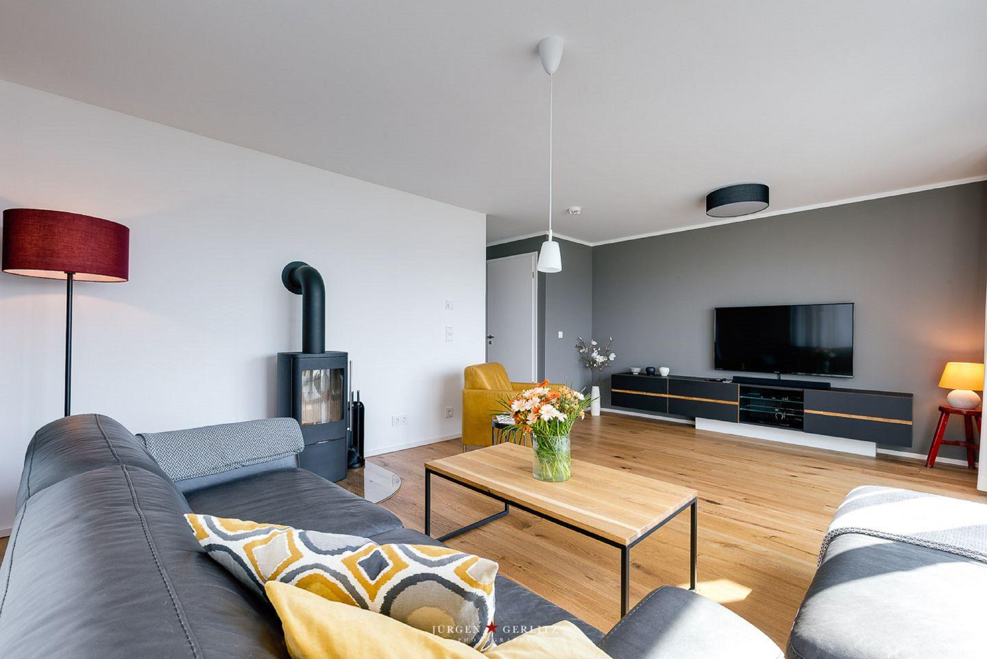 In dem im Erdgeschoss gelegenen, einladenden Wohn- und Essbereich kannst Du auf dem Sofa vor dem Flachbild-TV entspannen. An „Schietwetter“-Tagen sorgt der Kamin für eine gemütliche Atmosphäre und wohlige Wärme. Die angrenzende Terrasse bietet einen Strandkorb, von dem aus Du einen wunderschönen Blick auf die Schlei genießt – Urlaub pur!
