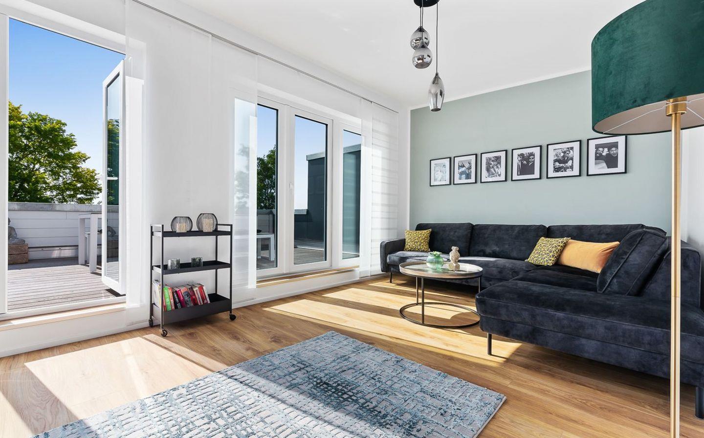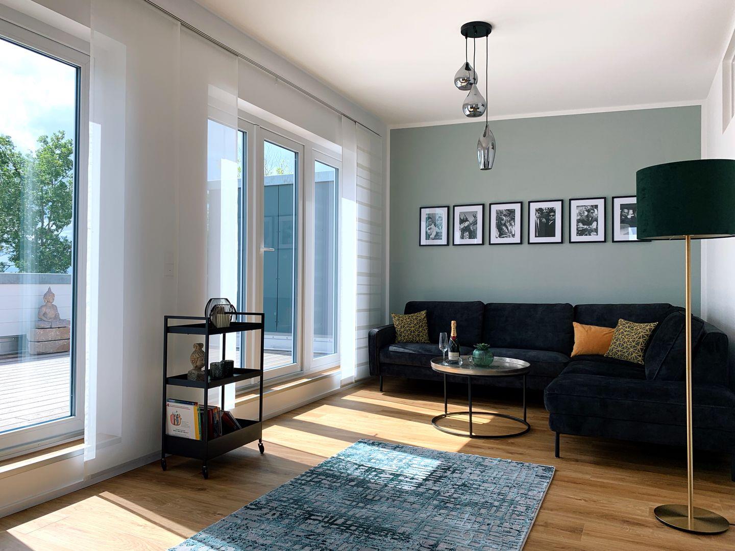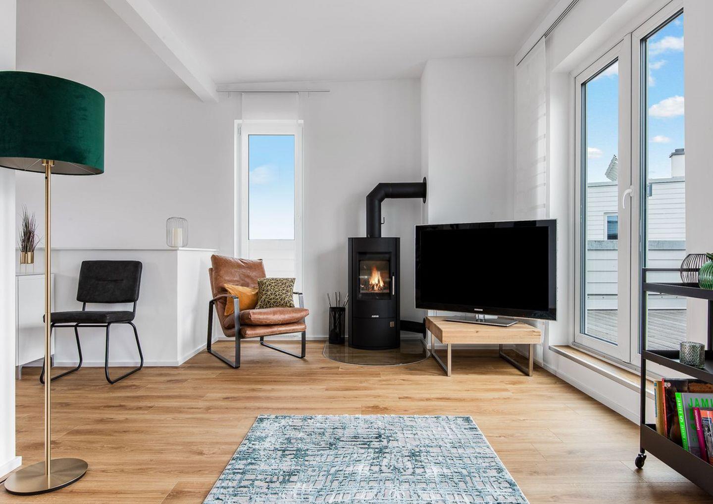 Der offene Wohnbereich ist hell, großzügig und hochwertig eingerichtet. Ein großes Samtsofa lädt zum Entspannen oder Fernsehen ein, während der Kaminofen an kühleren Tagen und Abenden für eine behagliche Atmosphäre sorgt.
