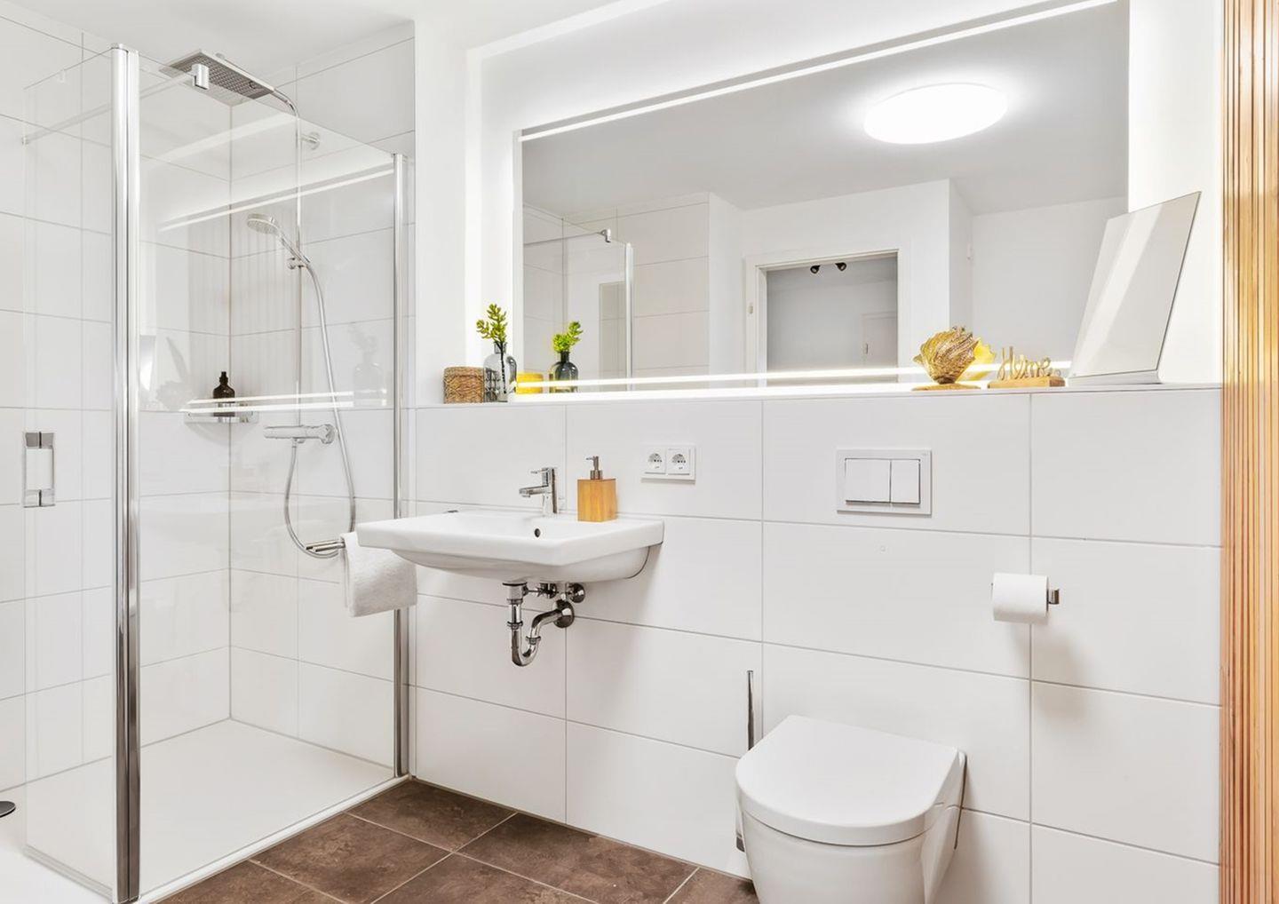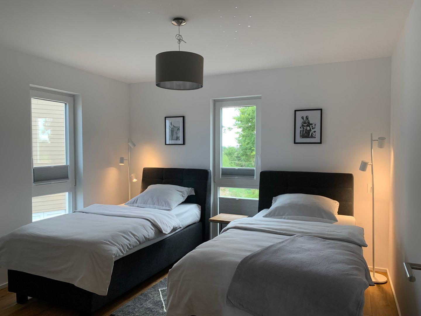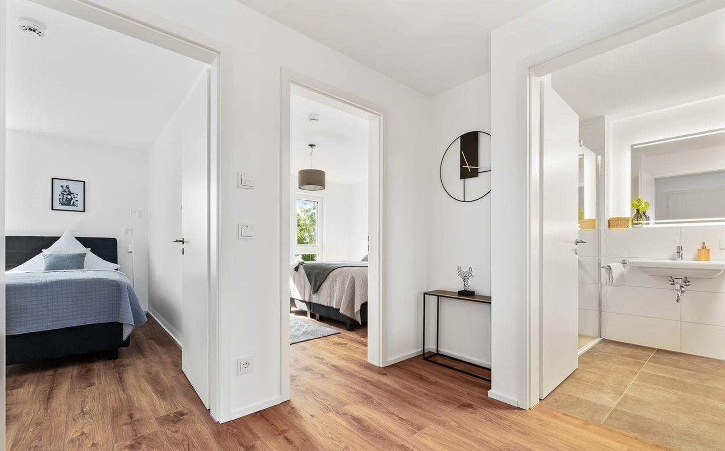Zwei moderne Badezimmer setzen zusätzliche Akzente: Ein Bad mit großem Spiegel, bodengleicher Dusche und Infrarot-Sauna und ein weiteres Bad mit Badewanne zum Entspannen - perfekt, nach einem Strandtag oder einer Fahrradtour aber auch im Winter.