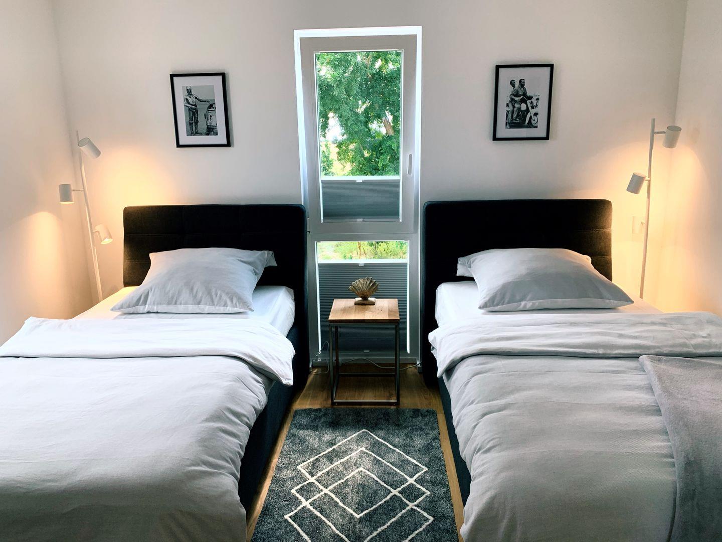 Drei geschmackvoll gestaltete Schlafzimmer bieten Platz für bis zu sechs erwachsene Personen und Kinder. Zwei Schlafzimmer verfügen über komfortable Boxspring-Doppelbetten und TV, das dritte über zwei hochwertige 1m breite Boxspring-Einzelbetten. Hier schlaft Ihr ruhig – die Lage am Rand der Anlage garantiert absolute Entspannung. Für diejenigen, die zwischendurch aber nochmal kurz an den Schreibtisch möchten, steht ein gemütlicher Arbeitsplatz in einem der Schlafzimmer bereit.