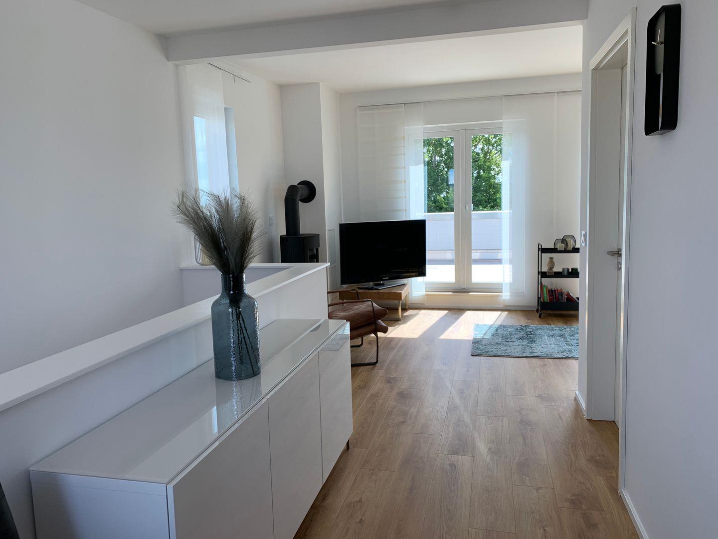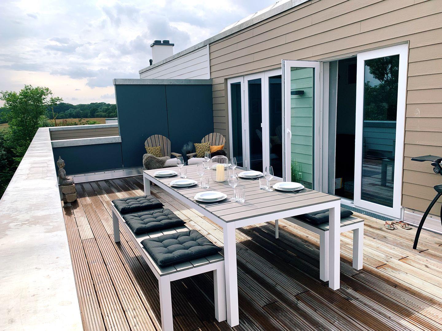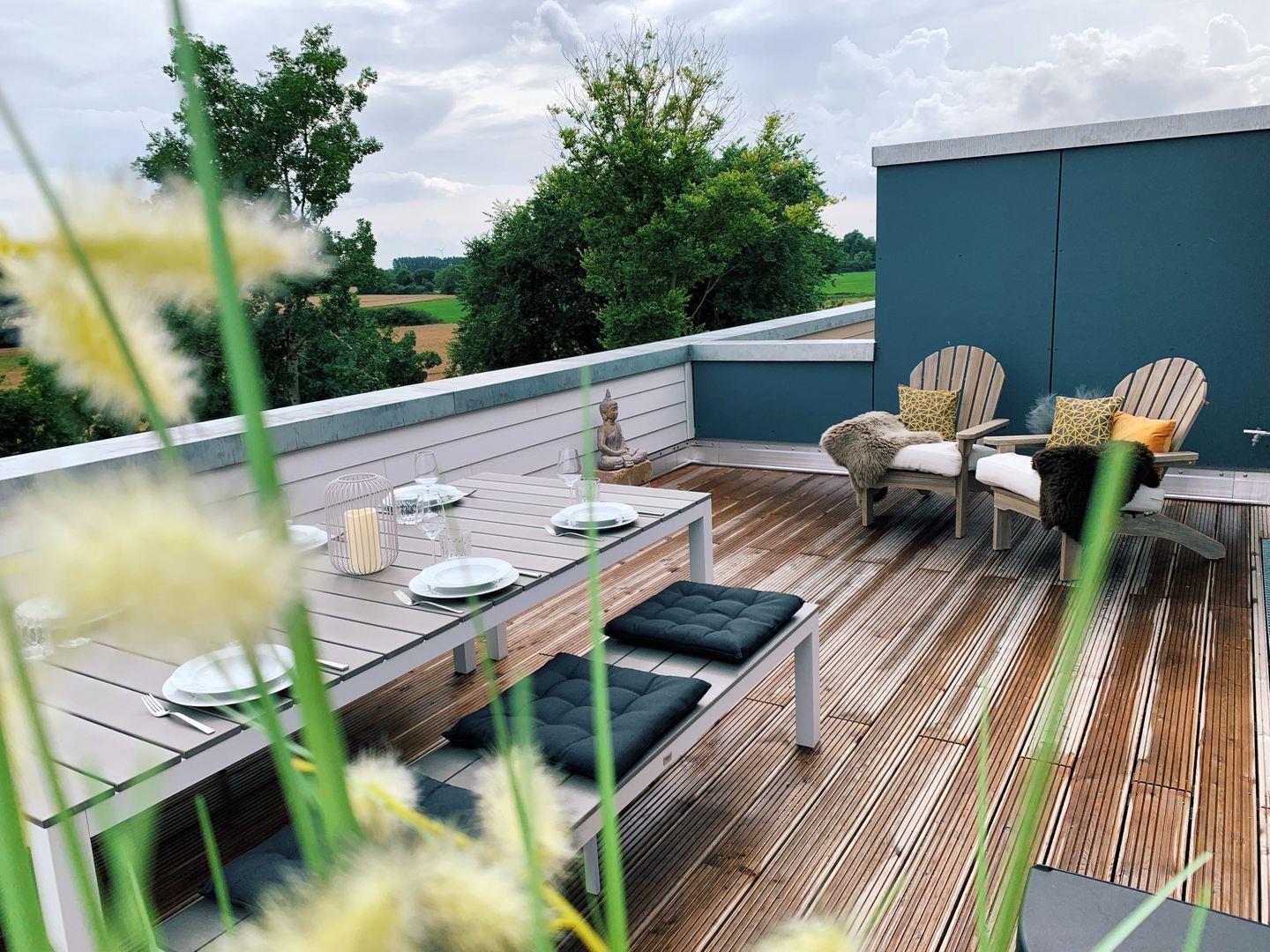 Das Highlight ist die windgeschützte und zum Süden ausgerichtete, große Dachterrasse mit Holzboden. Hochwertige Terrassenmöbel, zwei komfortable Liegen, ein großer Sonnenschirm und ein Elektrogrill schaffen den perfekten Rahmen für Sonnenbaden, lange Sommertage und entspannte Abende. Ob Frühstück im ersten Licht, ein gutes Buch am Nachmittag oder ein Glas Wein bei Sonnenuntergang – hier genießt Ihr maximale Ruhe und einen freien Blick über das angrenzende Naturschutzgebiet.