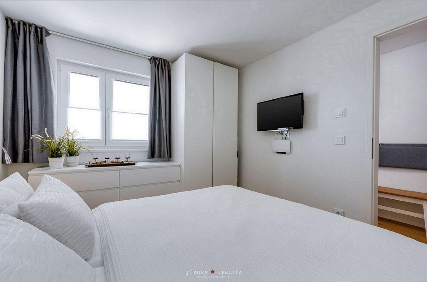 Das gemütliche Schlafzimmer mit TV und Doppelbett (180 × 200 cm) verspricht Dir erholsame Nächte und Entspannung pur.
