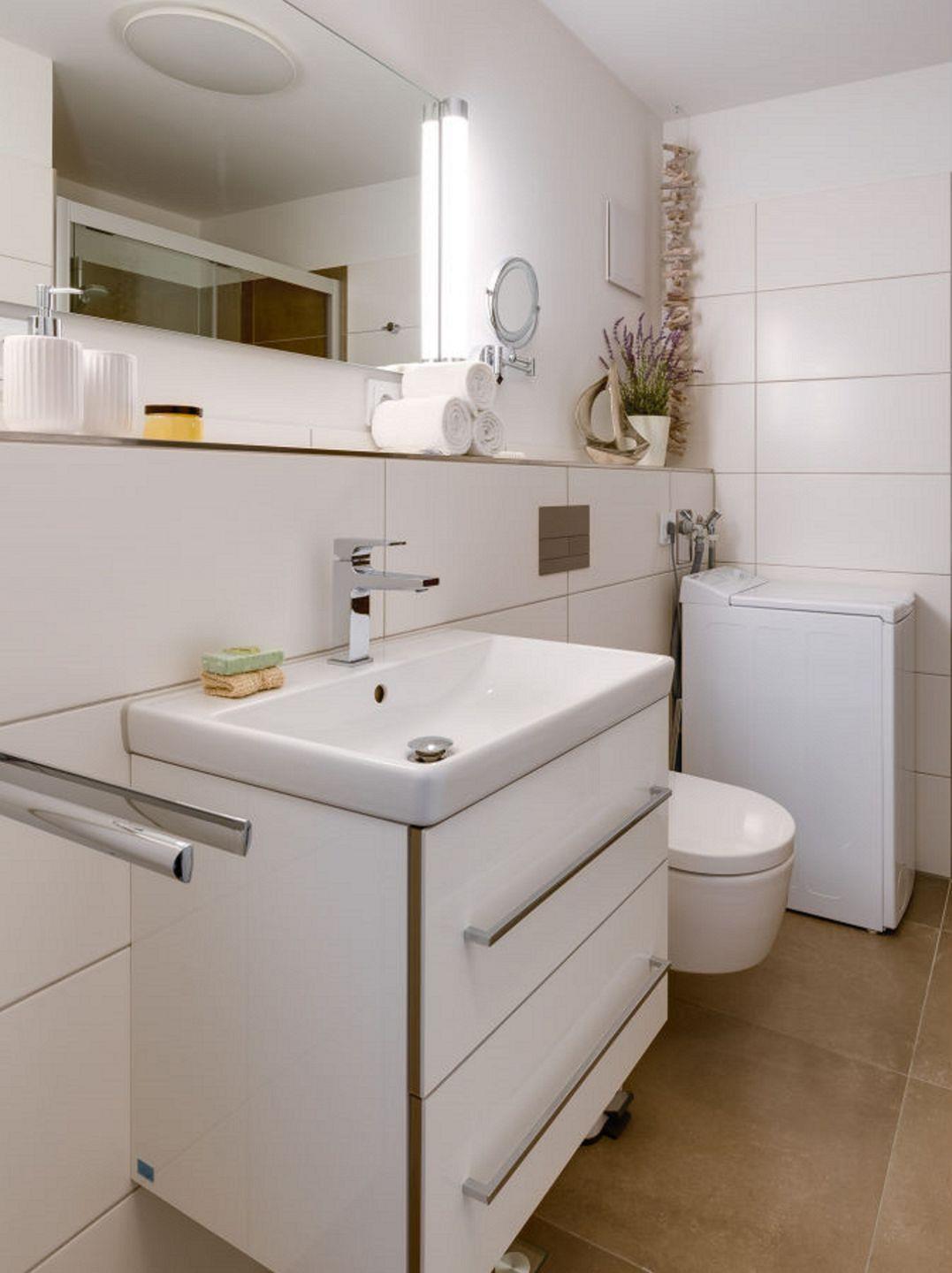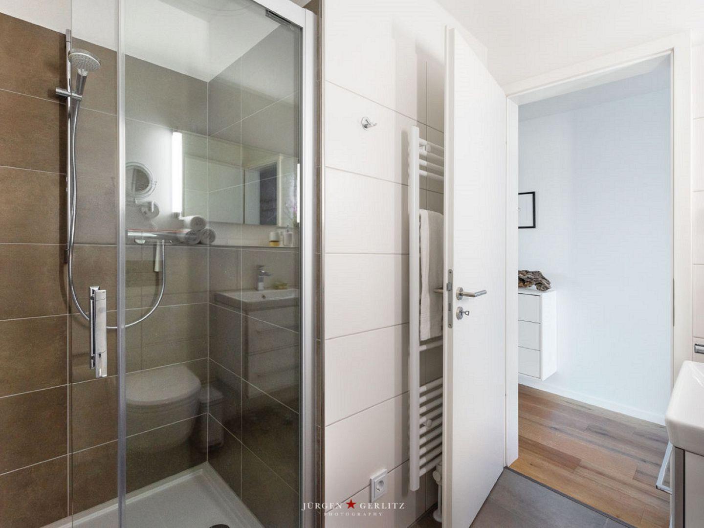 Das Badezimmer punktet mit einer ebenerdigen Dusche.