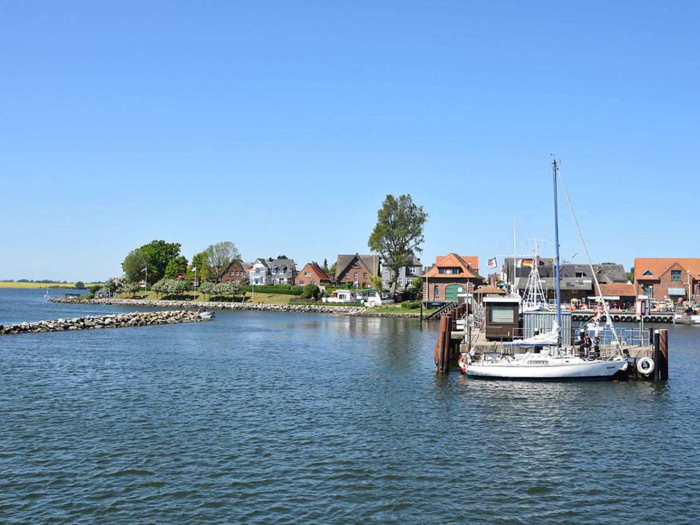 Auf dem Nord-Ost-Balkon kannst Du einen wunderschönen Ausblick auf den Hafen Olpenitz genießen und die Abende bei einem Glas Wein ausklingen lassen.