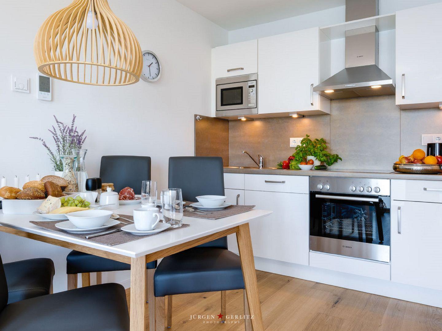 Die voll ausgestattete Küche lässt Hobbykoch-Herzen höherschlagen – hier kannst Du leckere Gerichte zubereiten.