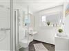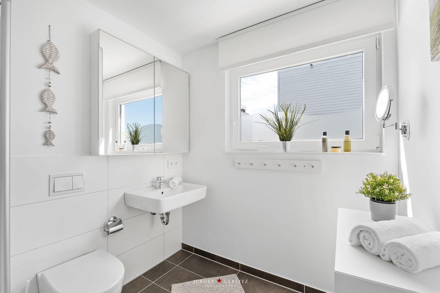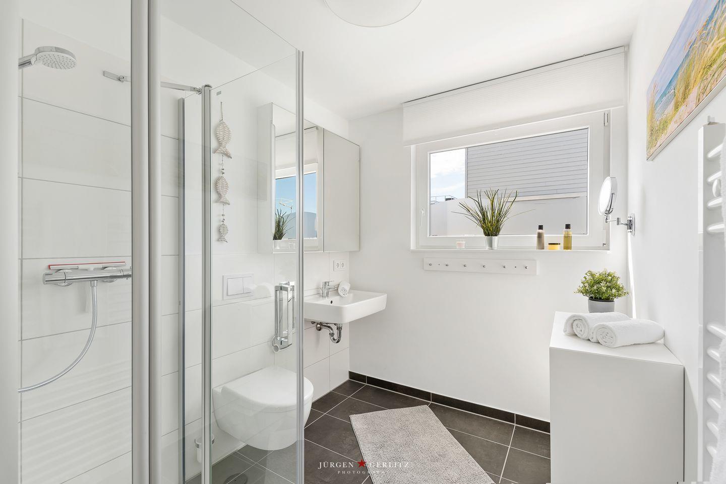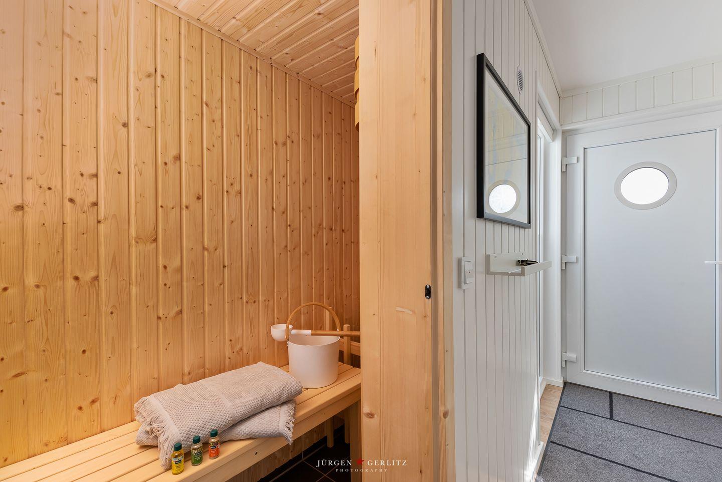Das Badezimmer ist mit einer bodengleichen Dusche ausgestattet. Zu den Annehmlichkeiten des Ferienhauses zählt außerdem eine eigene finnische Sauna. Ob nach einem längeren Ausflug oder einfach zur inneren Ruhe – hier kannst Du entspannen und Dich wohlfühlen.