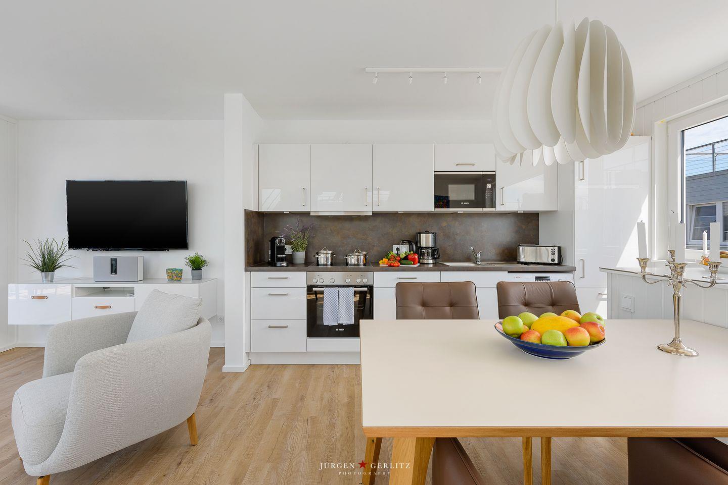 Die Unterkunft erstreckt sich über zwei Etagen, mit zwei komfortablen Schlafzimmern im Erdgeschoss, in denen Du nach einem ereignisreichen Tag entspannen kannst. Der großzügige Wohnbereich ist offen gestaltet und bietet Dir eine moderne Küche, die mit hochwertigen Geräten ausgestattet ist. Hier findest Du alles, was Du für Deine kulinarischen Kreationen benötigst, einschließlich eines Herds, Backofens, Kühlschranks mit Gefrierfach, Geschirrspülers und einer Nespresso-Espressomaschine. Der Essbereich lädt Dich zu gemeinsamen Mahlzeiten ein und schafft eine einladende Atmosphäre.