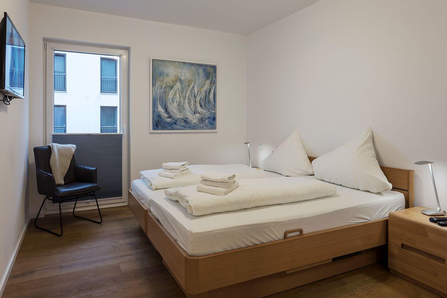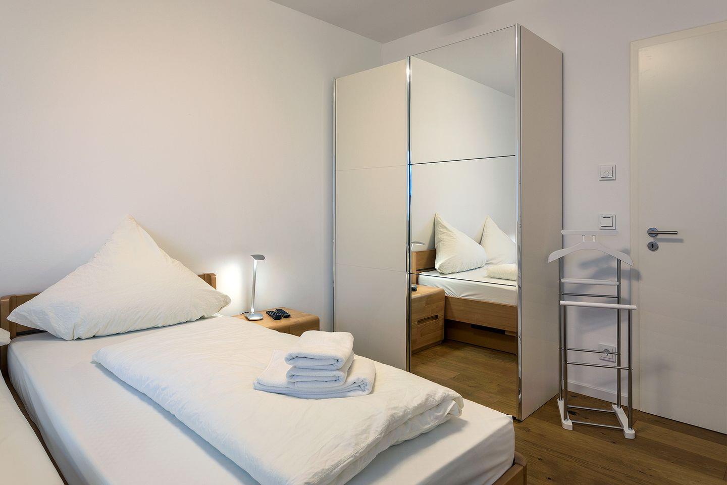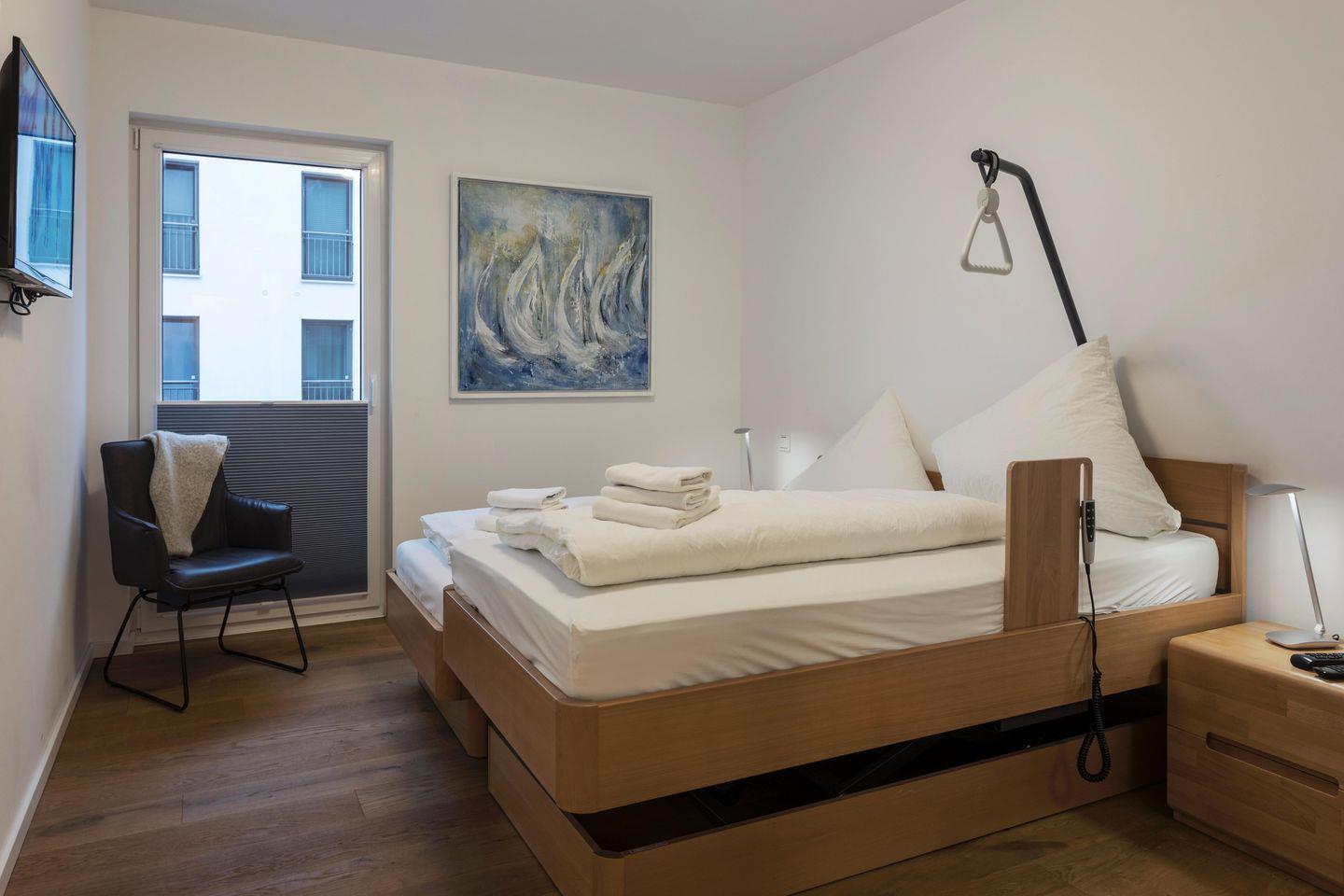 Mit zwei stilvoll gestalteten Schlafzimmern, darunter ein geräumiges Doppelbett (160 x 200 cm) sowie ein zweites Zimmer mit zwei Einzelbetten, eines davon mit großzügigen 100 x 200 cm als Pflegebett mit Aufrichthilfe, ist ausreichend Platz für die ganze Familie vorhanden.