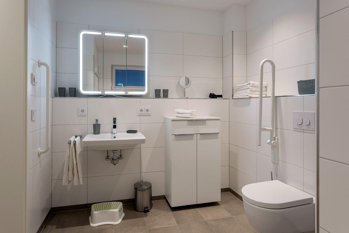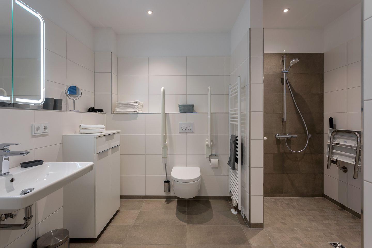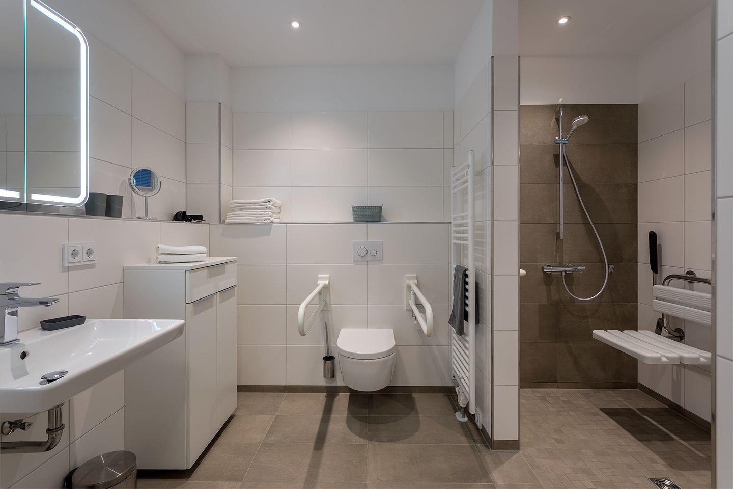 Für barrierefreies Wohnen ist gesorgt: Das Badezimmer verfügt über eine ebenerdige Dusche mit Haltegriffen sowie einen Stuhl für zusätzlichen Komfort.
