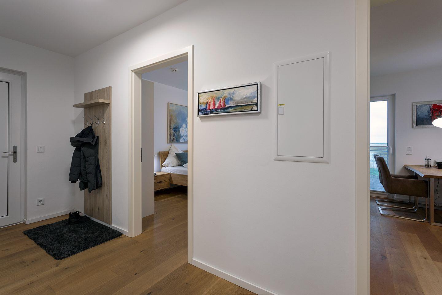 Die Wohnung bietet zwei stilvolle Schlafzimmer, 1 Doppelbett (160x200cm) und ein 2. mit 2 Einzelbetten, eines großzügig (100x200cm) als Pflegebett. Es gibt 1 offenen Wohn-/Essbereich und eine vollausgestattete Küche. Die Terrasse lockt mit Meerblick und Elektrogrill. Barrierefreiheit ist gewährleistet: Das Bad bietet ebenerdige Dusche, Haltegriffe, und Stuhl für Komfort. Auch am WC sind ausklappbare Haltegriffe vorhanden, Tiefgarage mit Schwerbehindertenparkplatz und Aufzug für bequemen Zugang.