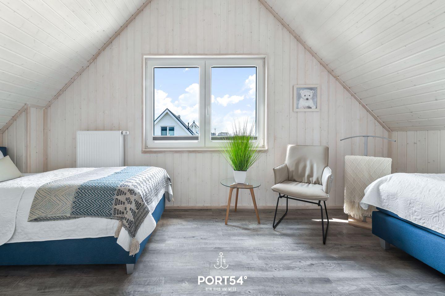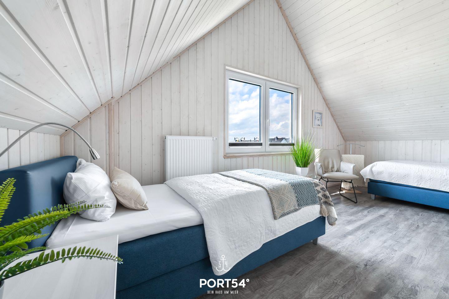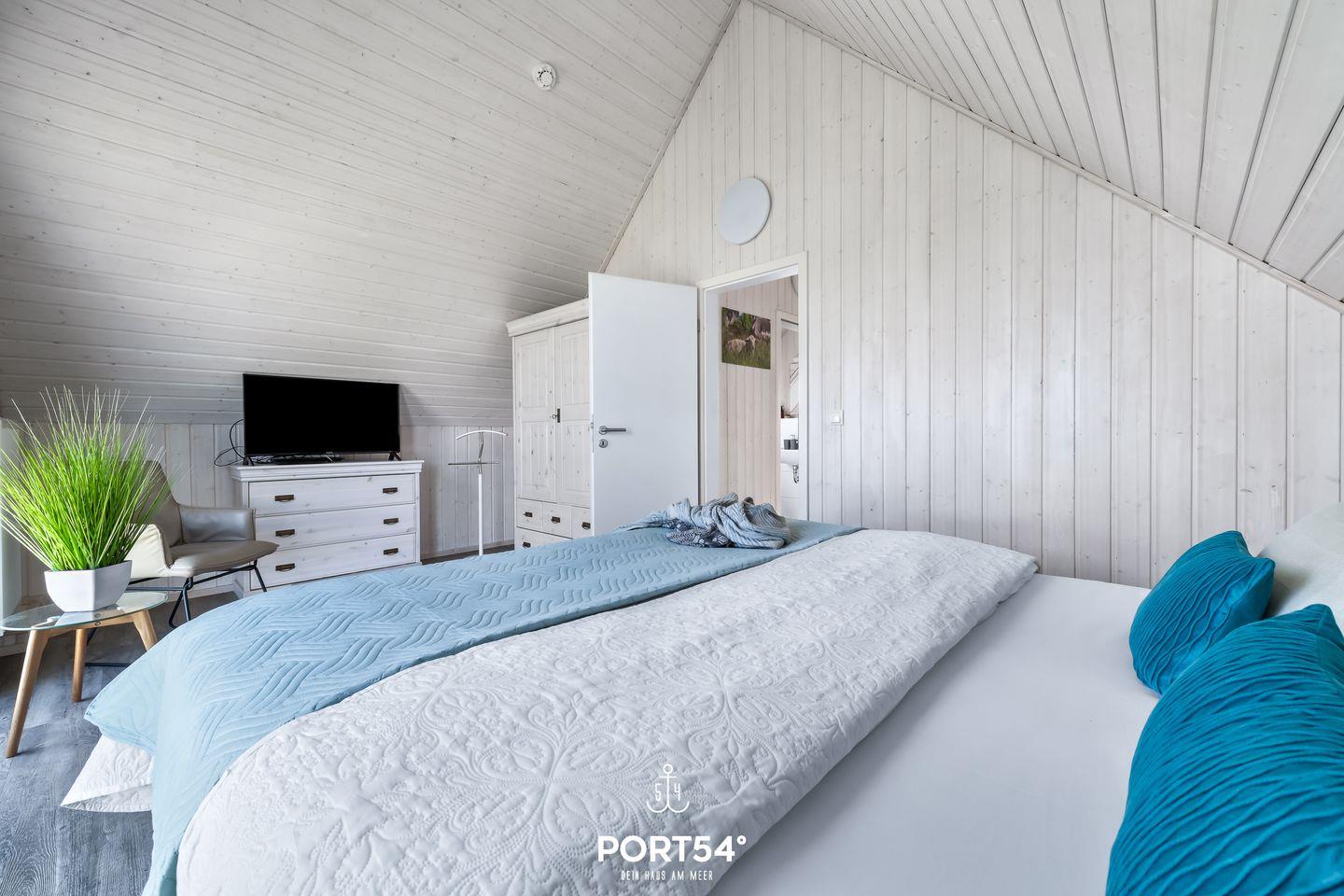 Im Obergeschoss findest Du die beiden Schlafzimmer. Das eine Schlafzimmer ist mit einem Boxspring-Doppelbett (180 x 200 cm), einem Smart-TV sowie Insektenschutzgittern ausgestattet. Das andere Schlafzimmer verfügt über zwei Boxspring-Einzelbetten (je 90 x 200 cm). Beide Schlafzimmer sind jeweils mit einem Kleiderschrank sowie Verdunkelungsmöglichkeiten ausgestattet.