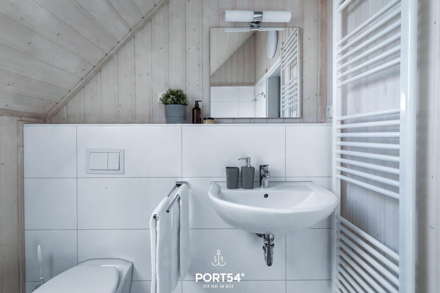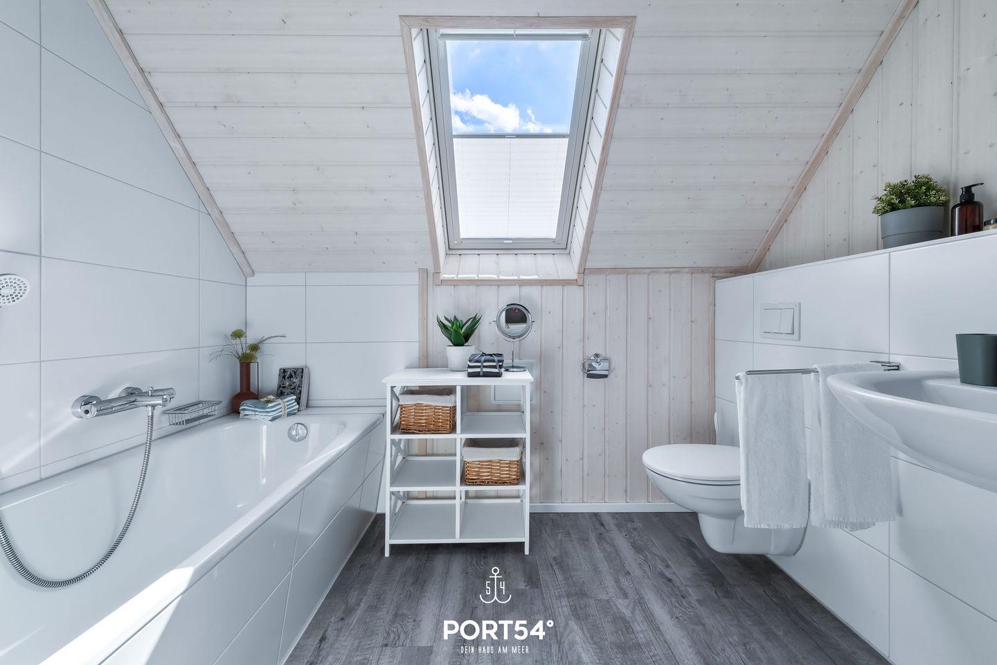 Ebenfalls im Obergeschoss befindet sich ein Badezimmer mit Badewanne, einem Kosmetikspiegel und einem Handtuchheizkörper.