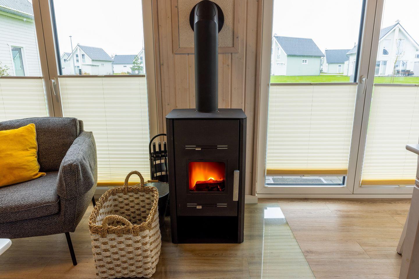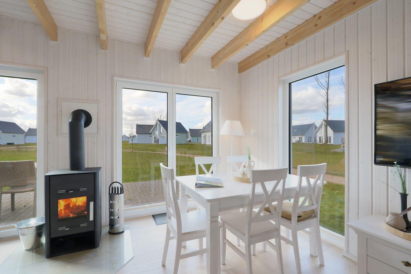 Entspanne Dich auf dem Sofa vor dem Flachbild-TV oder lasse Deine Urlaubstage auf der Terrasse ausklingen. Das Sofa im Wohnbereich lässt sich zu einem Schlafsofa (140 x 200 cm) umfunktionieren und bietet somit 2 weitere Schlafplätze für Kinder. An den kühleren Tagen sorgt der Kaminofen im Wohnbereich für eine gemütliche Wärme. In der vollausgestatteten Küche lassen sich leckere Gerichte zaubern.