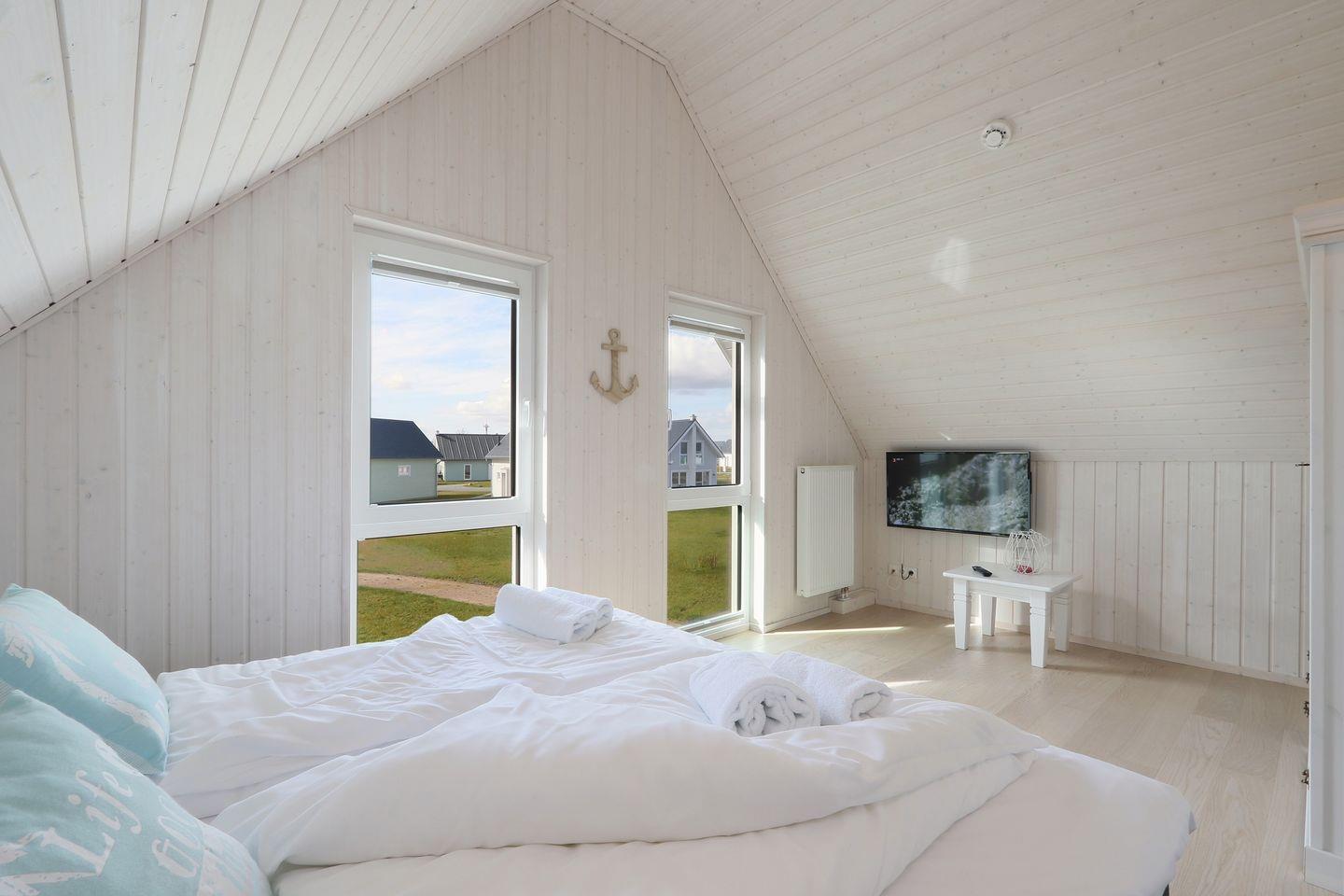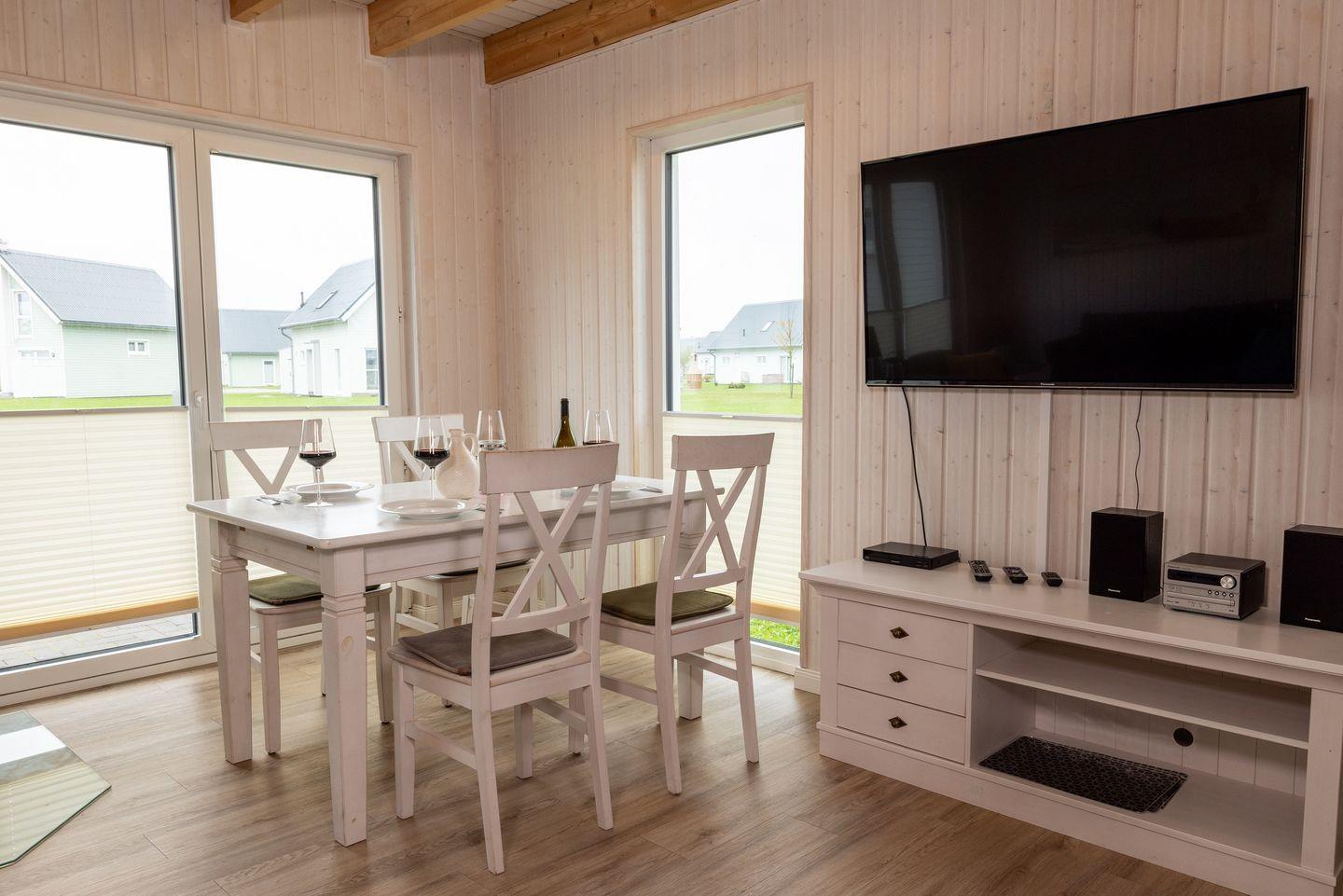 Das Ferienhaus bietet auf 80m² einen offenen Wohn- und Essbereich mit Kamin, eine voll ausgestattete Küche, zwei Schlafzimmer, zwei Badezimmer und eine Terrasse. Das eine Schlafzimmer bietet ein Doppelbett, ein Flachbild-TV und das andere Schlafzimmer zwei Einzelbetten. Das Sofa lässt sich zu einer Schlafcouch umfunktionieren. Die Bäder bieten eine Dusche und eine Badewanne sowie eine Infrarotkabine. Auf der Terrasse gibt es Gartenmöbel, einen Sonnenschirm, sowie einen Holzkohlegrill.