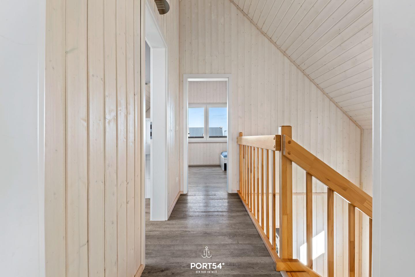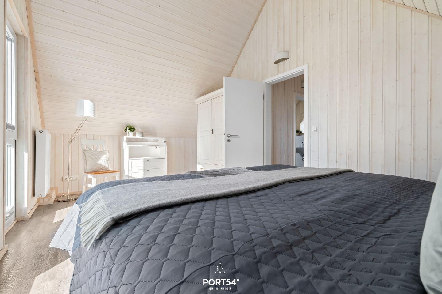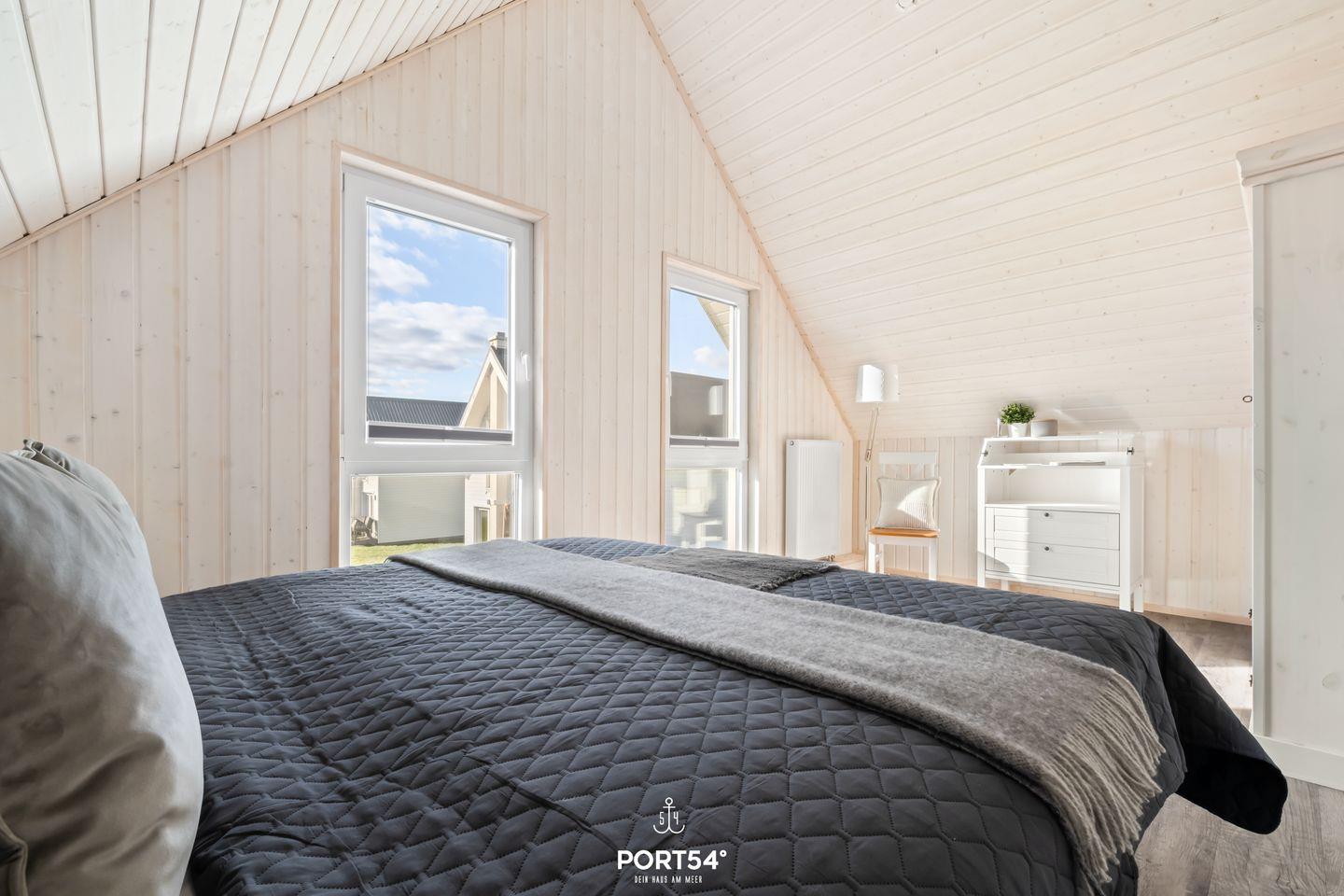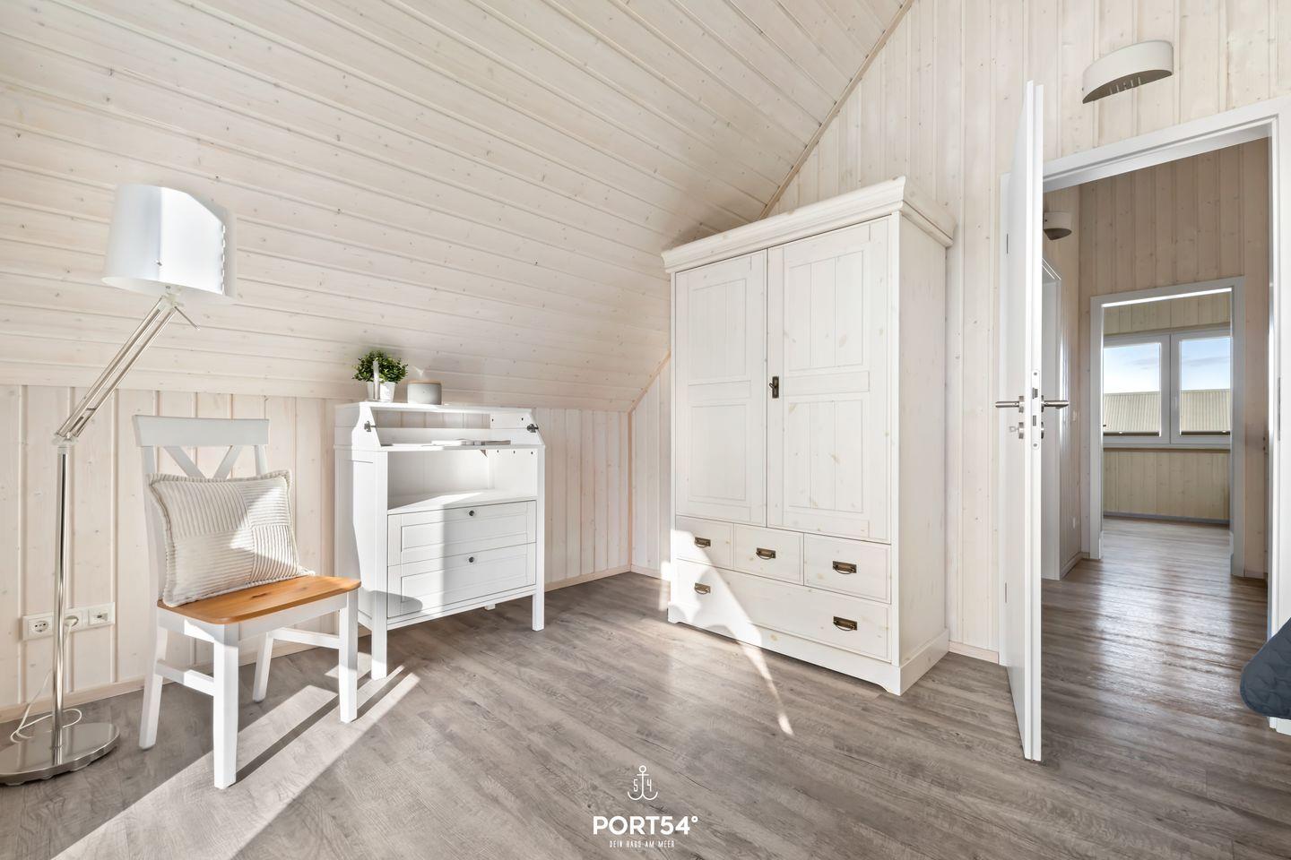 Im Obergeschoss befinden sich die zwei Schlafzimmer. Das eine ist mit einem Doppelbett (180 x 200 cm) ausgestattet, das andere verfügt über zwei Einzelbetten (je 90 x 200 cm). Beide Schlafzimmer sind mit je einem Kleiderschrank, Insektenschutzgitter und Verdunkelungsmöglichkeiten ausgestattet.