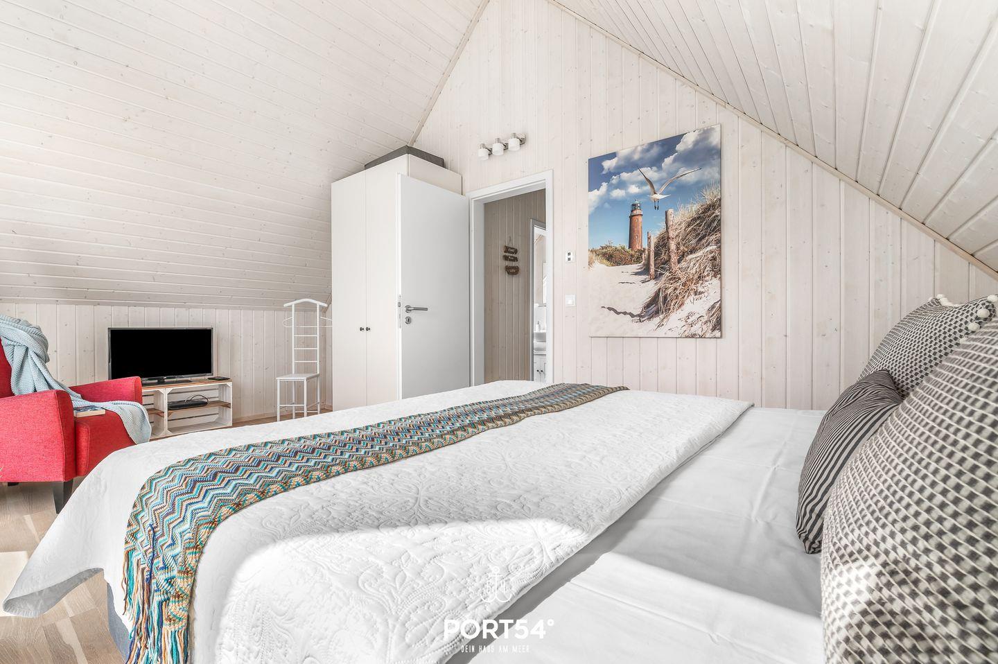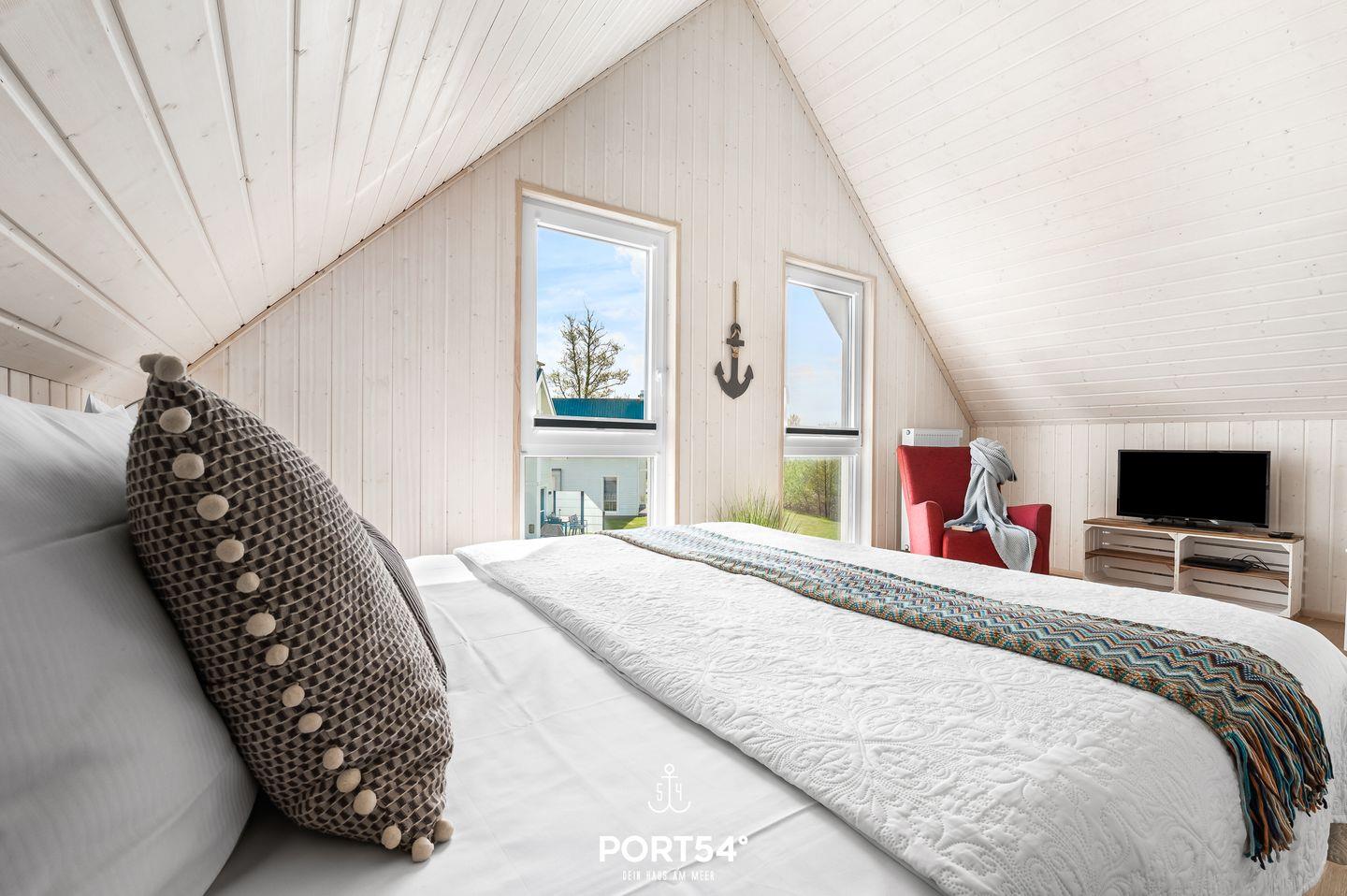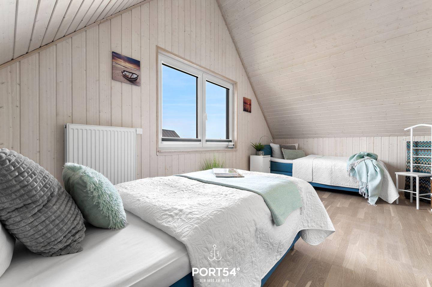Im ersten Obergeschoss befinden sich die zwei Schlafzimmer. Das eine ist mit einem Boxspring-Doppelbett (180 x 200 cm) ausgestattet, das andere verfügt über zwei Boxspring-Einzelbetten (je 90 x 200 cm). In beiden Schlafzimmern sind Flachbild-Fernseher mit Magenta-Zugängen sowie Kleiderschränke vorhanden. Für erholsame Nächte sind beide Schlafzimmer mit Verdunkelungsmöglichkeiten ausgestattet.