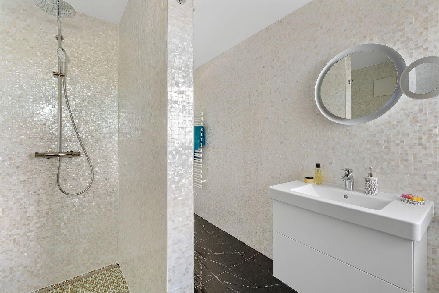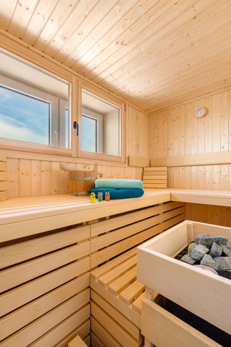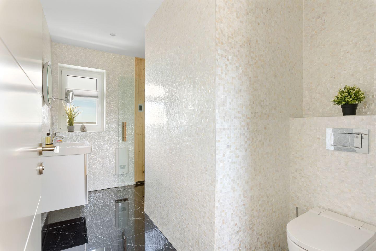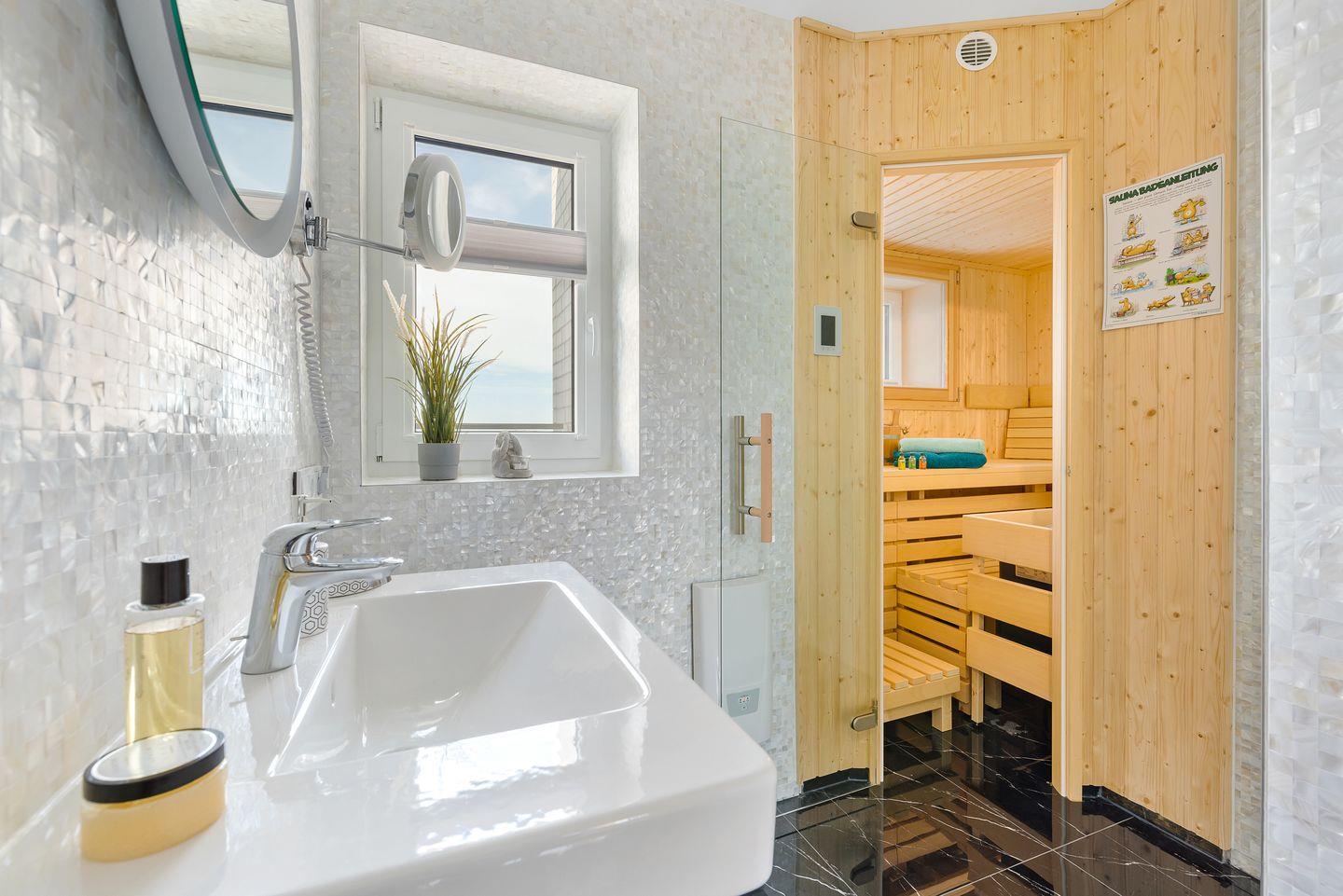 Entspannen Sie in Ihrer privaten Sauna mit Blick auf das Meer oder in der großzügigen Dusche des elegant gefliesten Badezimmers. Auch die praktische Ausstattung mit Waschmaschine und Trockner im Hauswirtschaftsraum bietet alle Annehmlichkeiten, die Sie für einen sorglosen Aufenthalt benötigen.
