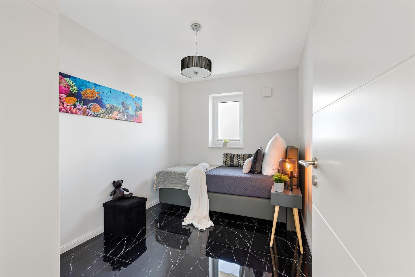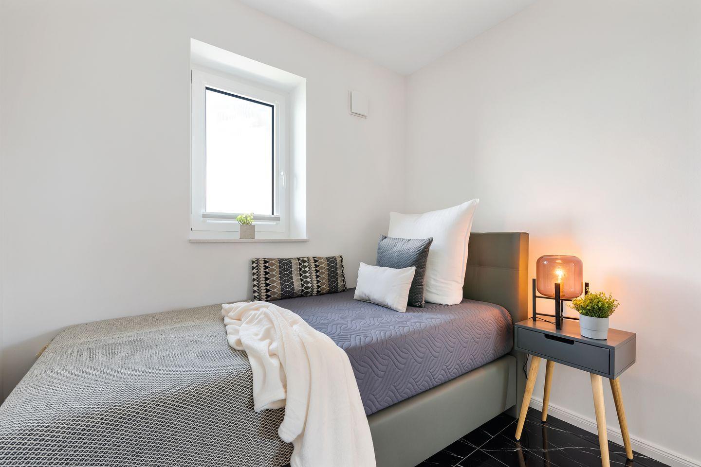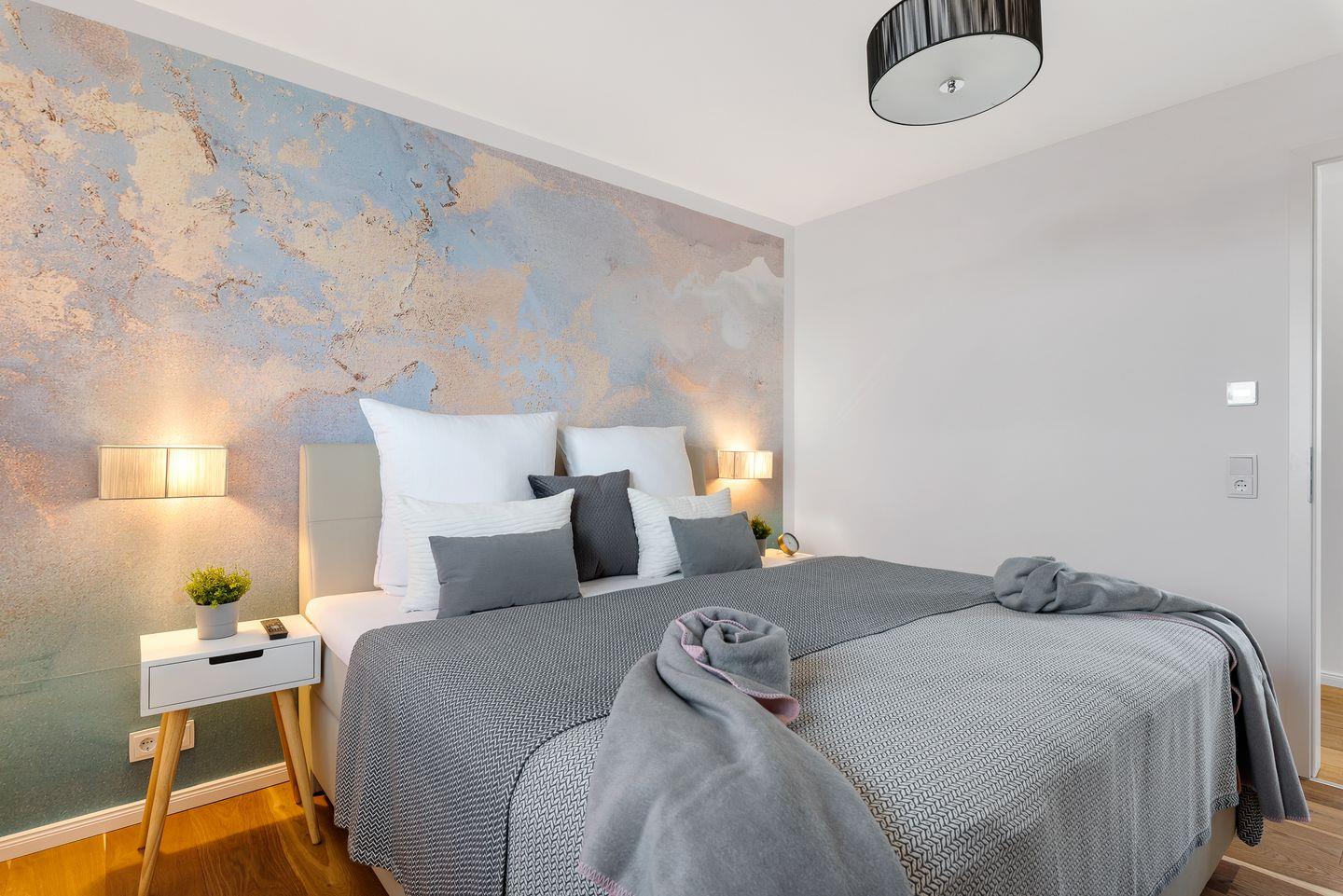 Das großzügige Schlafzimmer mit einem luxuriösen Boxspringbett verspricht erholsame Nächte. Ein weiteres Einzelzimmer, liebevoll eingerichtet und ideal für Kinder, rundet das Wohnangebot ab. Jedes Zimmer gewährt Zugang zur umlaufenden Sonnenterrasse, die zum Verweilen und Sonnenbaden einlädt.