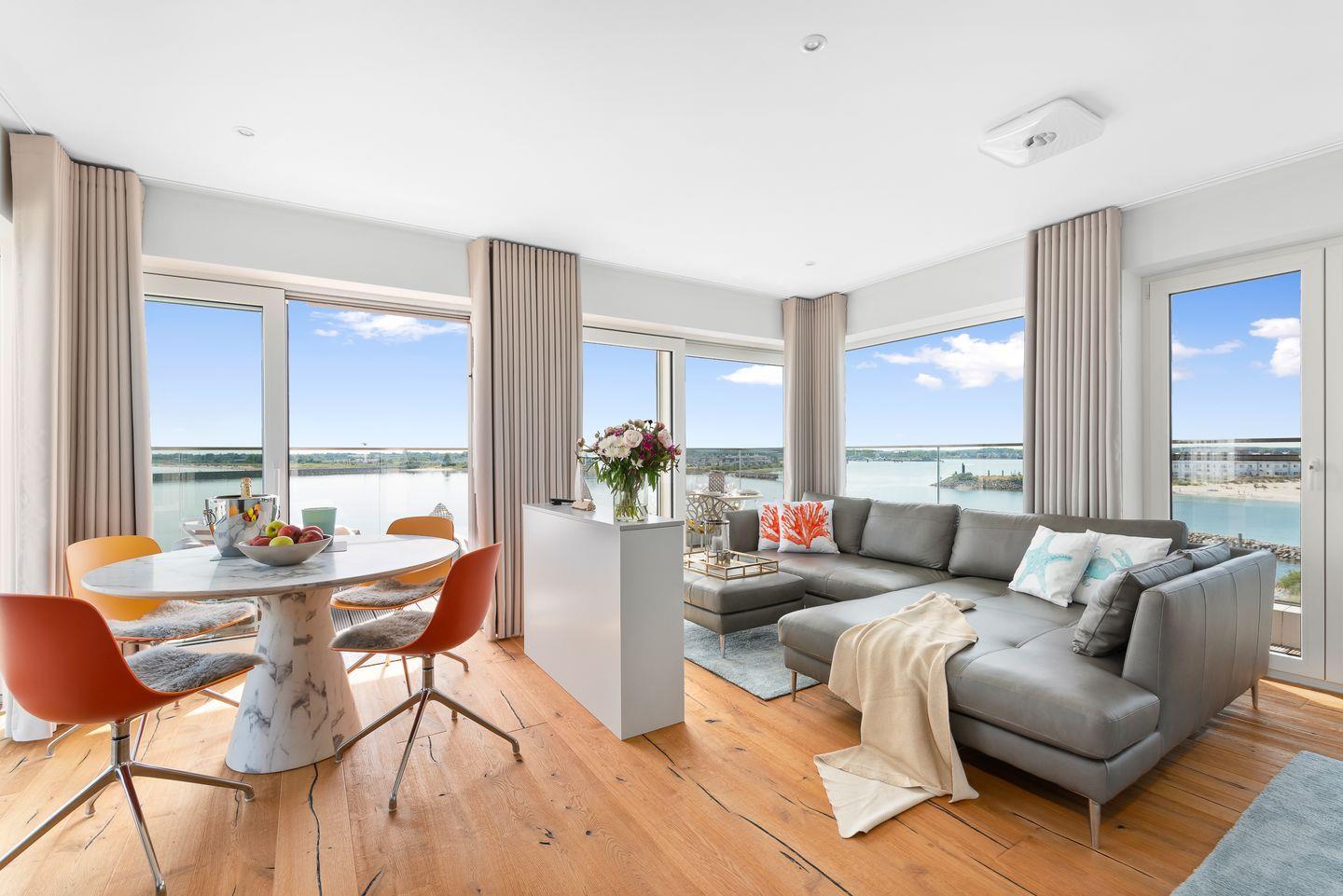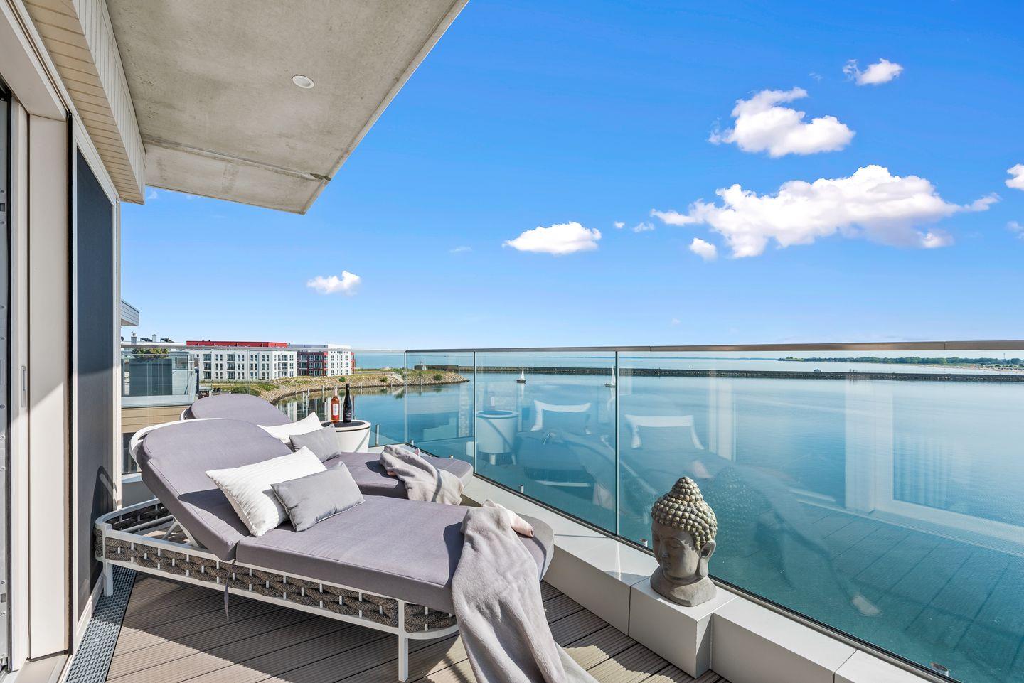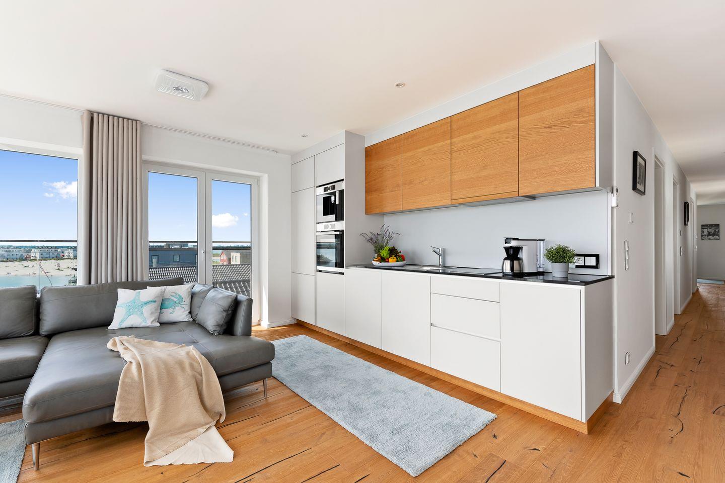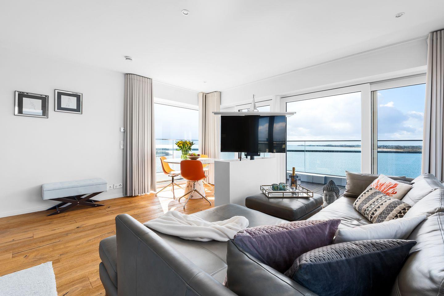 Erleben Sie einen Urlaub, der seinesgleichen sucht, mit atemberaubenden Ausblicken auf die Ostsee und die Hafeneinfahrt, wo Segelyachten vorbeiziehen. Große, bodentiefe Fenster im Wohn-Essbereich fangen die Schönheit der Umgebung ein und sorgen für lichtdurchflutete Räume.