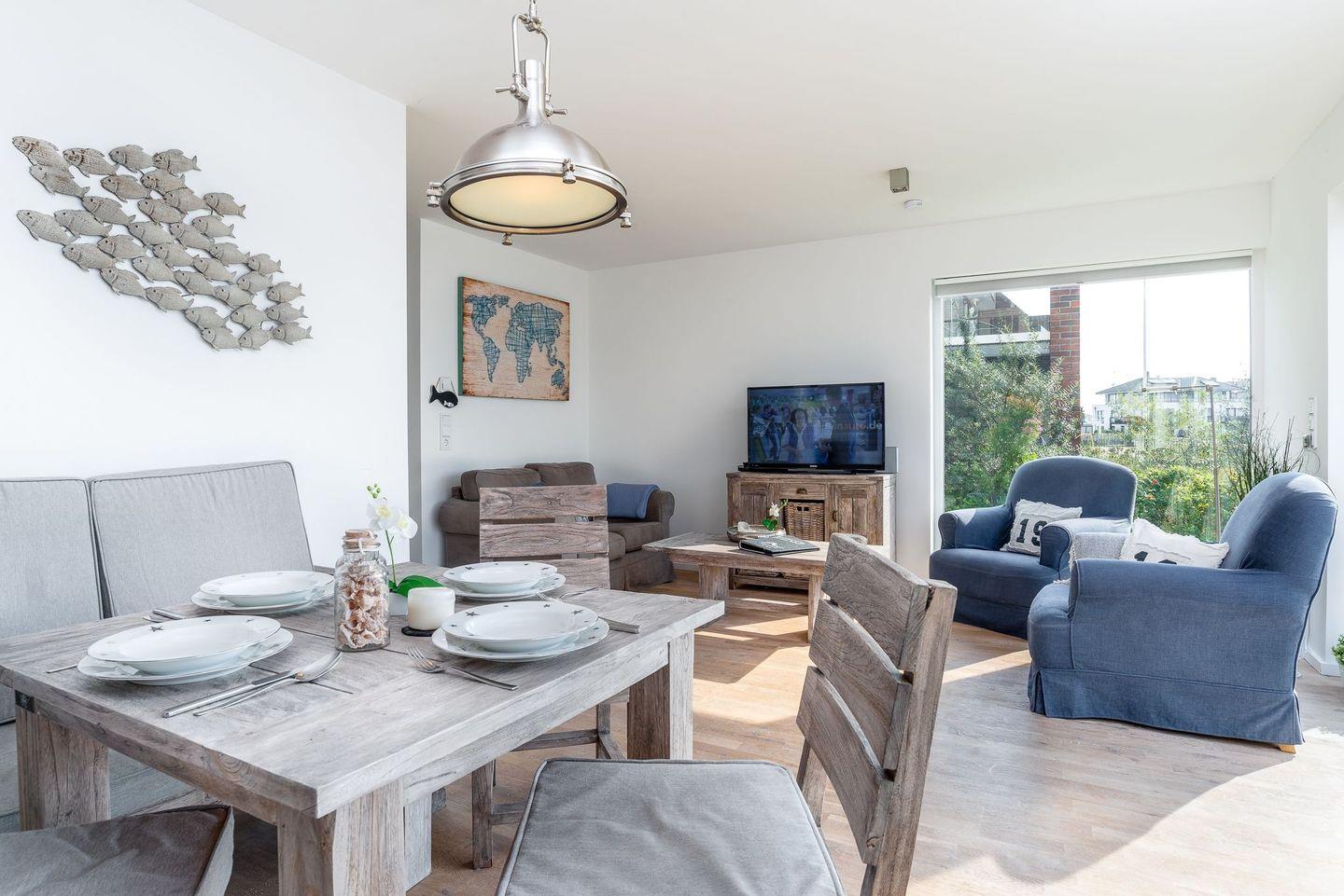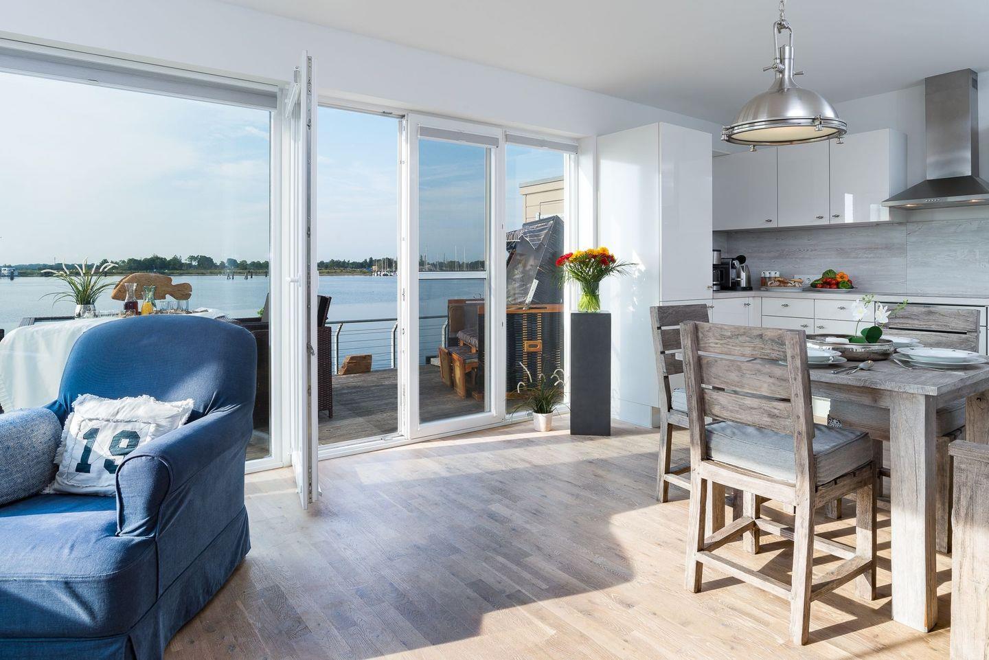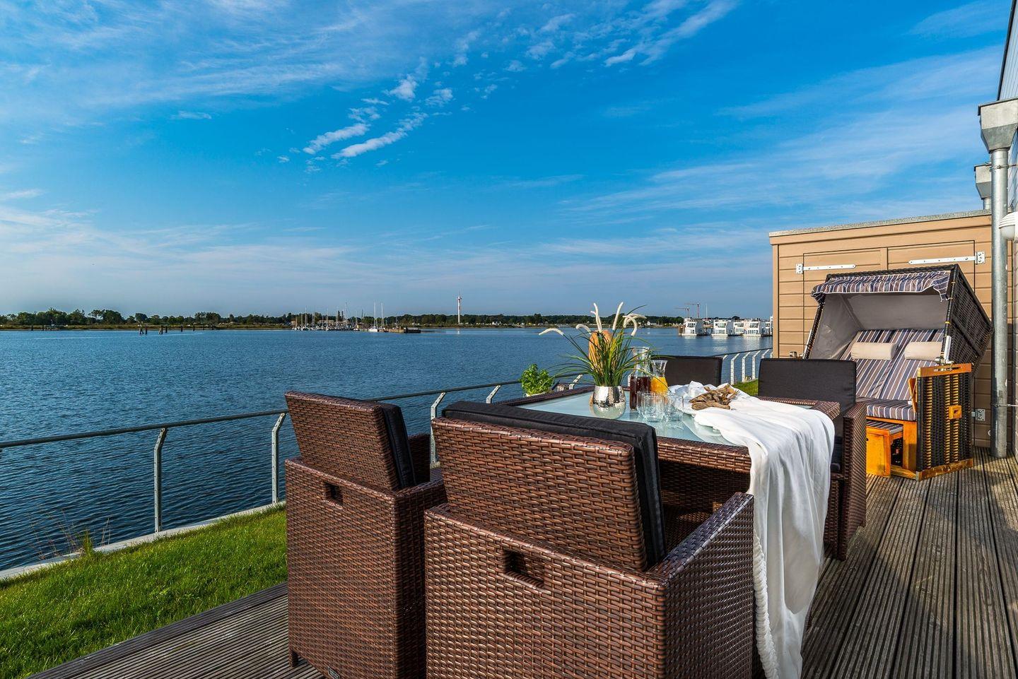 Auf der großen Sonnenterrasse mit Südausrichtung, hochwertigen Loungemöbeln, Strandkorb, Sonnenschirm und Grill können sie vom Alltag ausspannen und den Segelbooten beim Ein- und Auslaufen zusehen. In dieser liebevoll und sehr stilvoll eingerichteten Ferienwohnung kann man den Urlaub in vollen Zügen genießen und sich rundum wohlfühlen.
