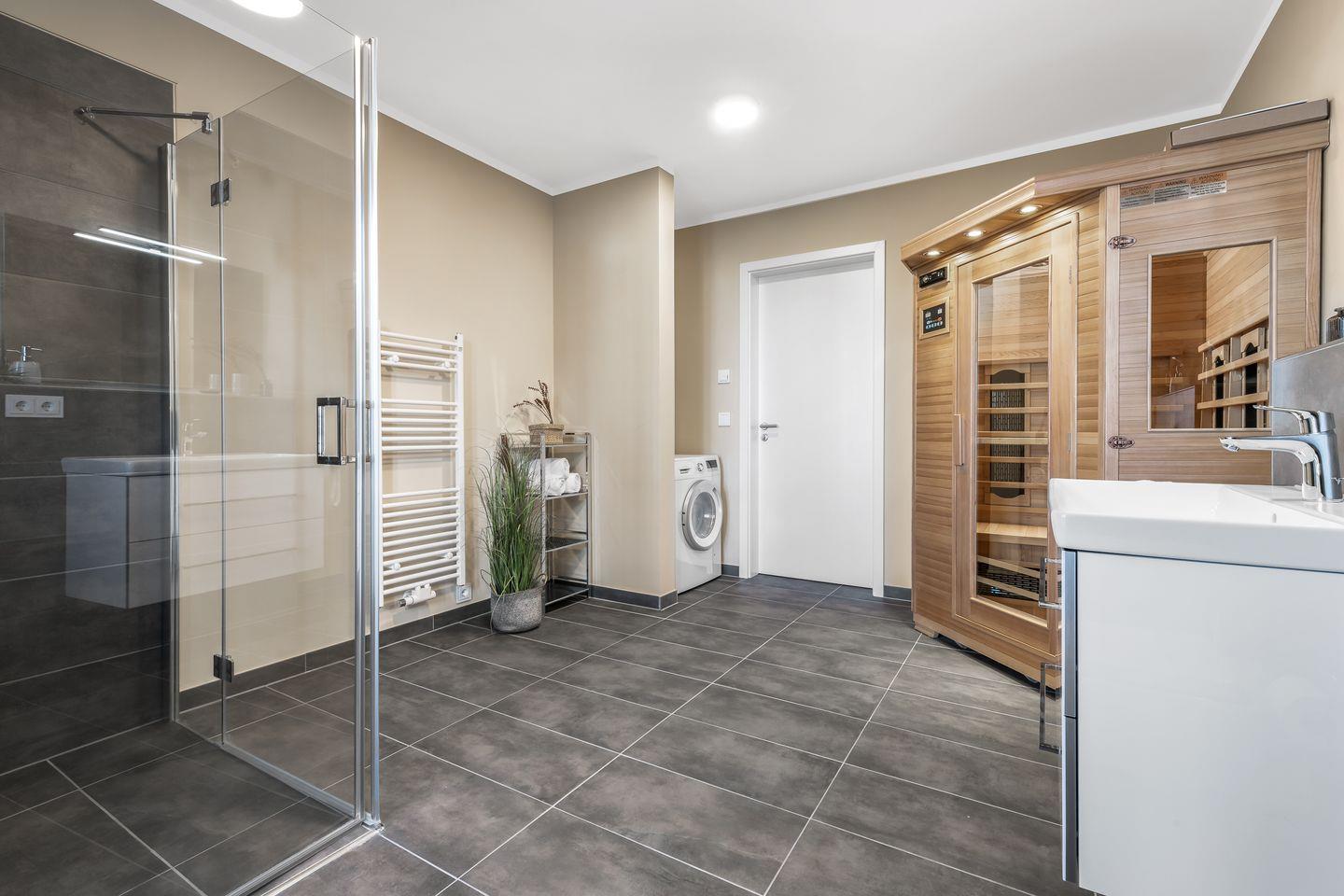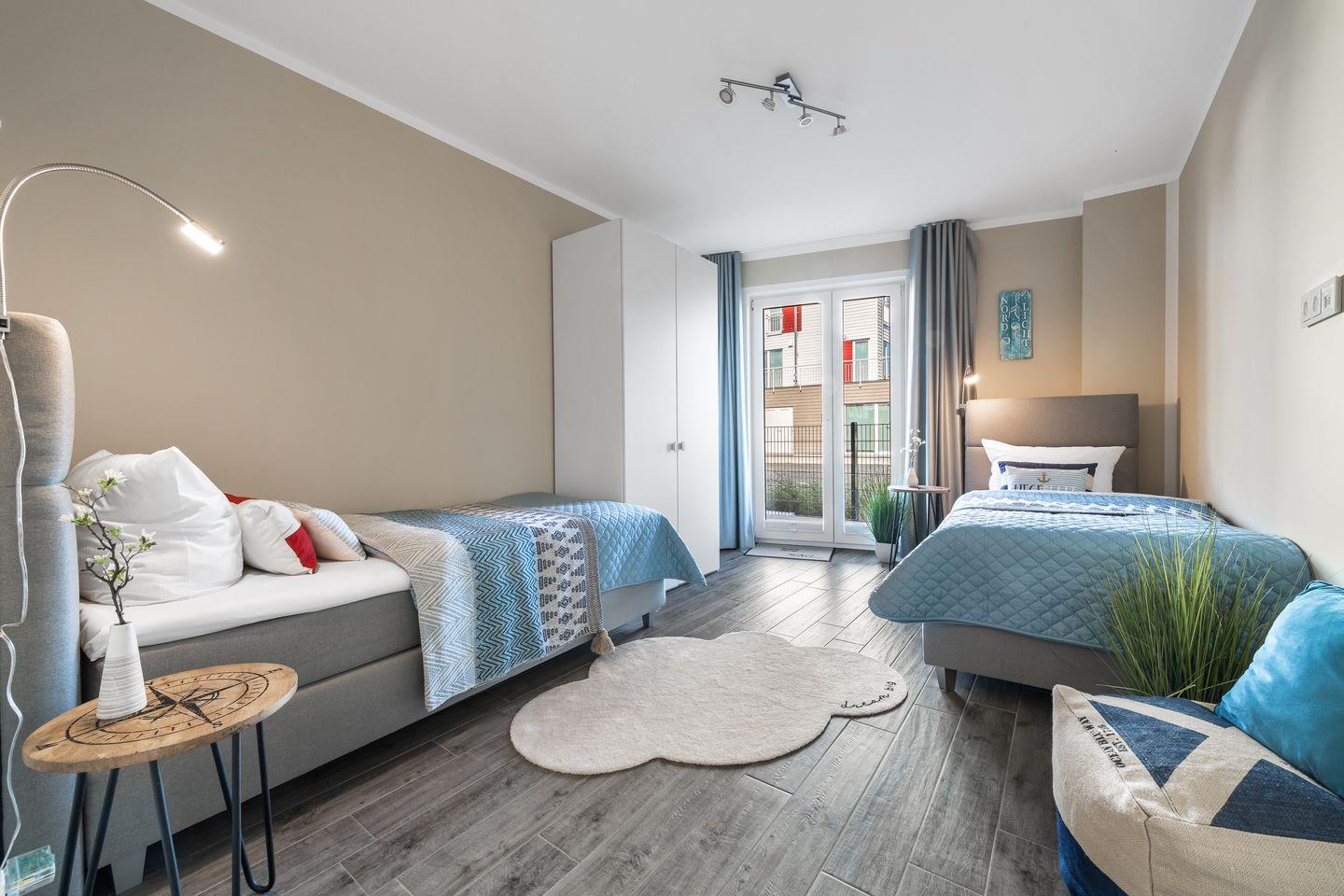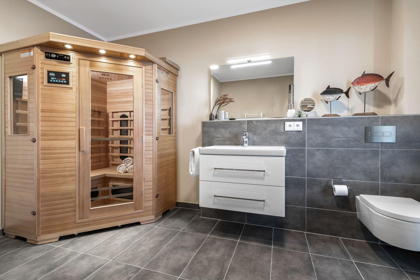 Dieses hochwertig ausgestattete Apartment bietet auch an kalten Tagen den perfekten Ort für Erholung und Entschleunigung. Ein Badezimmer mit großer ebenerdiger Dusche und einer Sauna macht diese Wohnung zur Wellnessoase. Der Masterbedroom ist ausgestattet mit einem großen Doppelbett, Kleiderschrank und TV. Das zweite Schlafzimmer verfügt über zwei Einzelbetten und einen Kleiderschrank.