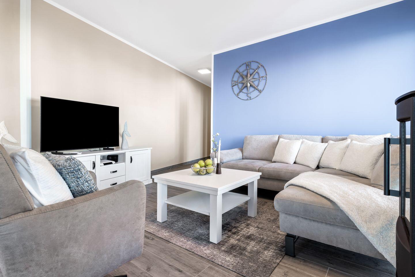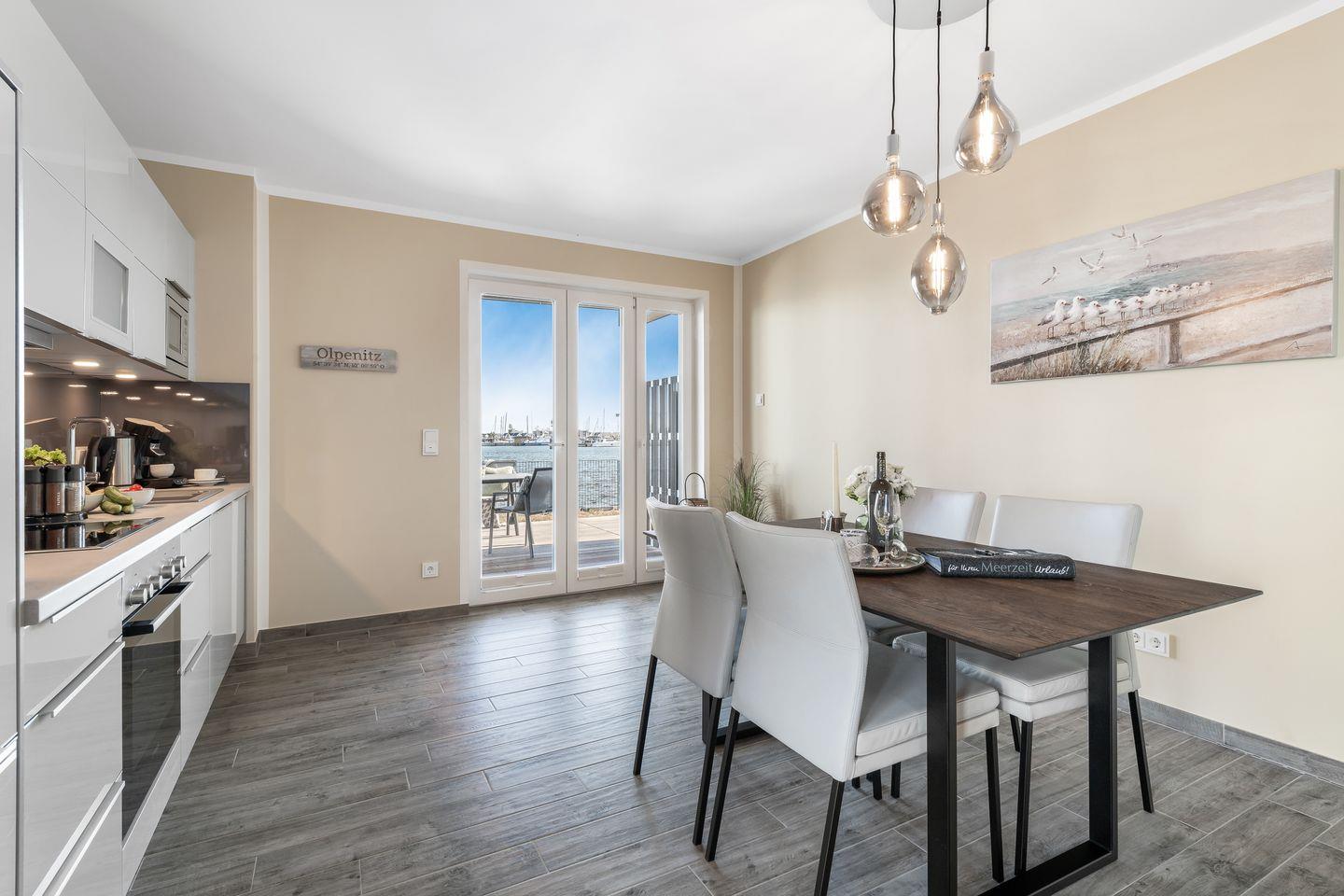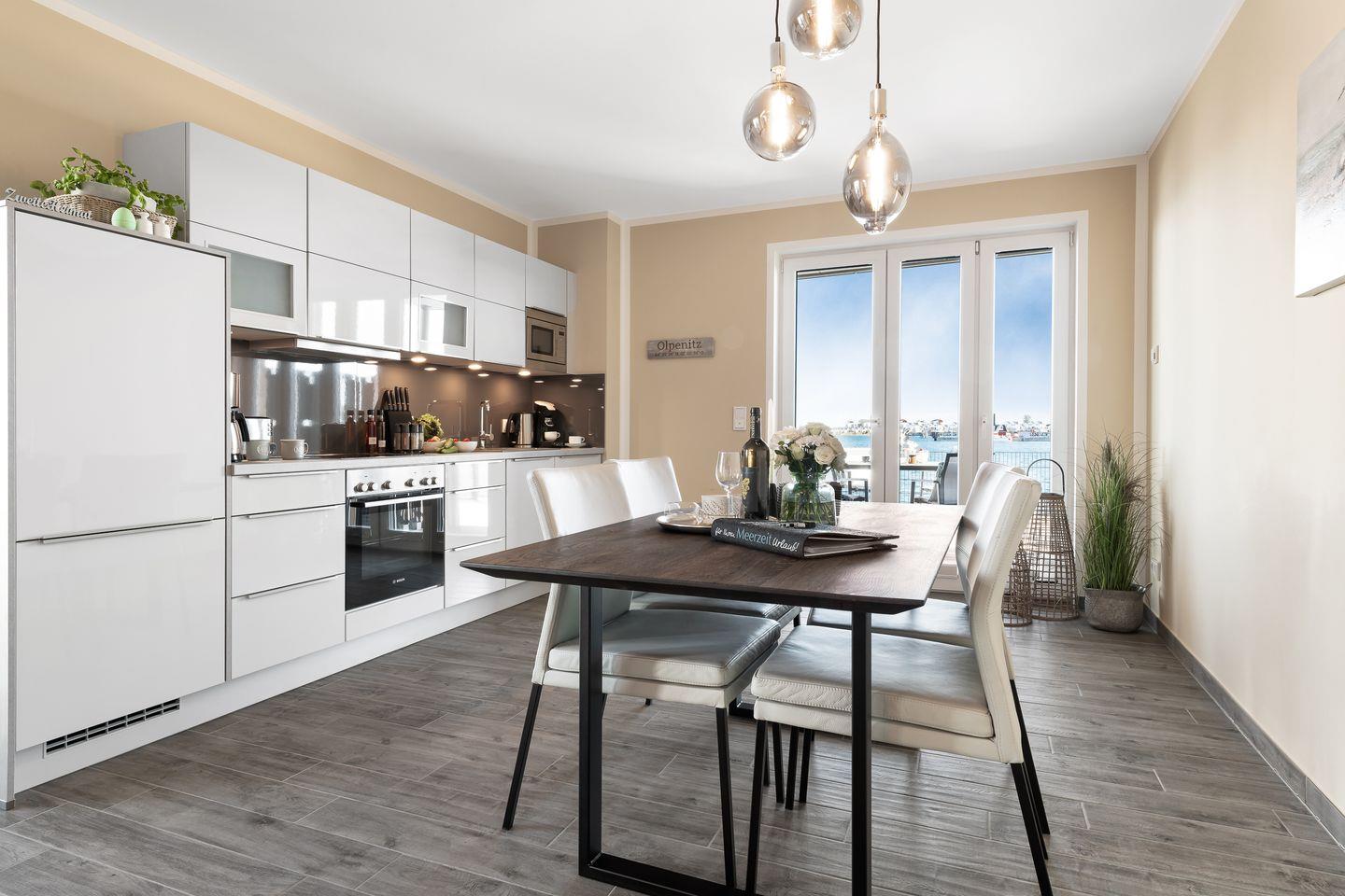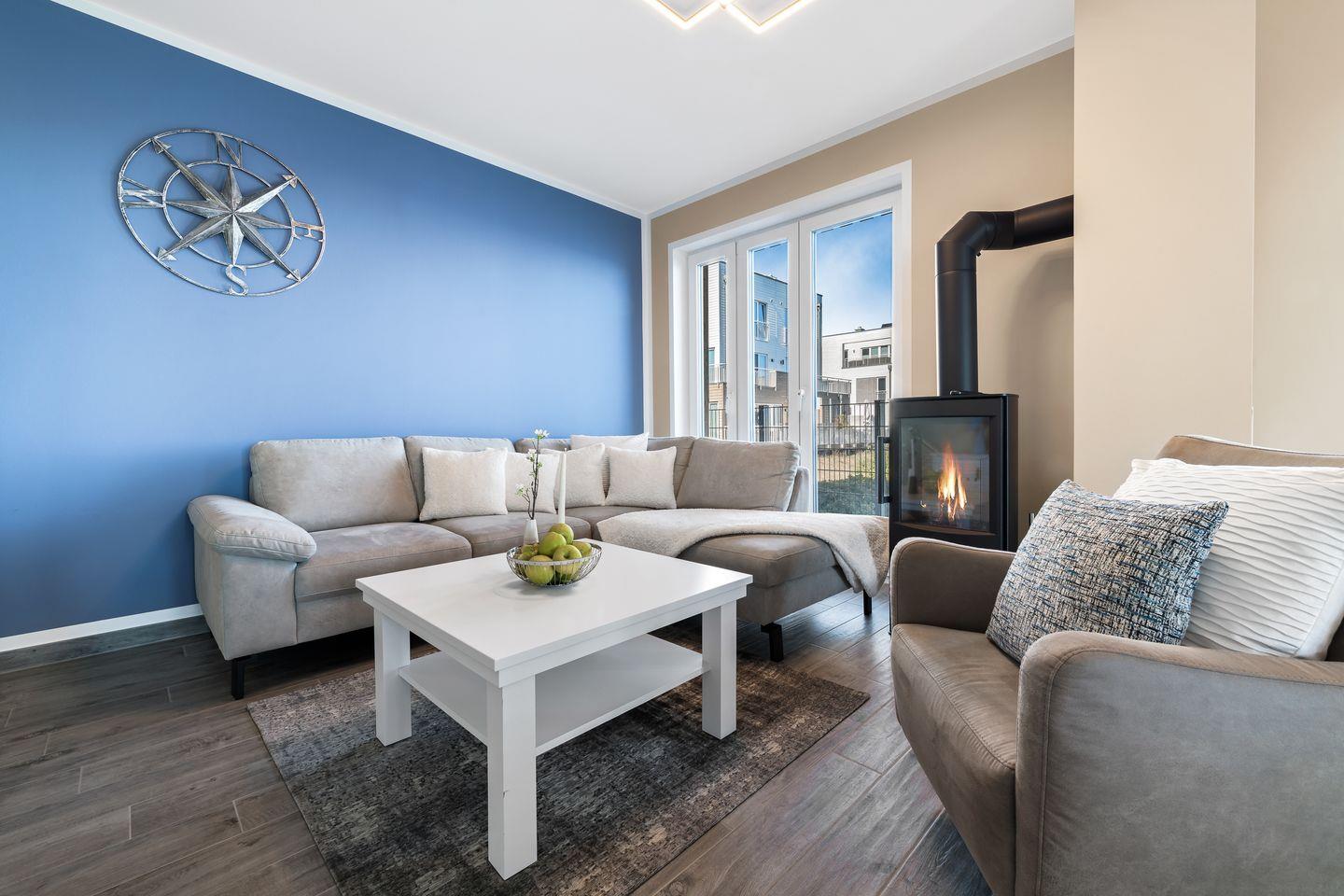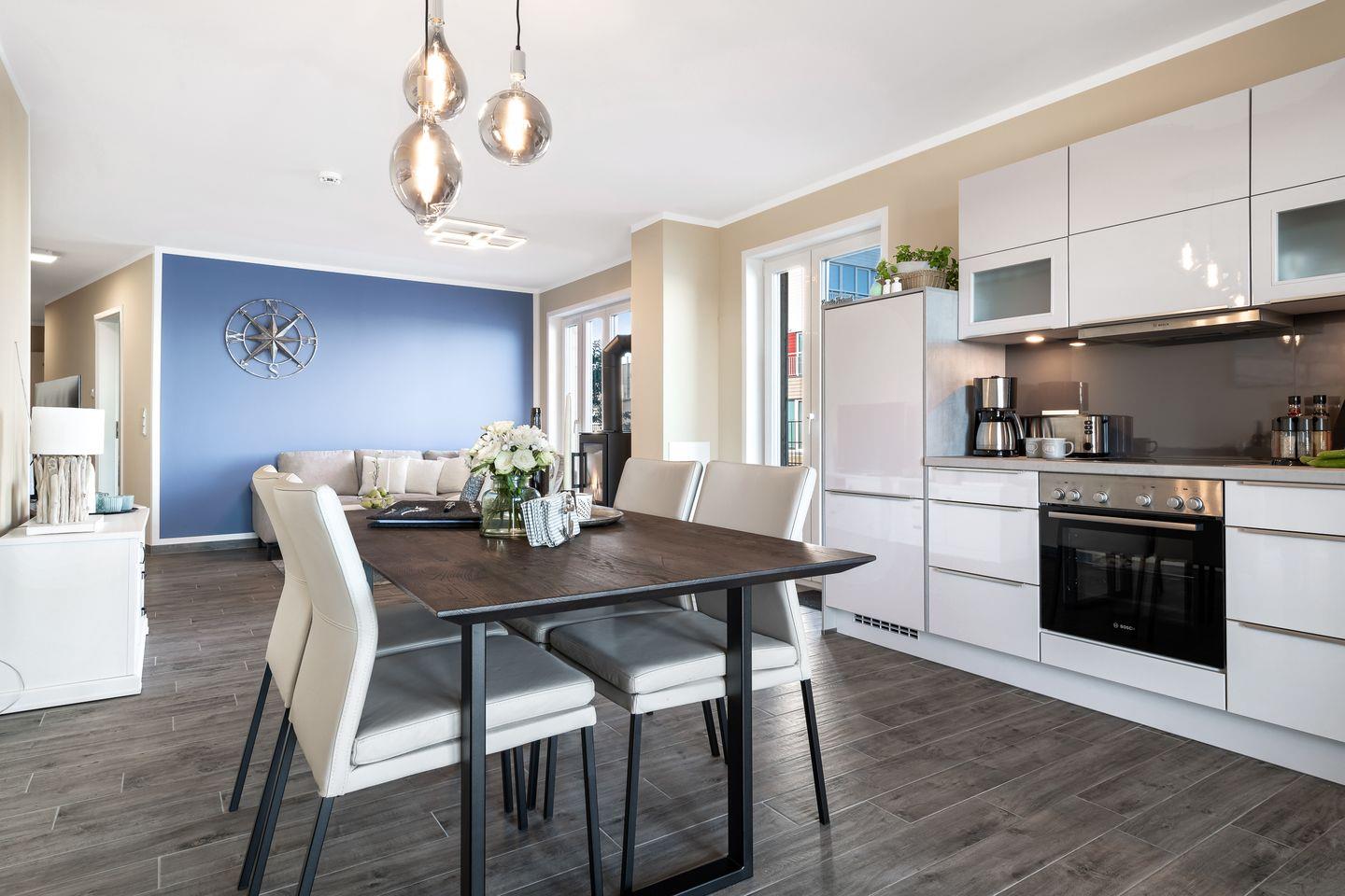 Der helle Wohnraum bietet ein bequemes Sofa mit Sessel und einen gemütlichen Esstisch, der zu entspannten Abenden vor dem Kamin einlädt. Die offene Küche ist in den Wohnraum integriert und ein Garant für geselliges Beisammensein, während regionale Spezialitäten in der voll ausgestatteten Küche zubereitet werden können. Die hyggelige Ausstattung dieses Apartments mit maritimen Details bietet den perfekten Rahmen, um einen erholsamen Urlaub in Wohlfühlatmosphäre zu genießen.