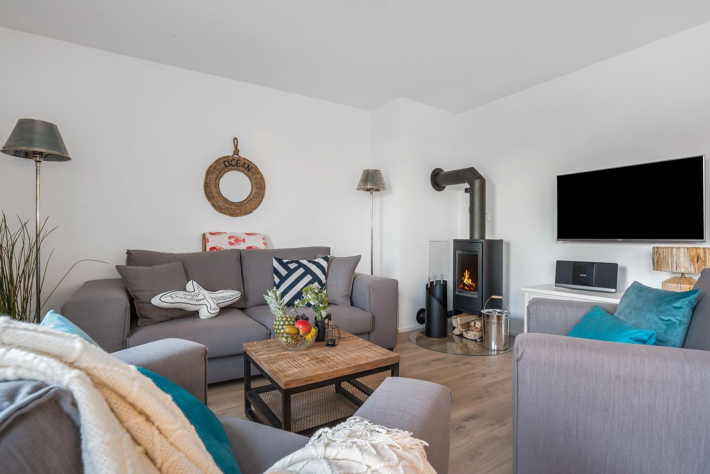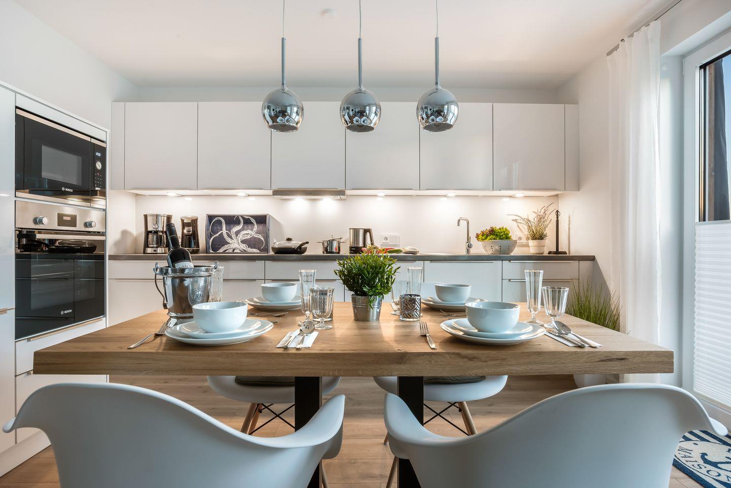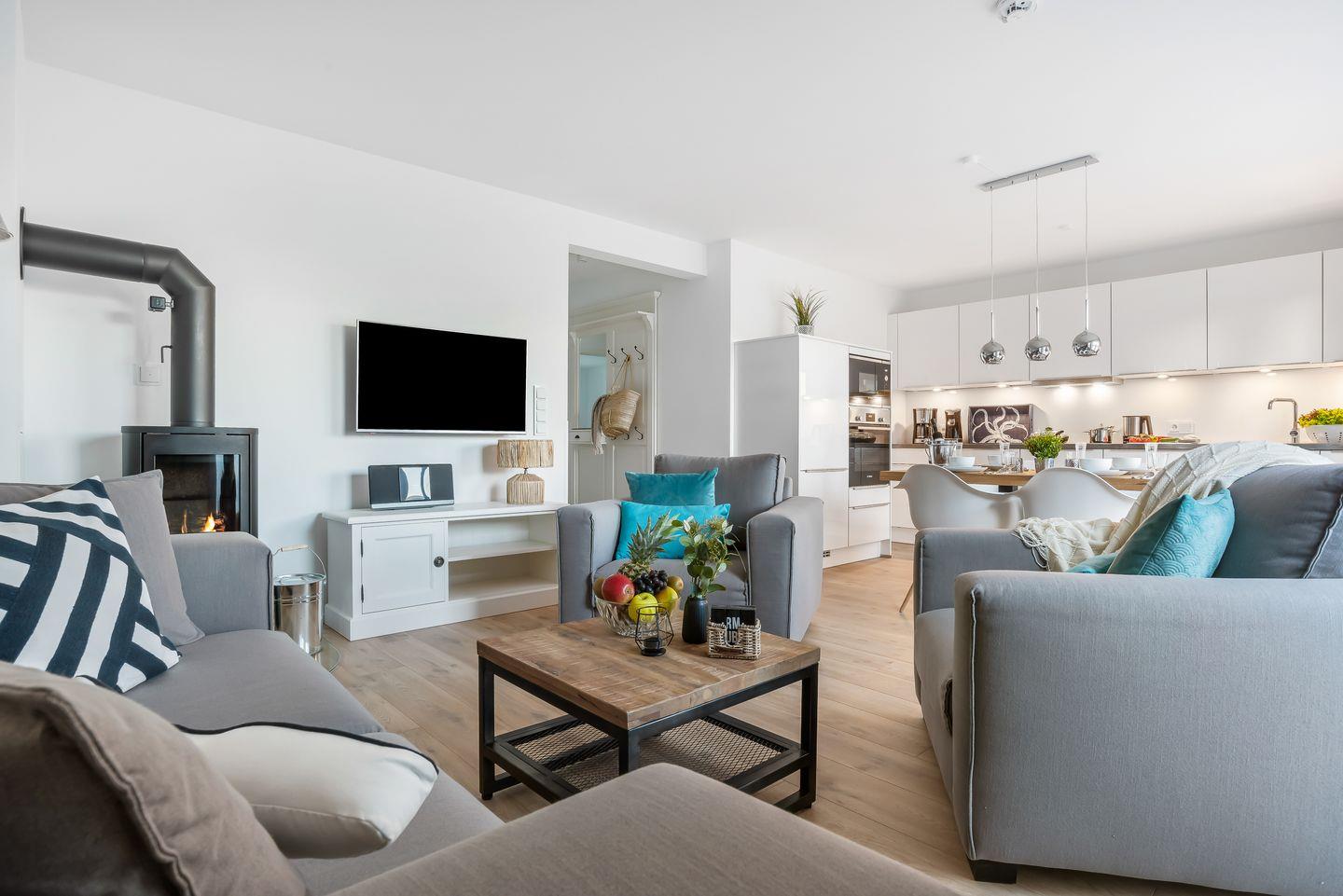 Der lichtdurchflutete Wohn- und Essbereich mit bodentiefen Fenstern und offener Küche lädt zu entspannten Stunden und geselligen Spielabenden ein. Machen Sie es sich auf der Couch oder in den zwei gemütlichen Sesseln vor dem Smart-TV bequem und genießen Sie den Luxus einer Fußbodenheizung und die gemütliche wärme des Kaminofens.