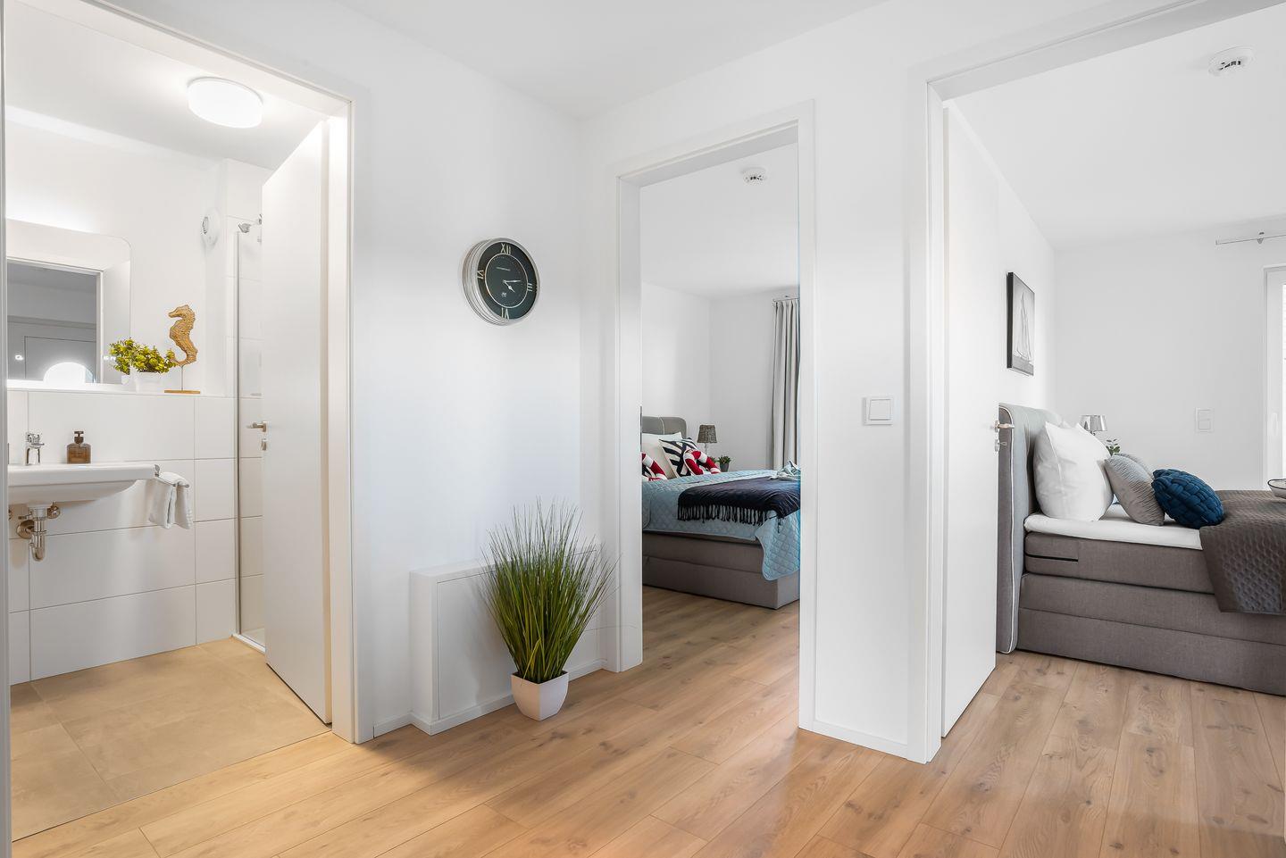 Lassen Sie sich von der einzigartigen Lage der Erdgeschosswohnung beeindrucken. Nur fünf Gehminuten trennen Sie vom malerischen Weidefelder Strand, wo Gastronomie und Strandkörbe zum Entspannen auf Sie warten.
