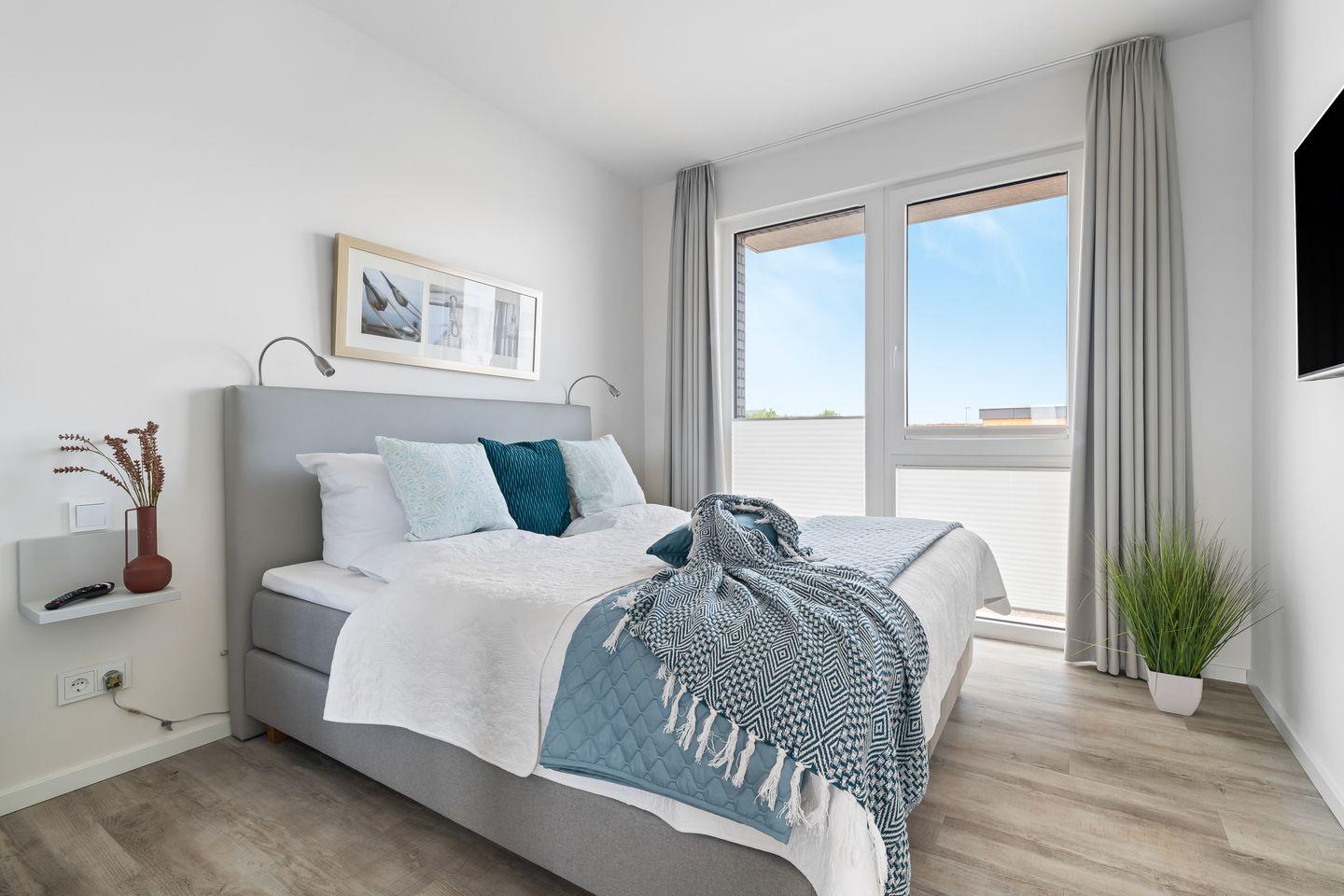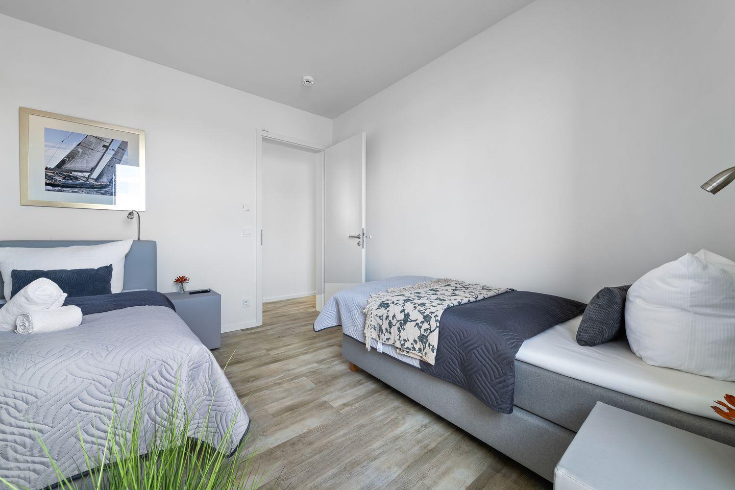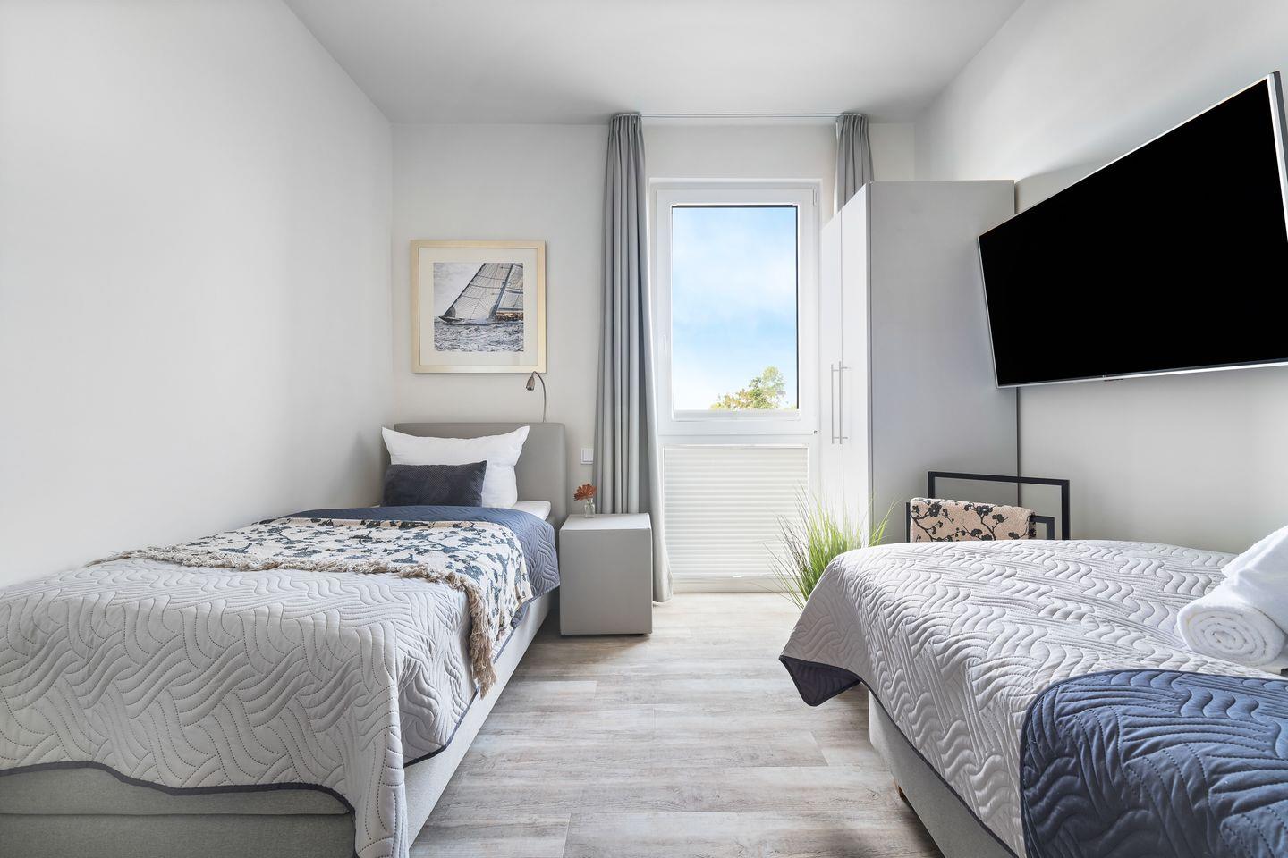 Das Apartment "BeachTerraceOne“, bietet zwei Schlafzimmer, ausgestattet mit hochwertigen Boxspringbetten für einen erholsamen Schlaf. Entspannen Sie sich in der finnischen Sauna oder genießen Sie ein Bad in der großzügigen Wanne.