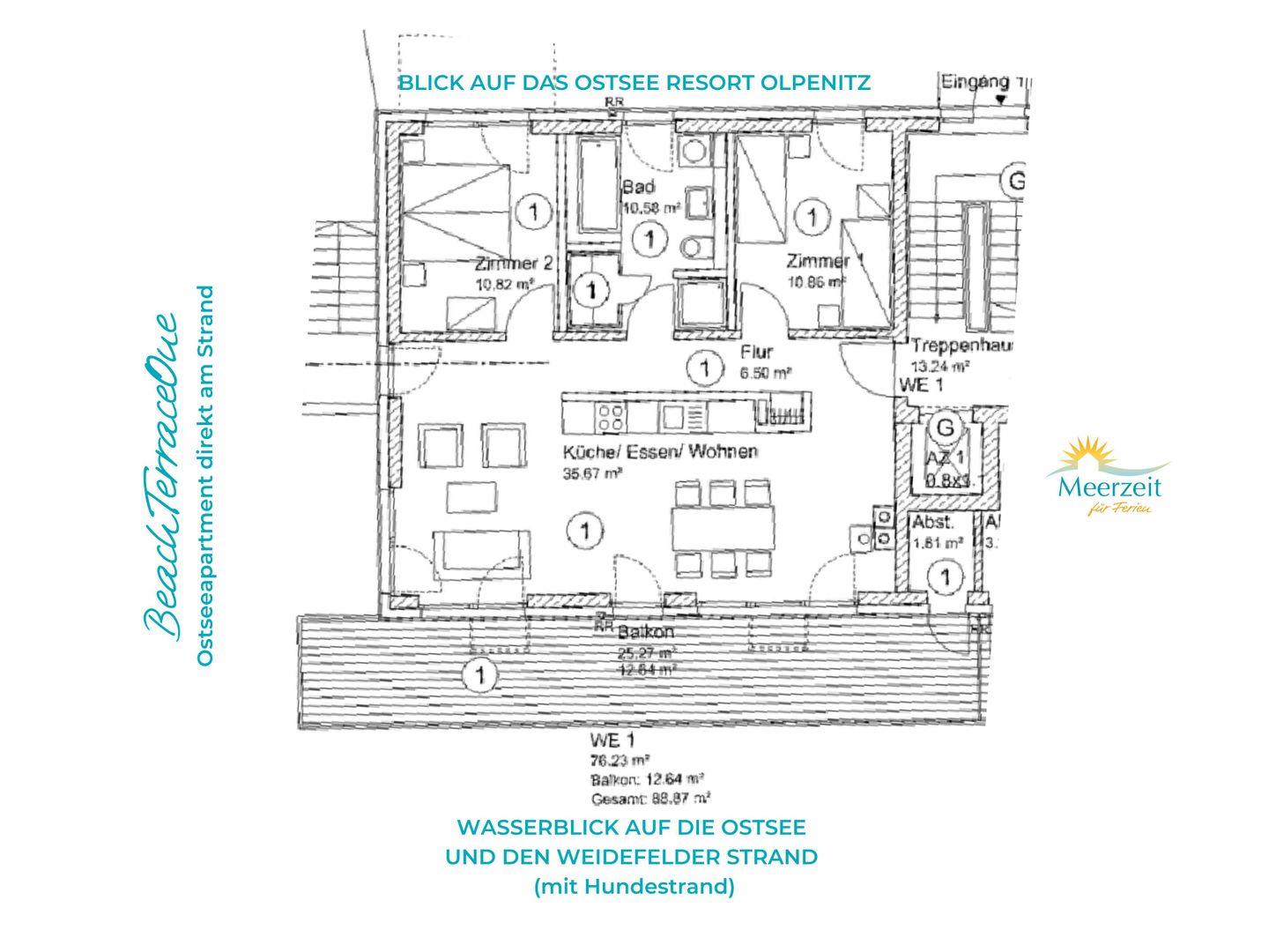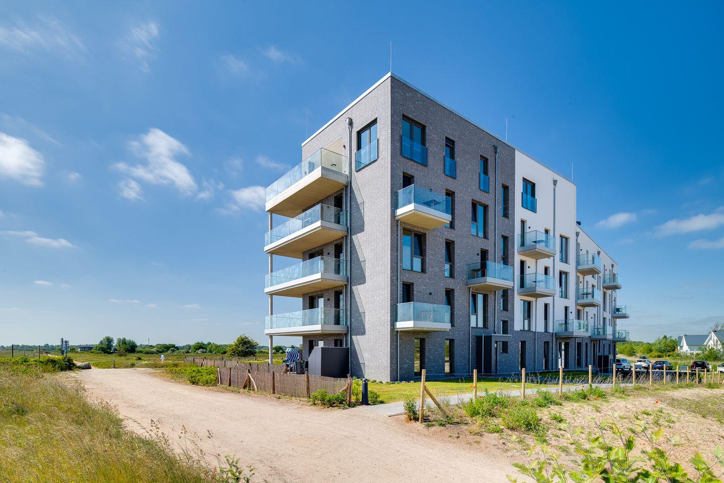 Ostseeurlaub in moderner Ferienwohnung mit Meerblick Terrasse direkt am Weidefelder Strand - Genießen Sie exklusives Wohnen im Apartment "BeachTerraceOne", gelegen im Erdgeschoss eines modernen Hauses mit Aufzug - Im Treppenhaus befinden sich 9 Stufen vom Eingang bis zur Wohnung. Die lichtdurchfluteten Räume mit bodentiefen Fenstern bieten einen spektakulären Meerblick direkt auf die Ostsee und laden zum Verweilen und Entspannen ein.