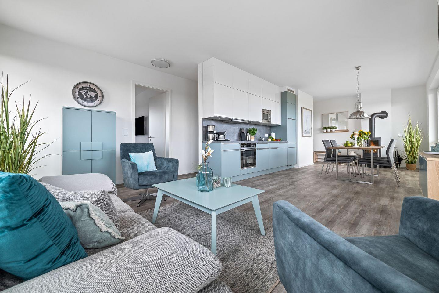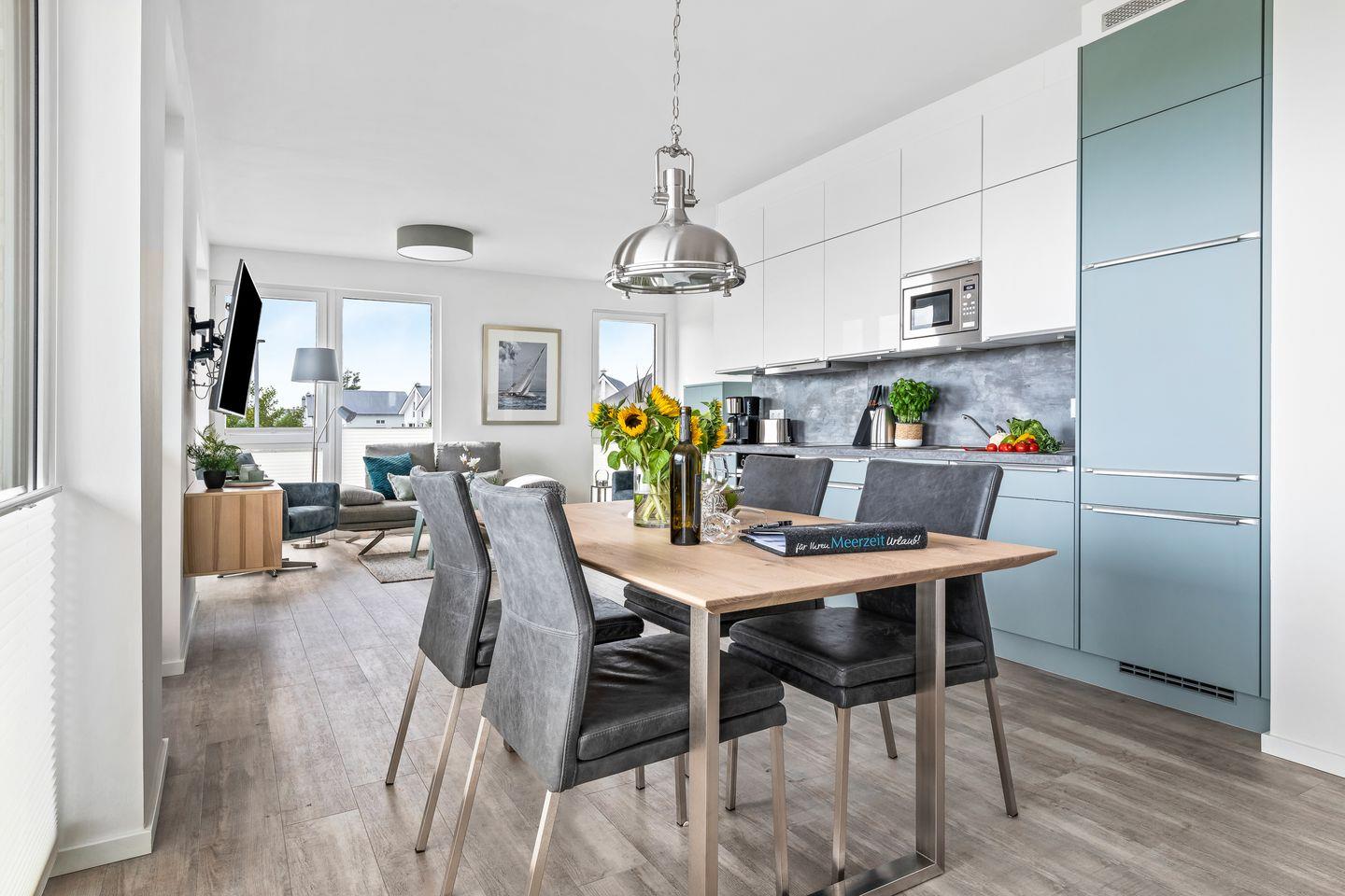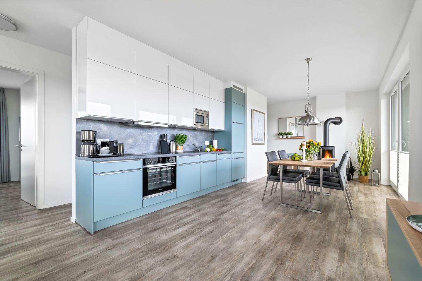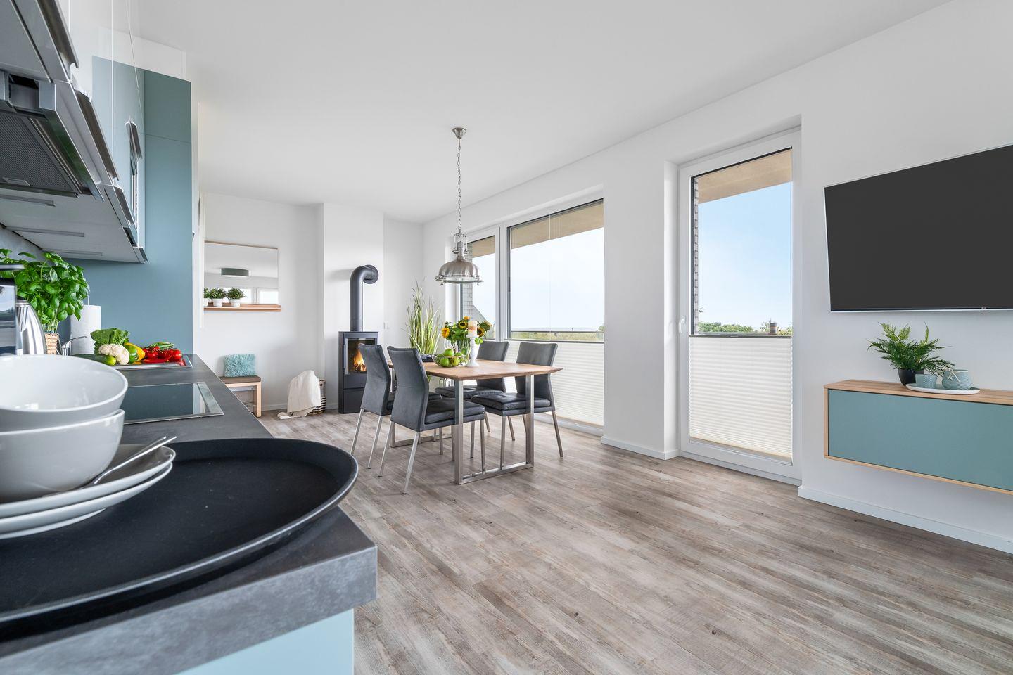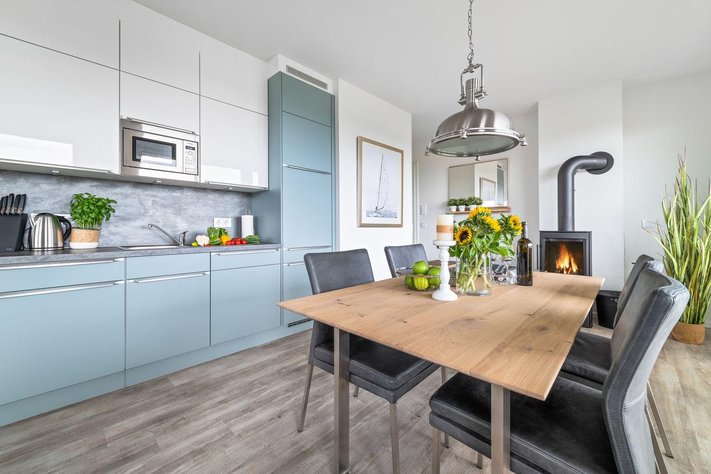 Der großzügige Wohn- und Essbereich ist der perfekte Ort für gesellige Stunden. Ausgestattet mit einer vollintegrierten Küche, können Sie hier kulinarische Köstlichkeiten zubereiten, während Sie den Blick auf die vorbeiziehenden Segelboote genießen. In der kühleren Jahreszeit sorgt der Kamin für gemütliche Atmosphäre.