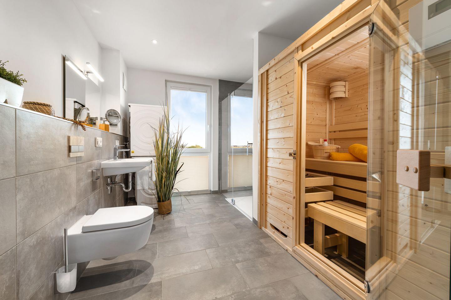 Das Apartment "BeachWaveThree" bietet zwei Schlafzimmer, ausgestattet mit hochwertigen Boxspringbetten für einen erholsamen Schlaf. Entspannen Sie sich in der finnischen Sauna oder genießen Sie ein Bad in der großzügigen Wanne.