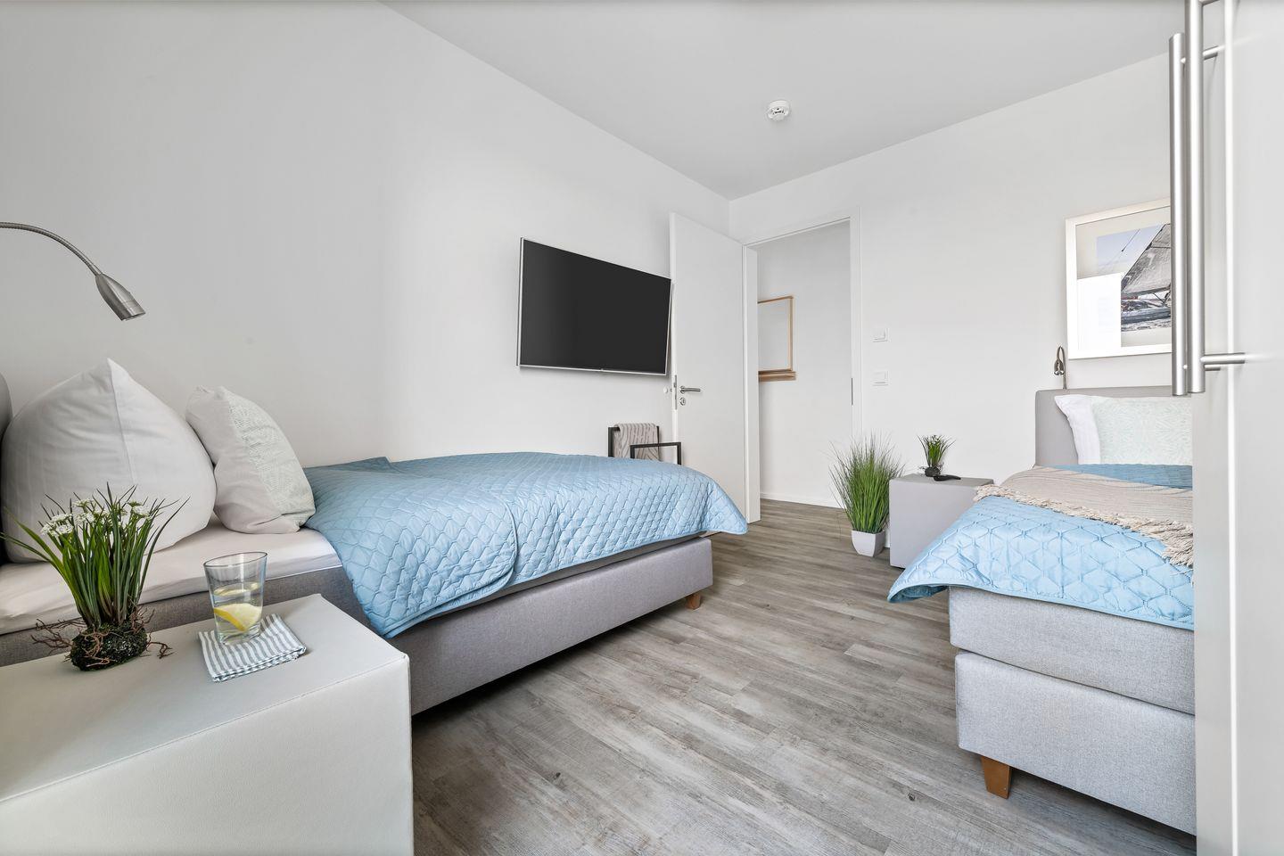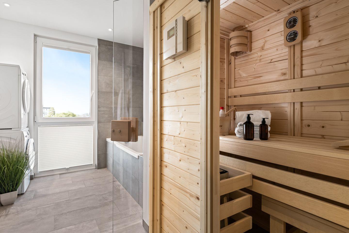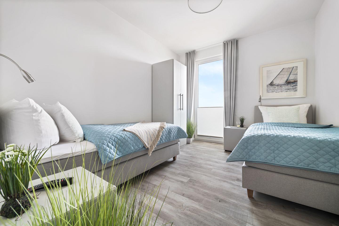 Das Apartment "BeachWaveFour" bietet zwei Schlafzimmer, ausgestattet mit hochwertigen Boxspringbetten für einen erholsamen Schlaf. Entspannen Sie sich in der finnischen Sauna oder genießen Sie ein Bad in der großzügigen Wanne.