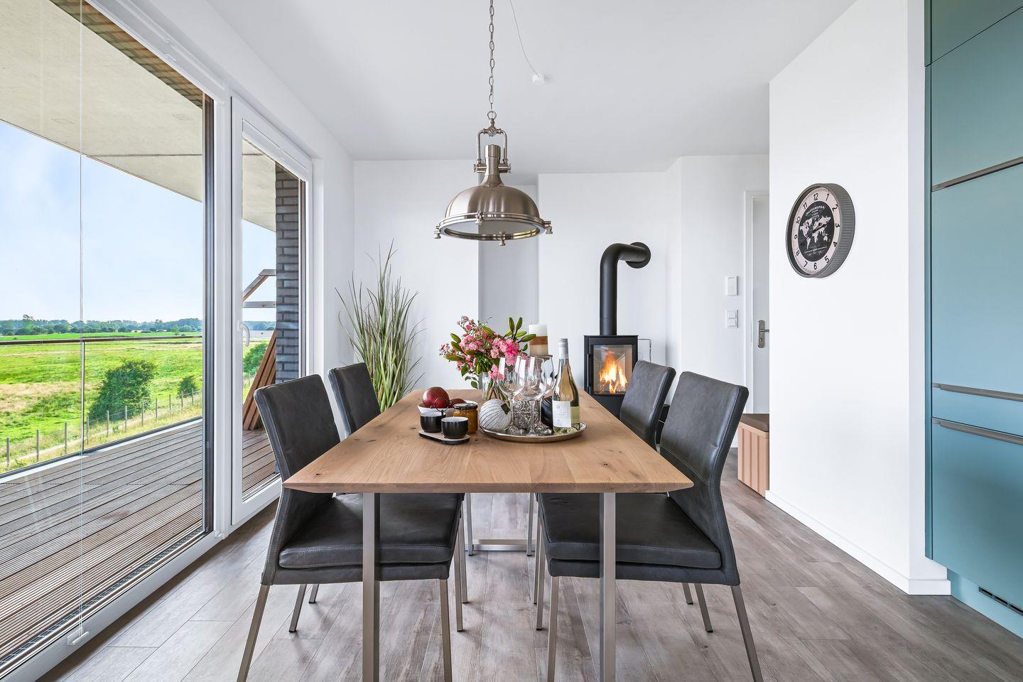 Der großzügige Wohn- und Essbereich ist der perfekte Ort für gesellige Stunden. Ausgestattet mit einer vollintegrierten Küche, können Sie hier leckere Mahlzeiten für Familie und Freunde zubereiten, während Sie den Blick auf die vorbeiziehenden Segelboote genießen. In der kühleren Jahreszeit sorgt der Kamin für gemütliche Atmosphäre.
