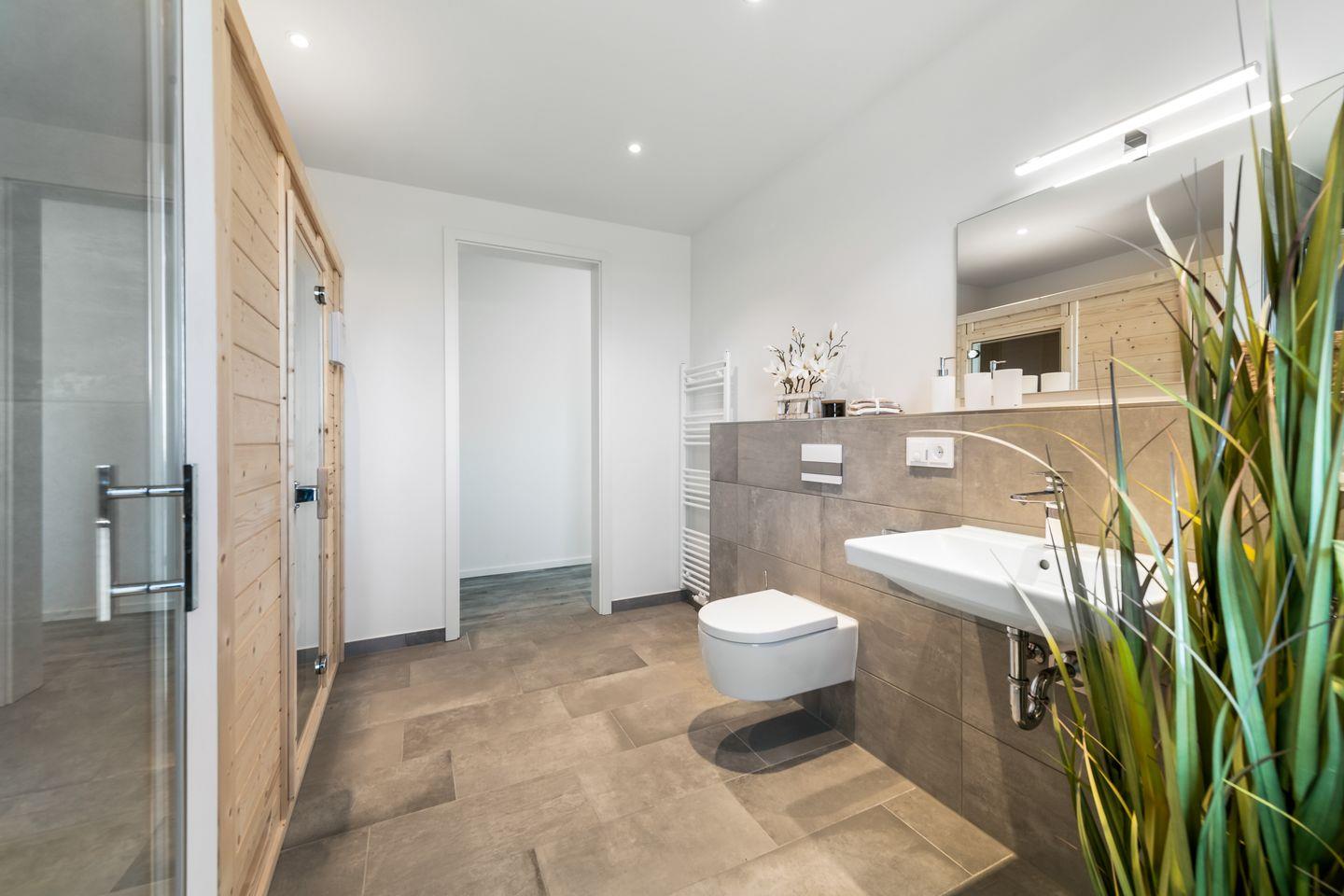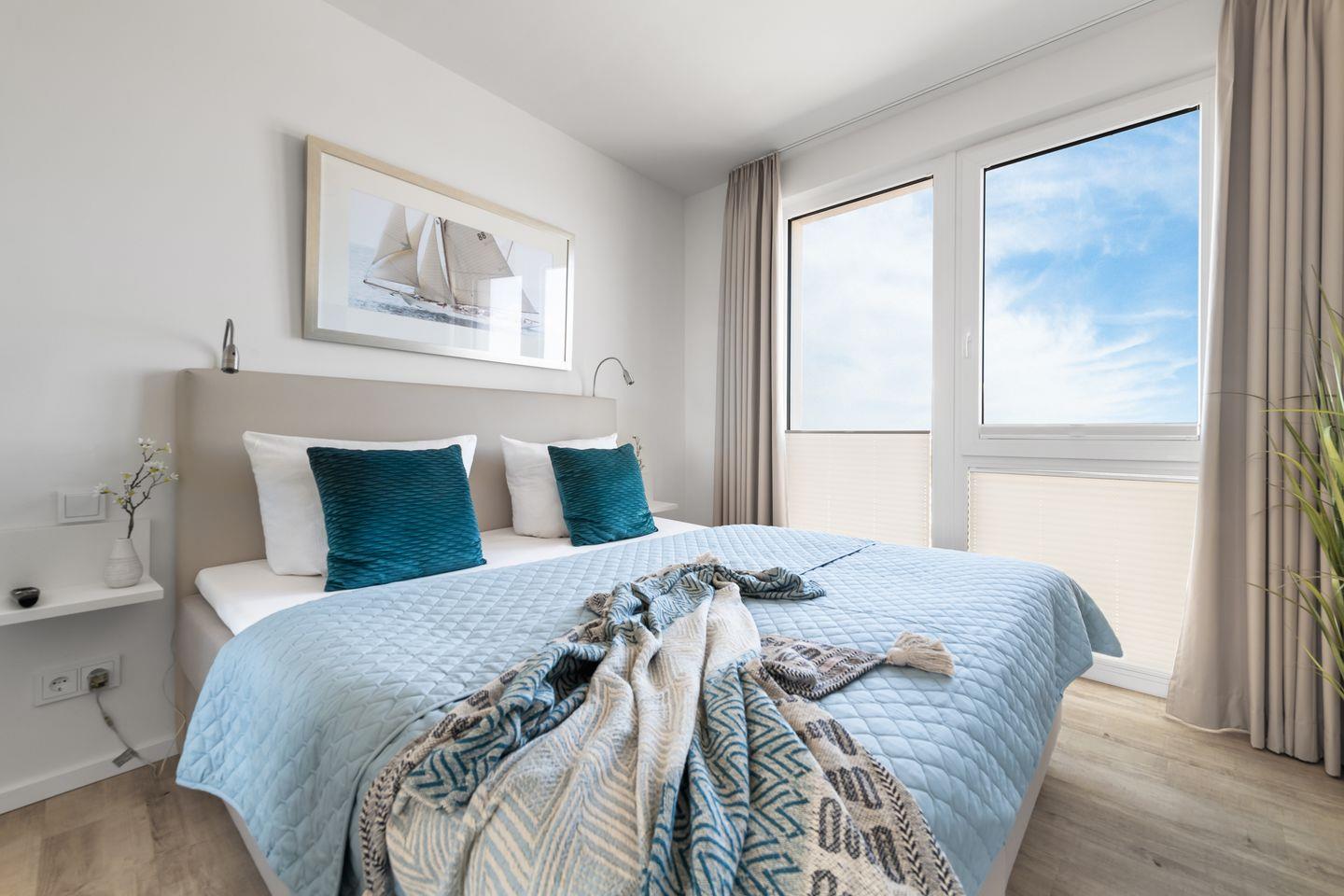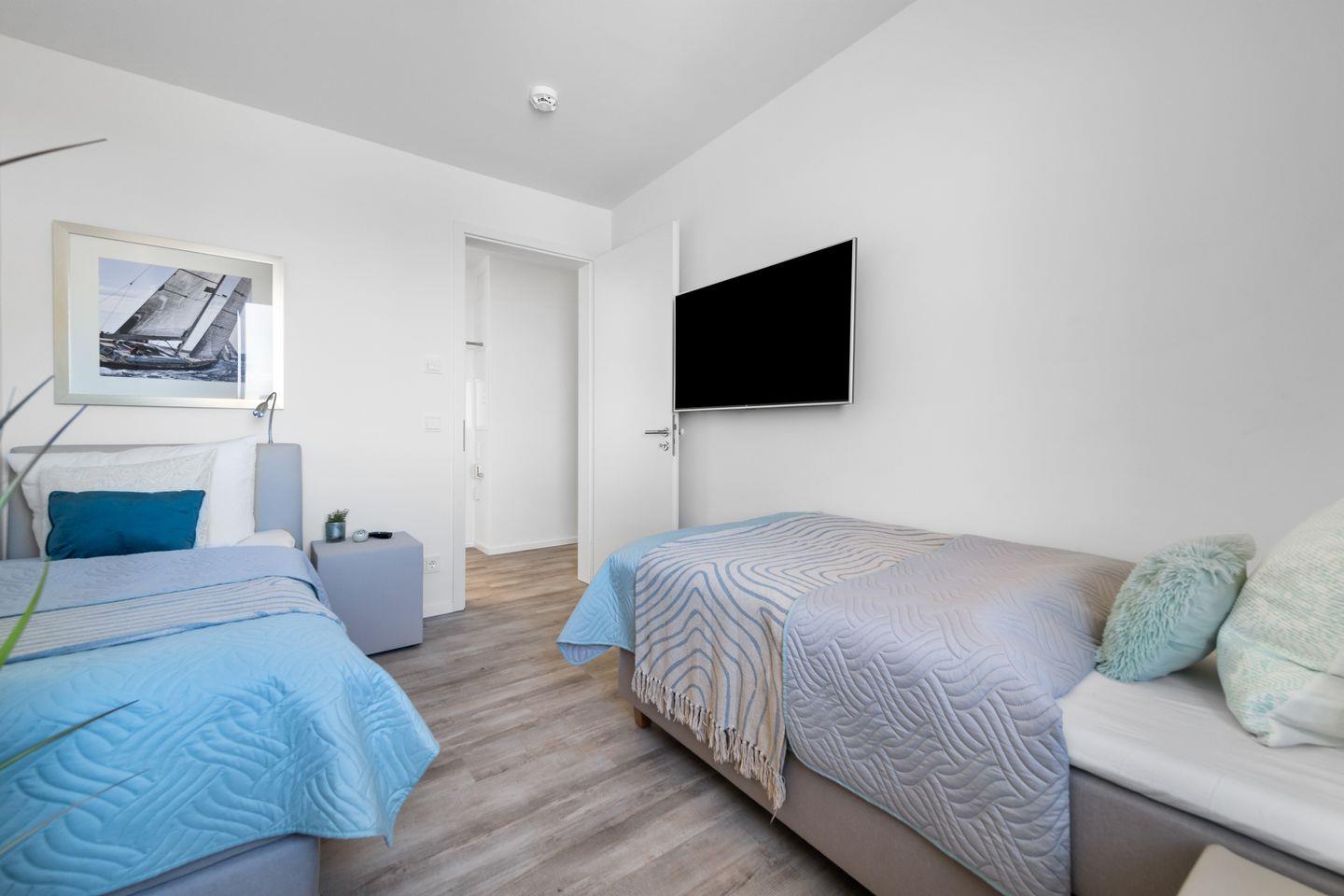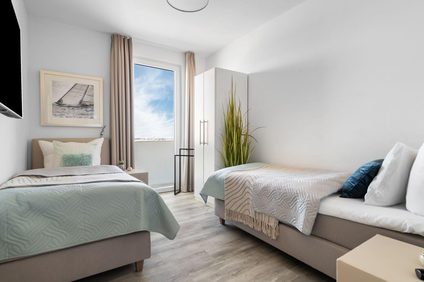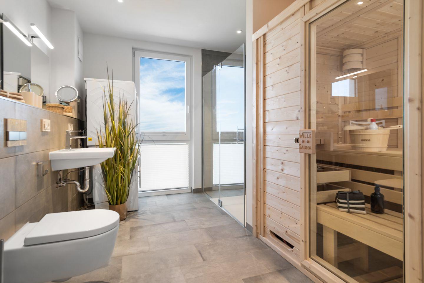 Das Apartment "BeachViewThree" bietet zwei Schlafzimmer, ausgestattet mit hochwertigen Boxspringbetten für einen erholsamen Schlaf. Entspannen Sie sich in der finnischen Sauna oder genießen Sie ein Bad in der großzügigen Wanne.