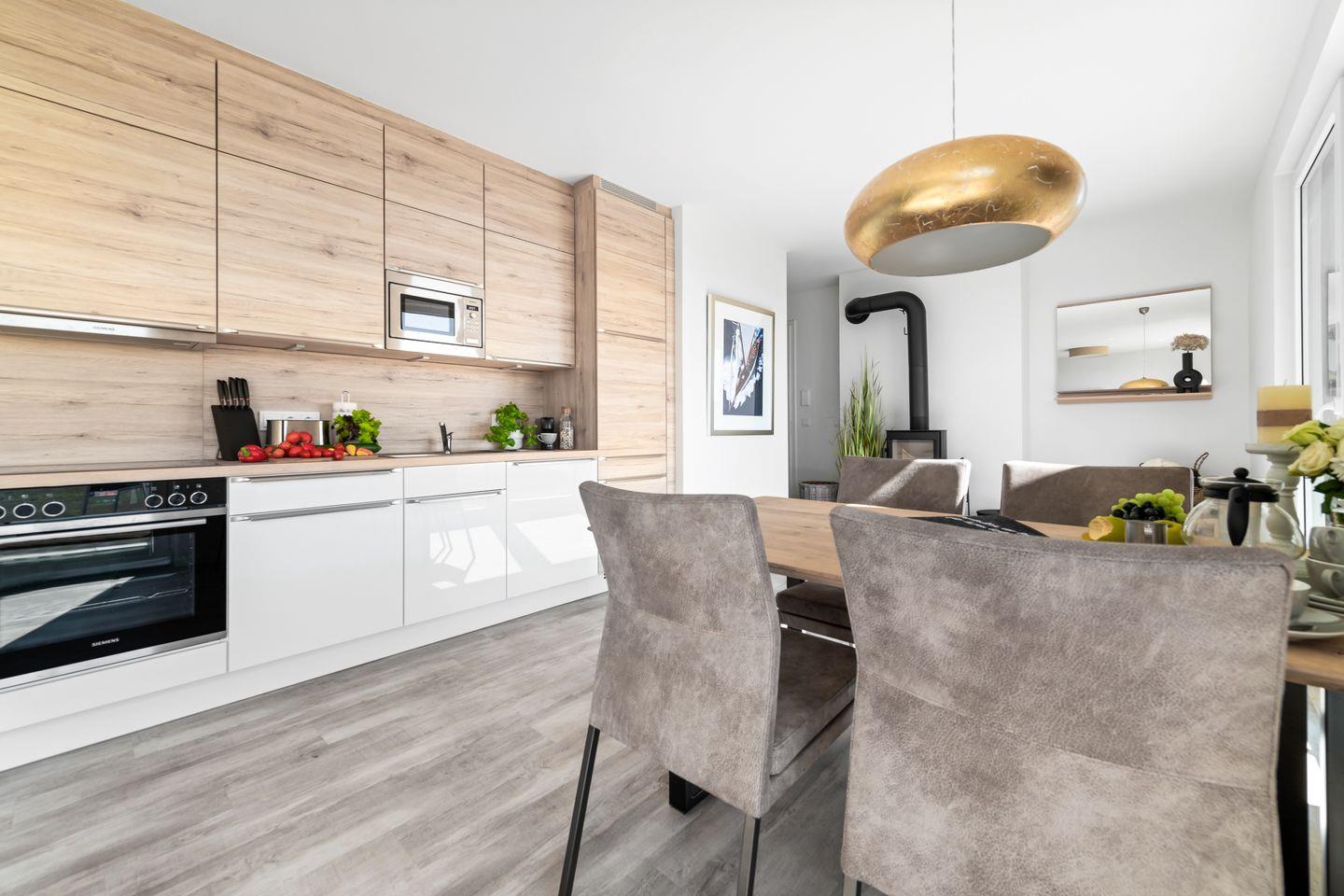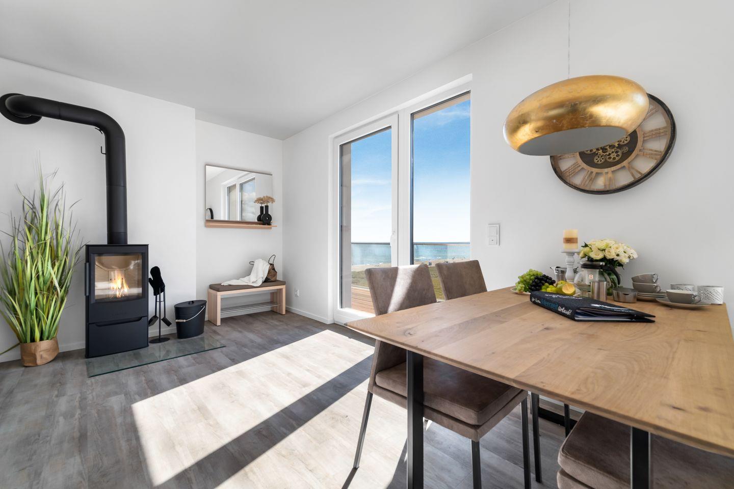 Der großzügige Wohn- und Essbereich ist der perfekte Ort für gesellige Stunden. Ausgestattet mit einer vollintegrierten Küche, können Sie hier leckere Mahlzeiten für Familie und Freunde zubereiten, während Sie den Blick auf die vorbeiziehenden Segelboote genießen. In der kühleren Jahreszeit sorgt der Kamin für gemütliche Atmosphäre.