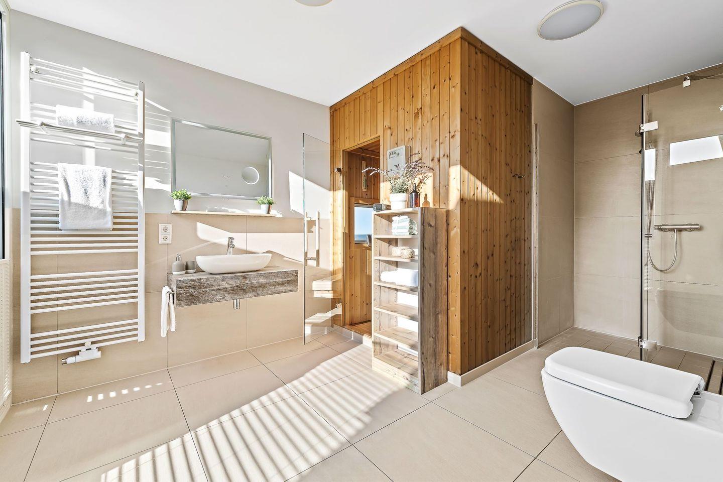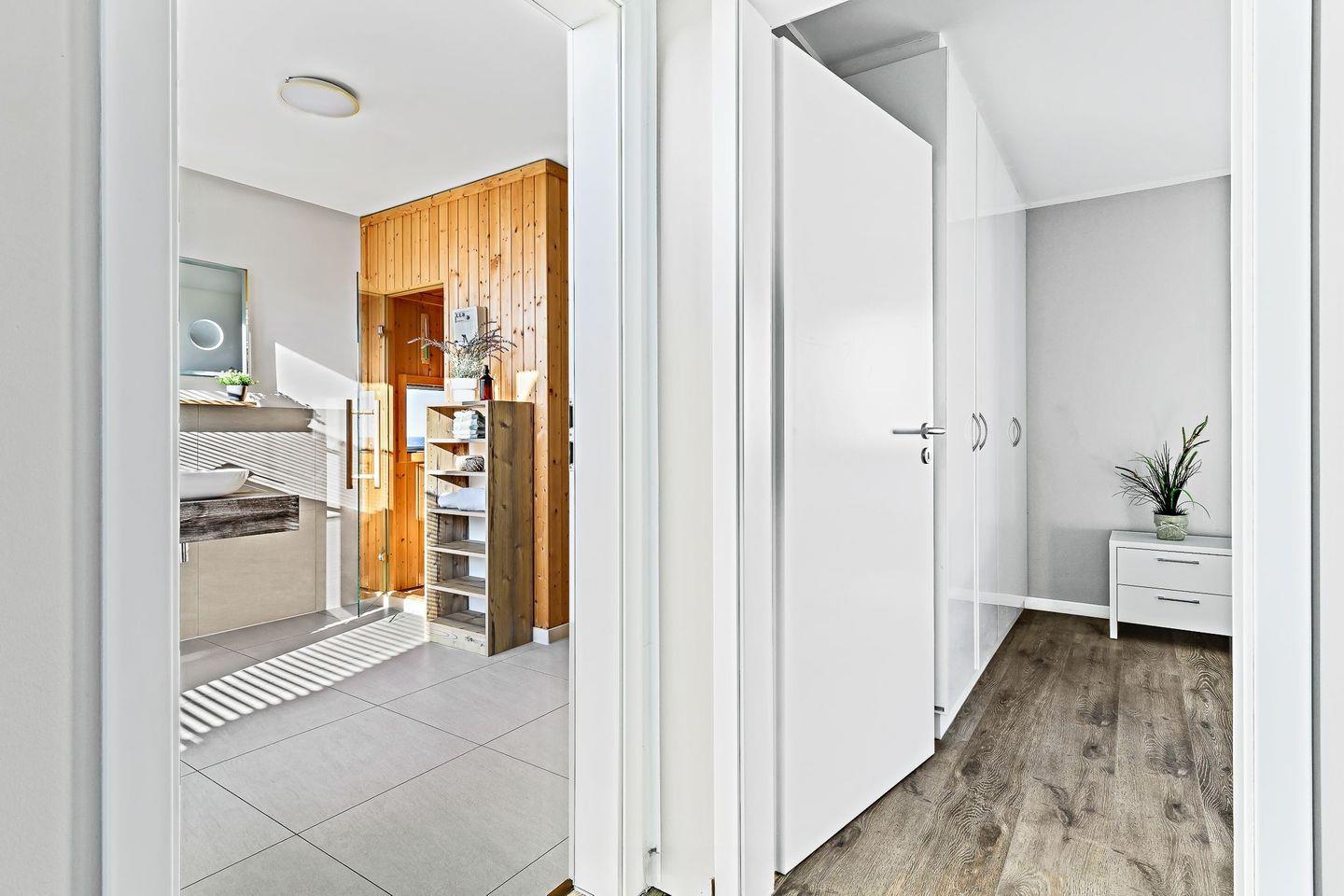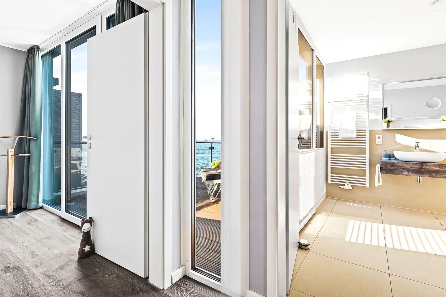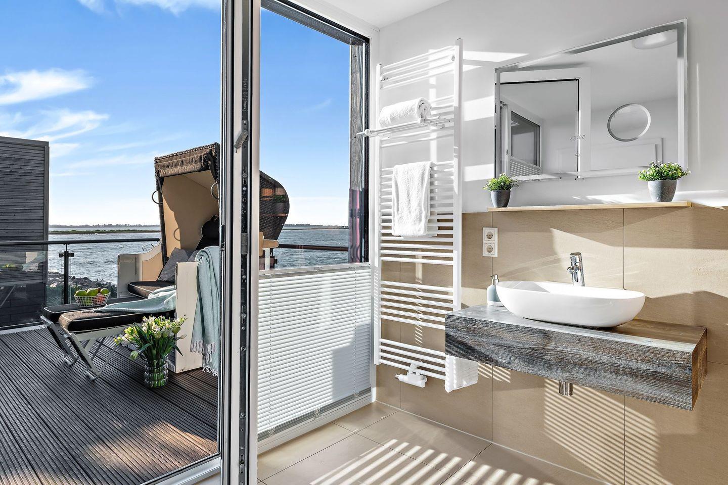 Das Bad mit ebenerdiger Dusche und finnischer Sauna hat, wie das große Schlafzimmer auch, einen Zugang zum Balkon. Sogar aus der Sauna kann der wunderbare Meerblick genossen werden. Die Terrasse im Erdgeschoss ist mit Gartenmöbeln und einem Grill ausgestattet. Neben dem Stellplatz befindet sich ein abschließbarer Abstellraum, der für Fahrräder genutzt werden kann.