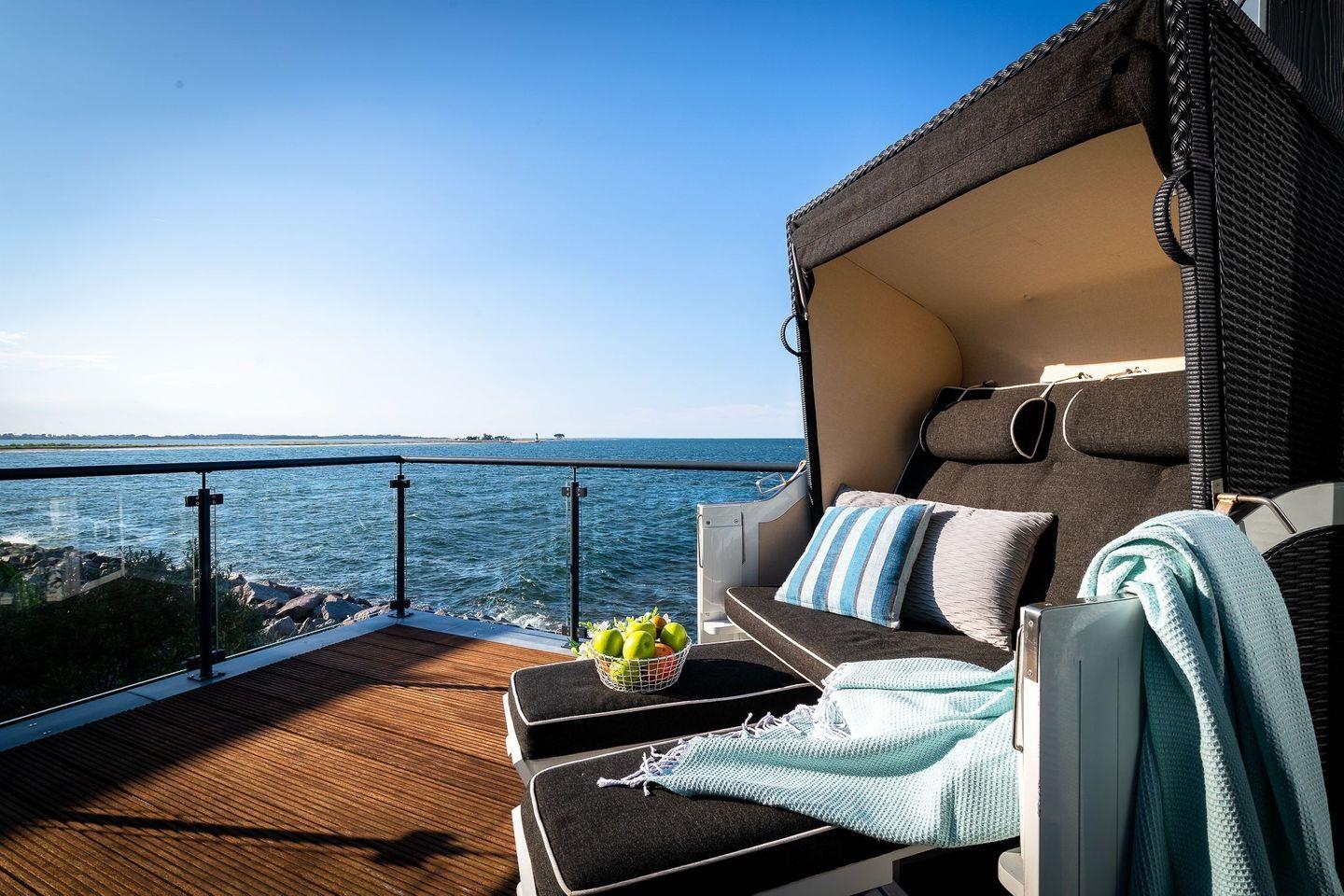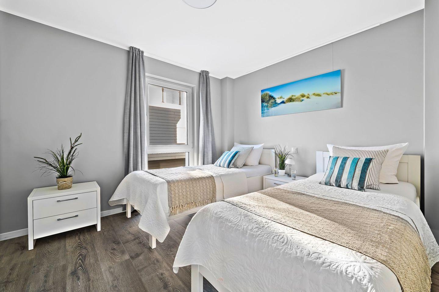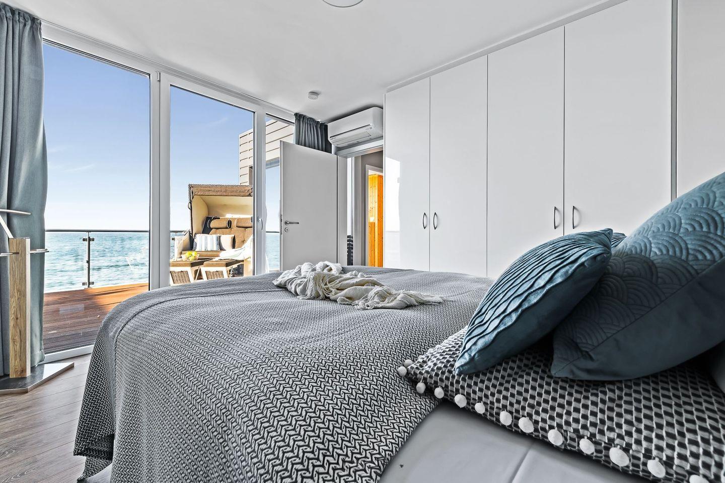Die zwei gemütlichen Schlafzimmer befinden sich im oberen Stockwerk und sind über eine helle Treppe zu erreichen. Der Masterbedroom mit Doppelbett ist, mit seinem großen Balkon und dem dort stehenden Strandkorb, der ideale Ort zum Relaxen und Träumen. Morgens aufwachen und den ersten Kaffee direkt mit Blick auf die Ostsee genießen. Das zweite Schlafzimmer verfügt über zwei Einzelbetten und ein zusätzliches TV-Gerät.In beiden Zimmern nehmen große Kleiderschränke die Reisegarderobe auf.