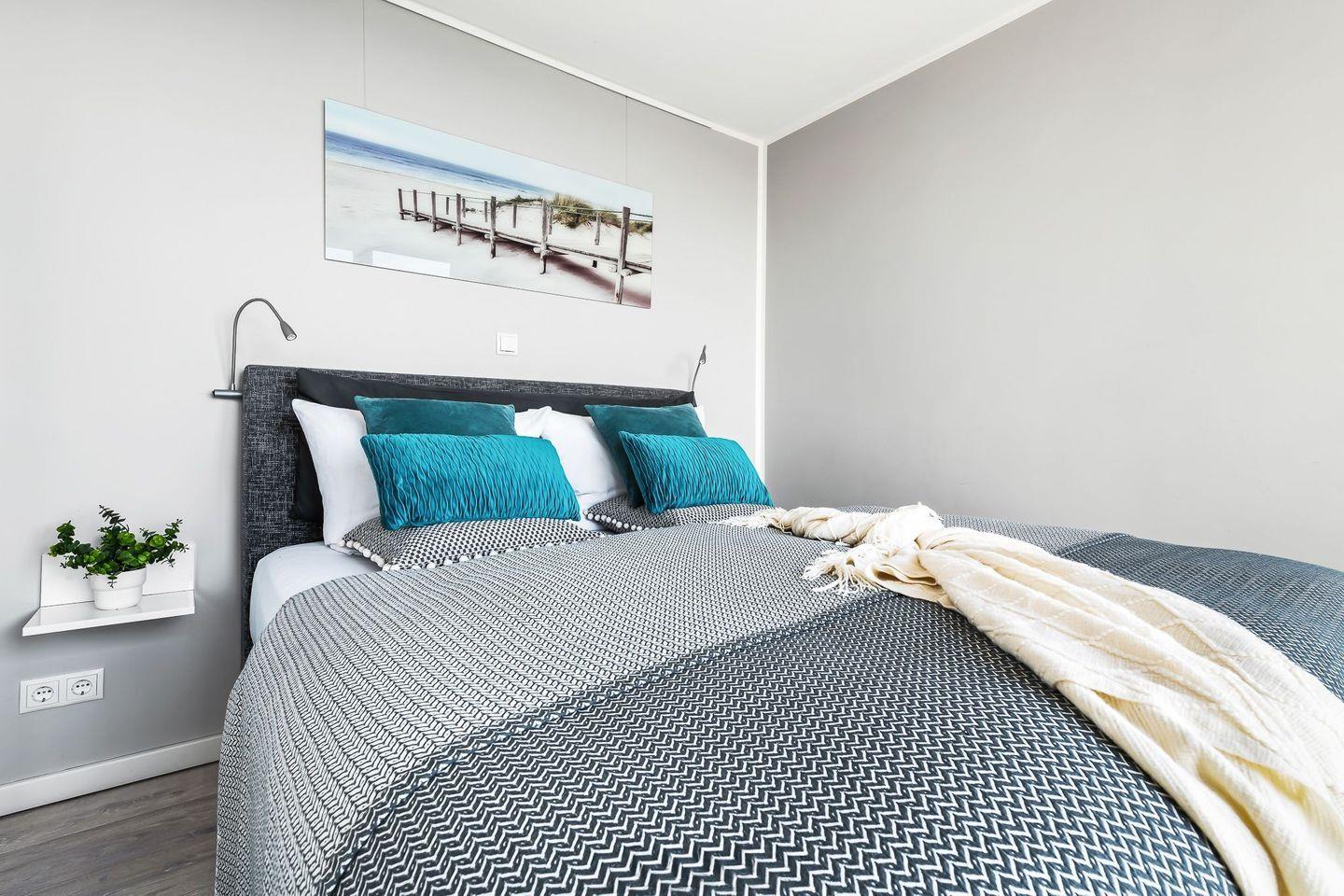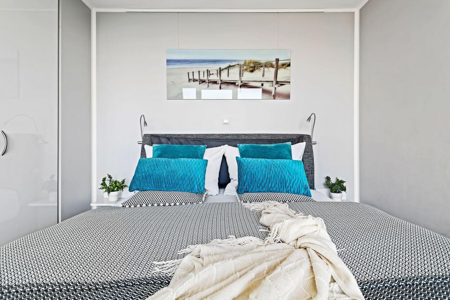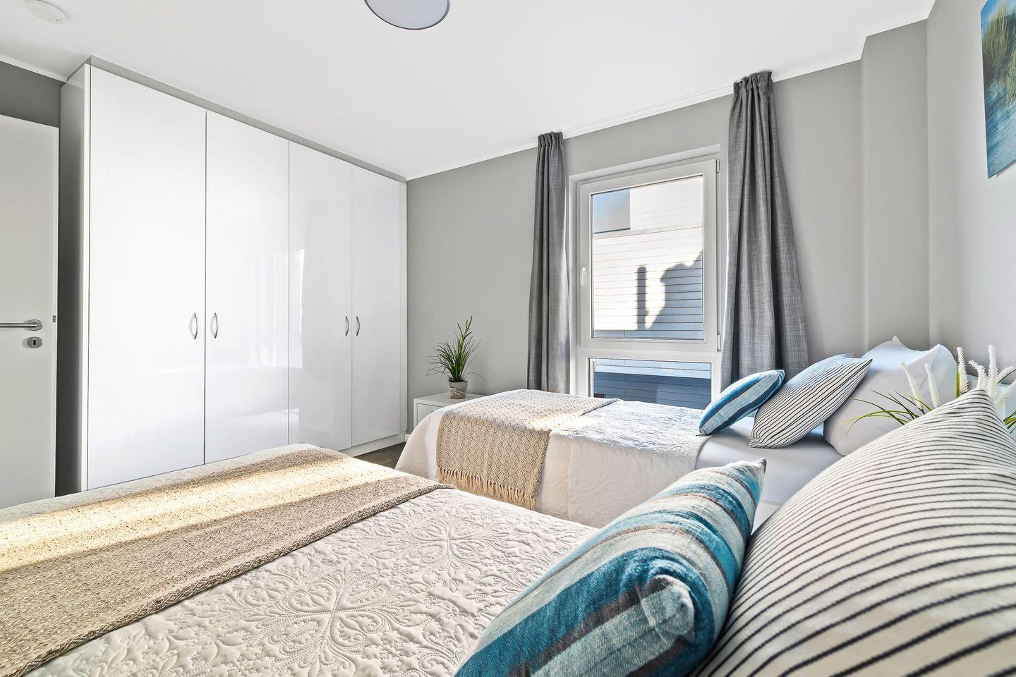 Die zwei gemütlichen Schlafzimmer befinden sich im oberen Stockwerk und sind über eine helle Treppe zu erreichen. Der Masterbedroom mit Doppelbett ist, mit seinem großen Balkon und dem dort stehenden Strandkorb, der ideale Ort zum Relaxen und Träumen. Morgens aufwachen und den ersten Kaffee direkt mit Blick auf die Ostsee genießen. Das zweite Schlafzimmer verfügt über zwei Einzelbetten und ein zusätzliches TV-Gerät.In beiden Zimmern nehmen große Kleiderschränke die Reisegarderobe auf.