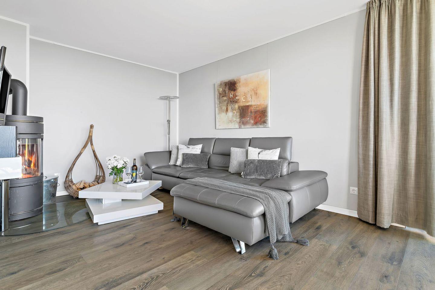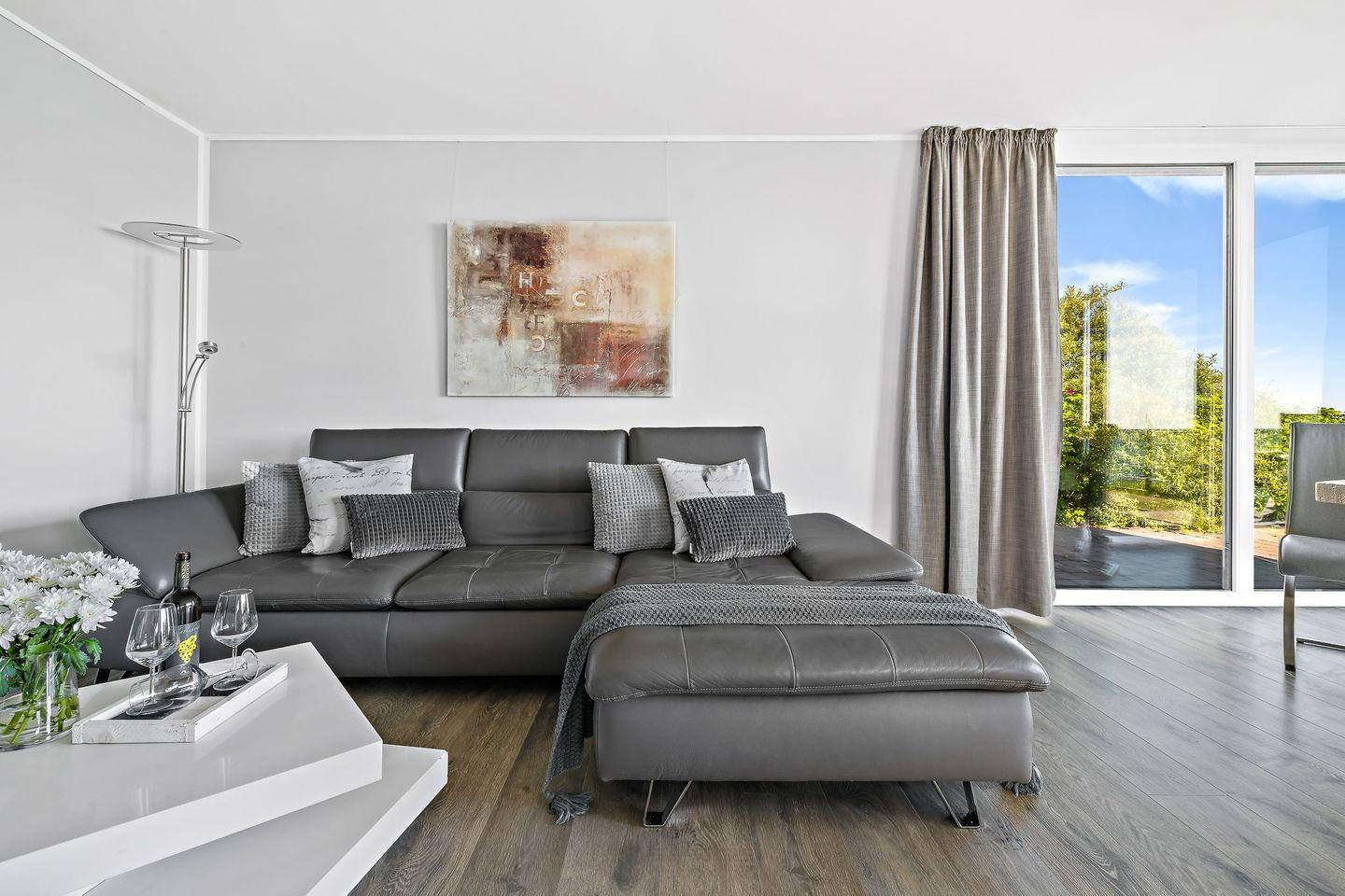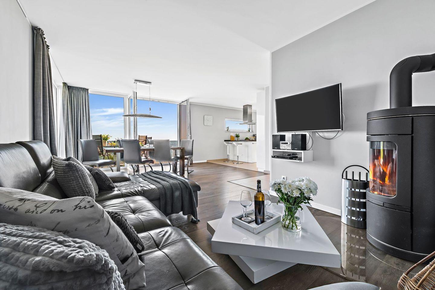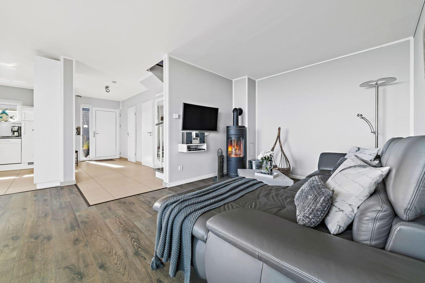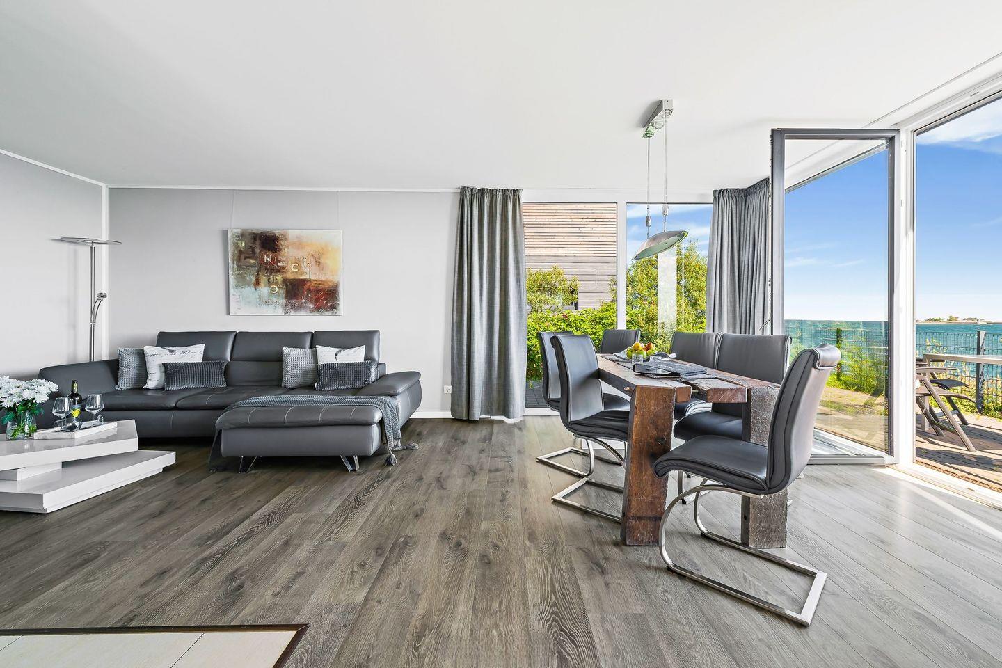 Für mehr „Meer“ lädt ein wunderschön angelegter Privatstrand in einer Entfernung von ca. 300 m Alt und Jung zum Verweilen oder Schwimmen ein. Der Eingang im Erdgeschoss ist vom Stellplatz aus über eine Treppe gut erreichbar. Dort erwartet den Gast ein offener Wohn-, Essbereich mit einer gemütlichen Sitzecke, Kaminofen und Flachbildschirm. Das Mobiliar, wie auch die Räume, sind in hellen, fein nuancierten Farben gehalten, sodass man sich in dem Haus gleich hyggelig fühlen kann. Eine Fußbodenheizung wird, gerade an ungemütlichen Tagen, zusätzlich für wohlige Wärme sorgen.