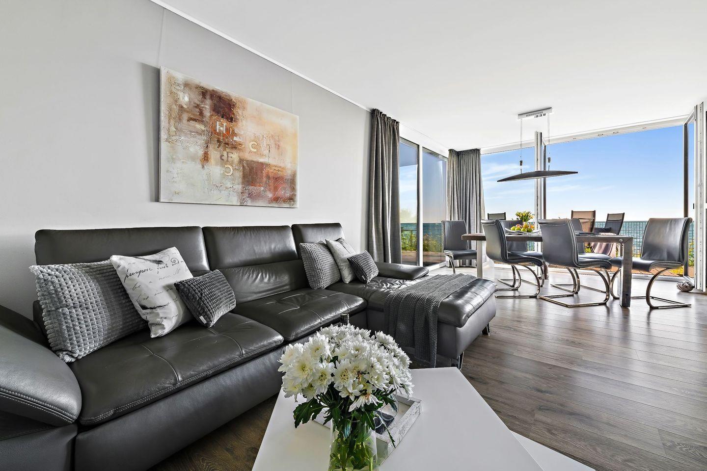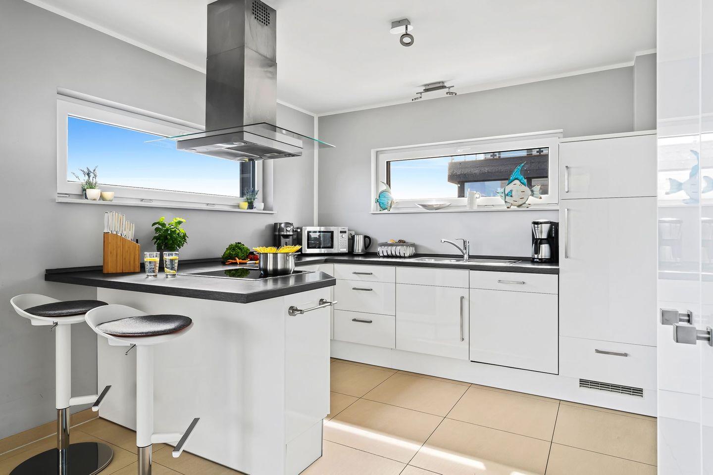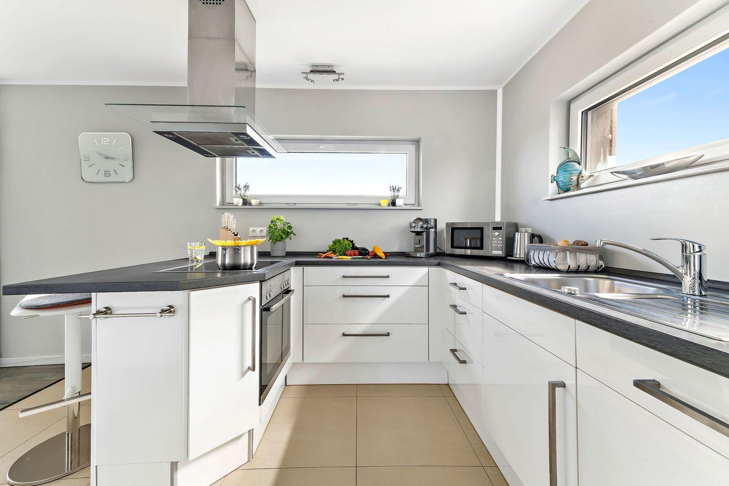 Vom Esstisch aus hat man einen unvergleichlichen Blick auf das offene Meer mit all seinen vielfältigen Facetten. So kann man schon beim Frühstück vorbeiziehende Segelschiffe beobachten. Entspannung pur ist da garantiert! Durch die bodentiefen Fenster gelangt man auf die schöne Terrasse, welche mit hochwertigem Mobiliar ausgestattet ist. Eine voll ausgestattete, moderne und offene Küche, die zum Kochen in kleiner, oder auch größerer Runde einlädt, schließt sich hieran an. Des Weiteren verfügt die untere Etage über ein Gäste-WC, sowie einen Hauswirtschaftsraum mit Waschmaschine.