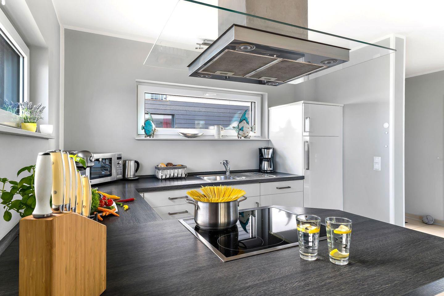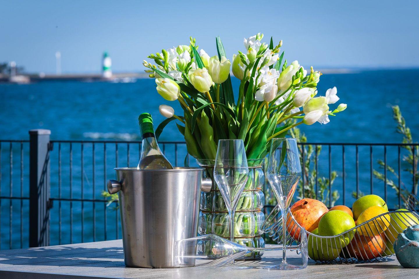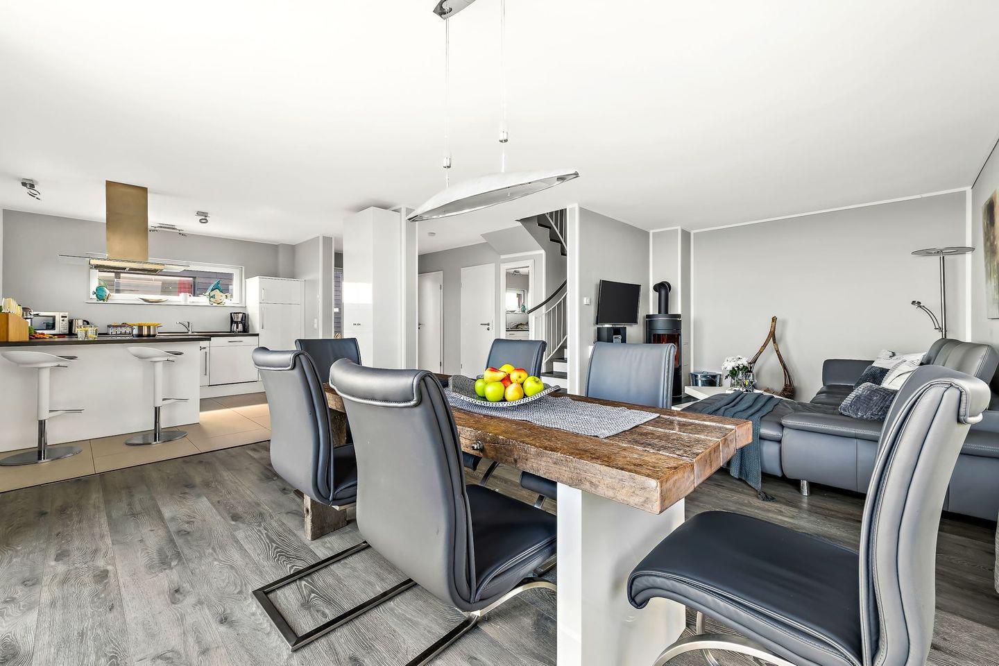 Vom Esstisch aus hat man einen unvergleichlichen Blick auf das offene Meer mit all seinen vielfältigen Facetten. So kann man schon beim Frühstück vorbeiziehende Segelschiffe beobachten. Entspannung pur ist da garantiert! Durch die bodentiefen Fenster gelangt man auf die schöne Terrasse, welche mit hochwertigem Mobiliar ausgestattet ist. Eine voll ausgestattete, moderne und offene Küche, die zum Kochen in kleiner, oder auch größerer Runde einlädt, schließt sich hieran an. Des Weiteren verfügt die untere Etage über ein Gäste-WC, sowie einen Hauswirtschaftsraum mit Waschmaschine.