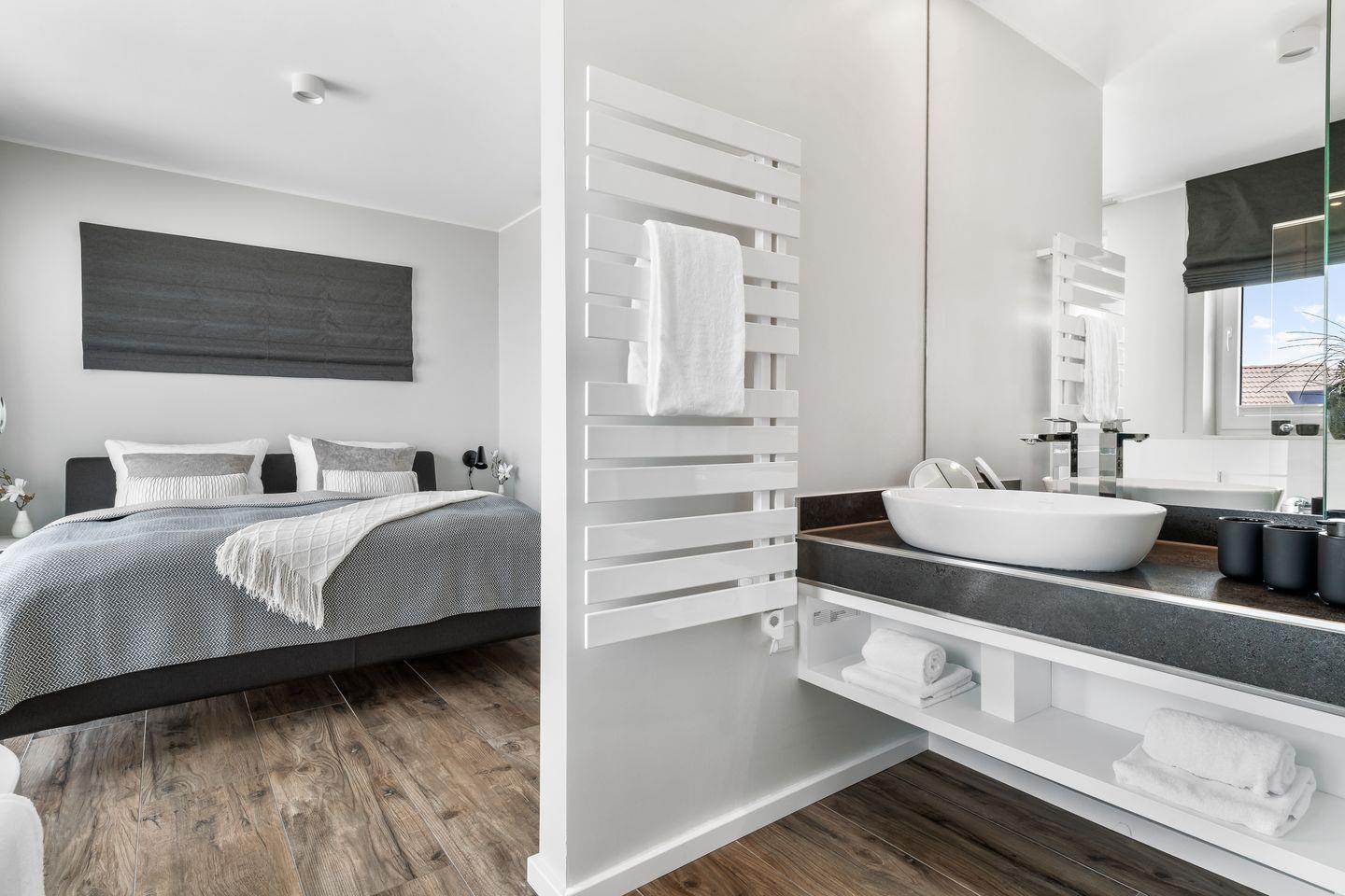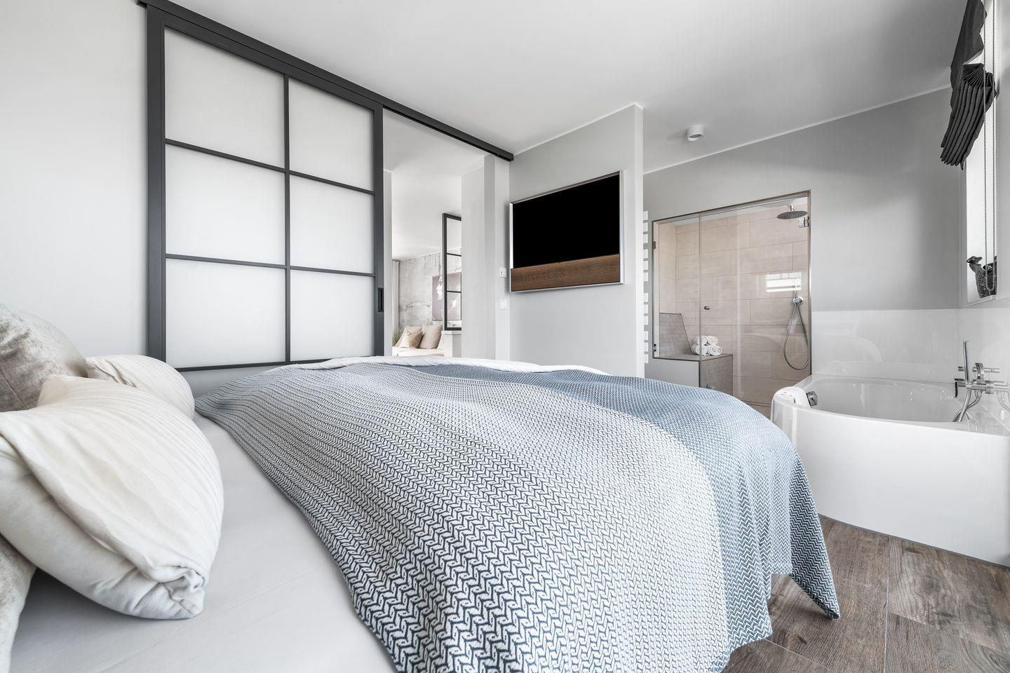 GEMÜTLICHES SCHLAFZIMMER MIT ANGRENZENDER BADEWANNE UND DAMPFSAUNA