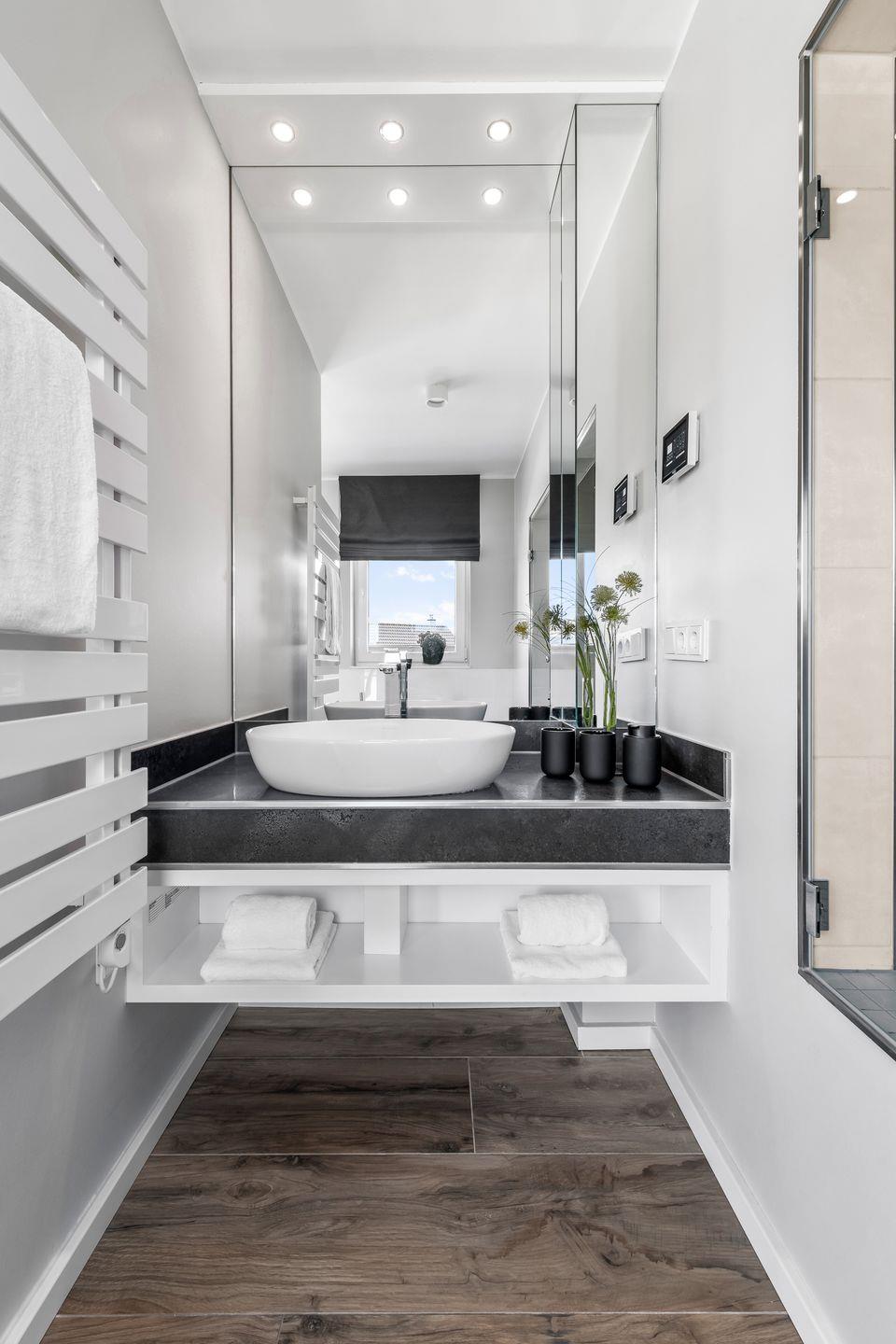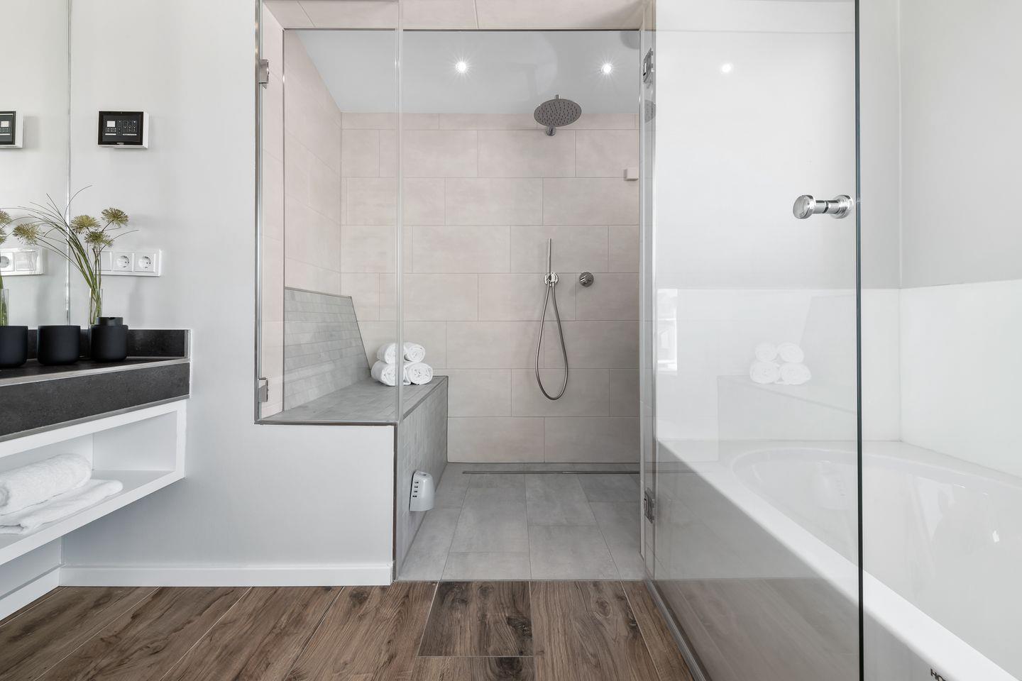 Der Masterbedroom verfügt über ein komfortables Doppelbett (1,80 x 2,00) mit direkt angrenzendem Badezimmer, das über einen großen Waschtisch, Badewanne und Dusche verfügt. Die große Dusche mit zwei gefliesten Sitzbänken bietet ein weiteres Highlight, da sie neben der Duschfunktion ebenso als Dampfsauna genutzt werden kann. Ein separates WC befindet sich abgetrennt durch eine Tür direkt neben dem Schlafzimmer.