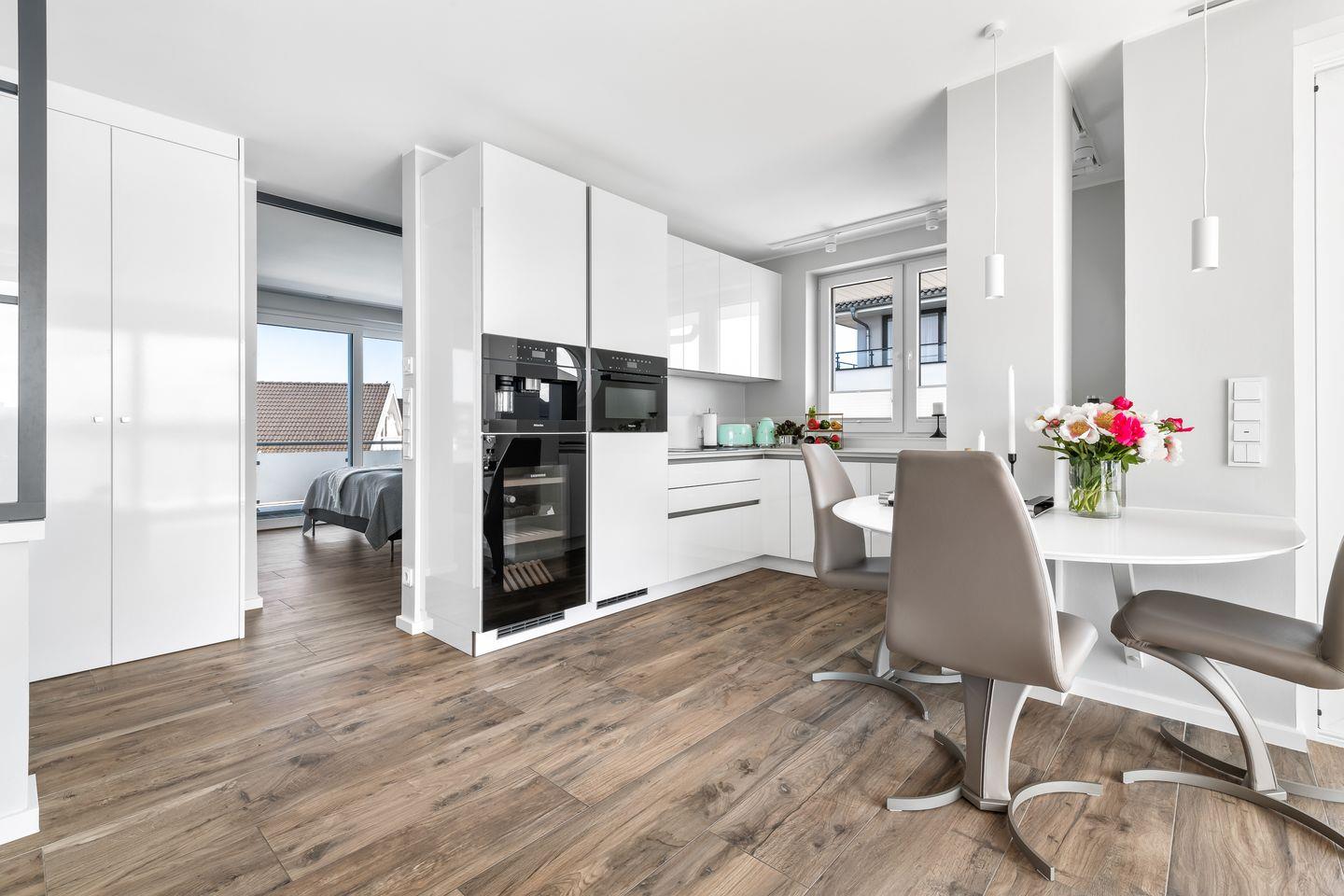 In der hochwertig ausgestatteten Küche steht Ihnen vom Topf- und Pfannenset bis hin zum Eierpikser oder Weinkühlschrank alles zur Verfügung und lässt keine Wünsche offen. Die moderne Küche geht direkt in das Wohn- und Esszimmer über, in dem ein großes gemütliches Sofa zum Relaxen einlädt. Die sonnige Terrasse mit Blick auf das Hafenbecken und der Schlei ist durch große Terassentüren direkt vom Wohnzimmer zu erreichen und bietet den perfekten Ort zum Grillen. Der Außenbereich ist jedoch nicht nur mit einem Grill ausgestattet, sondern lädt zusätzlich mit einer großen Sonneninsel, zwei Loungesesseln und einem Gartentisch mit Stühlen zum Sonnen und Genießen ein.