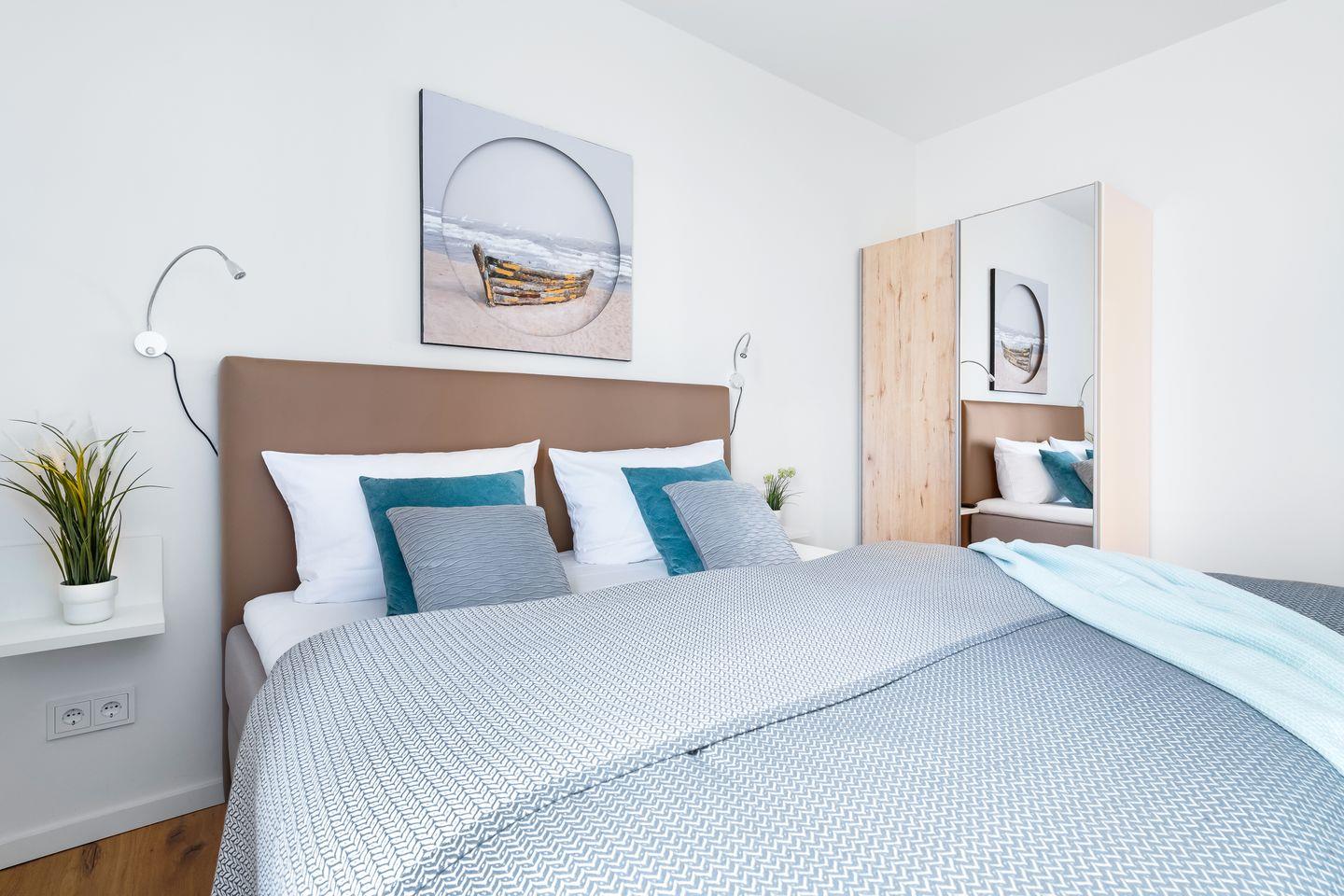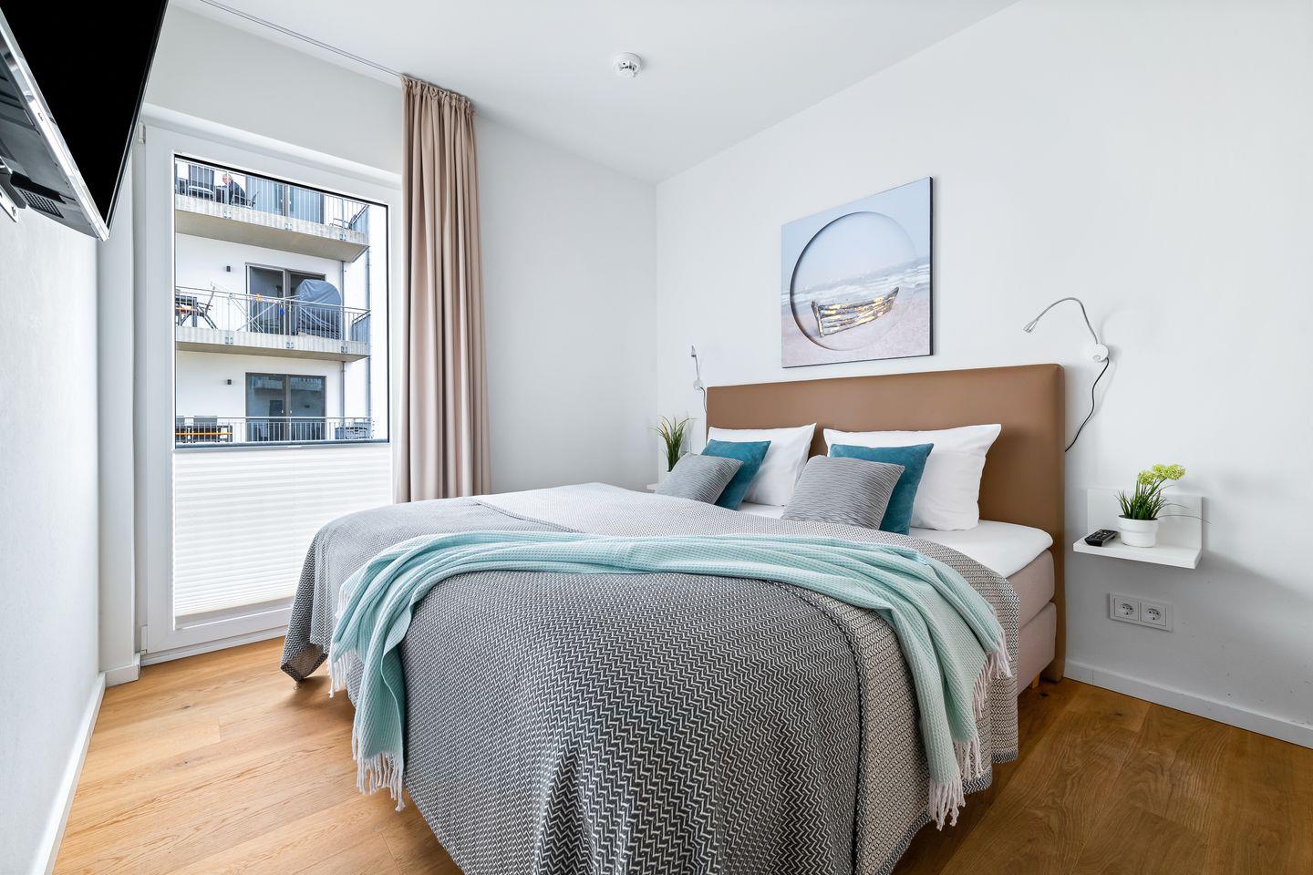 Das helle Schlafzimmer verfügt über ein hochwertiges Doppel-Boxspringbett, das für einen tiefen und erholsamen Schlaf sorgt. Das bodentiefe Fenster lässt sich durch Gardinen abdunkeln.